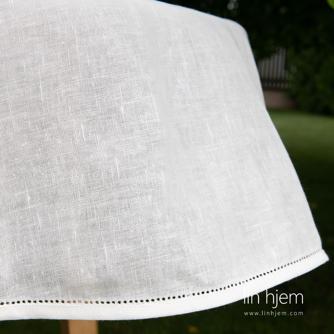 Rund (oval) hullmønstret hvit linduk. Melkehvitt 100% linstoff og en linje med hullmønster rundt gjør denne duken veldig subtil og elegant. Kombiner med enkelt brettet hvite servietter.