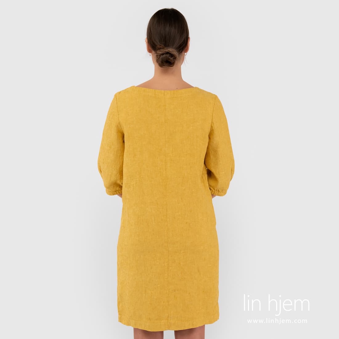 Kort gul linkjole. Produktets melange stoff ble vevd av lysegule og sennep farget lingarn. Nydelig kjole som passer til alle anledninger og hverdagen. Finnes størrelser fra 36 til 50!