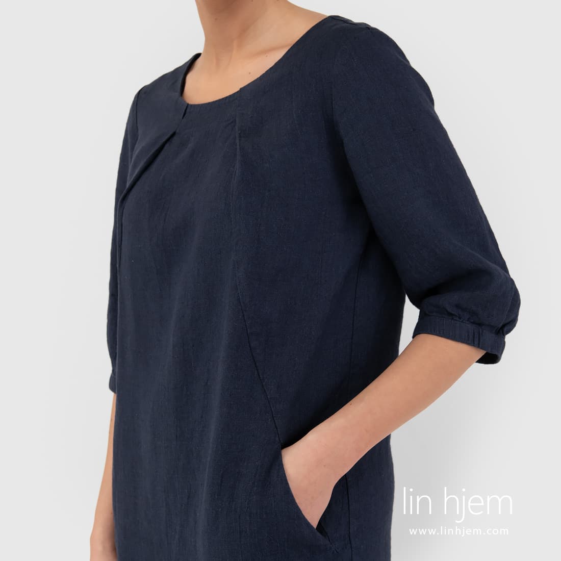 Kort mørkeblå linkjole. Subtil og elegant mørkeblå kjole som passer perfekt til alle anledninger. Laget av mykt og skånsomt 100% linstoff!