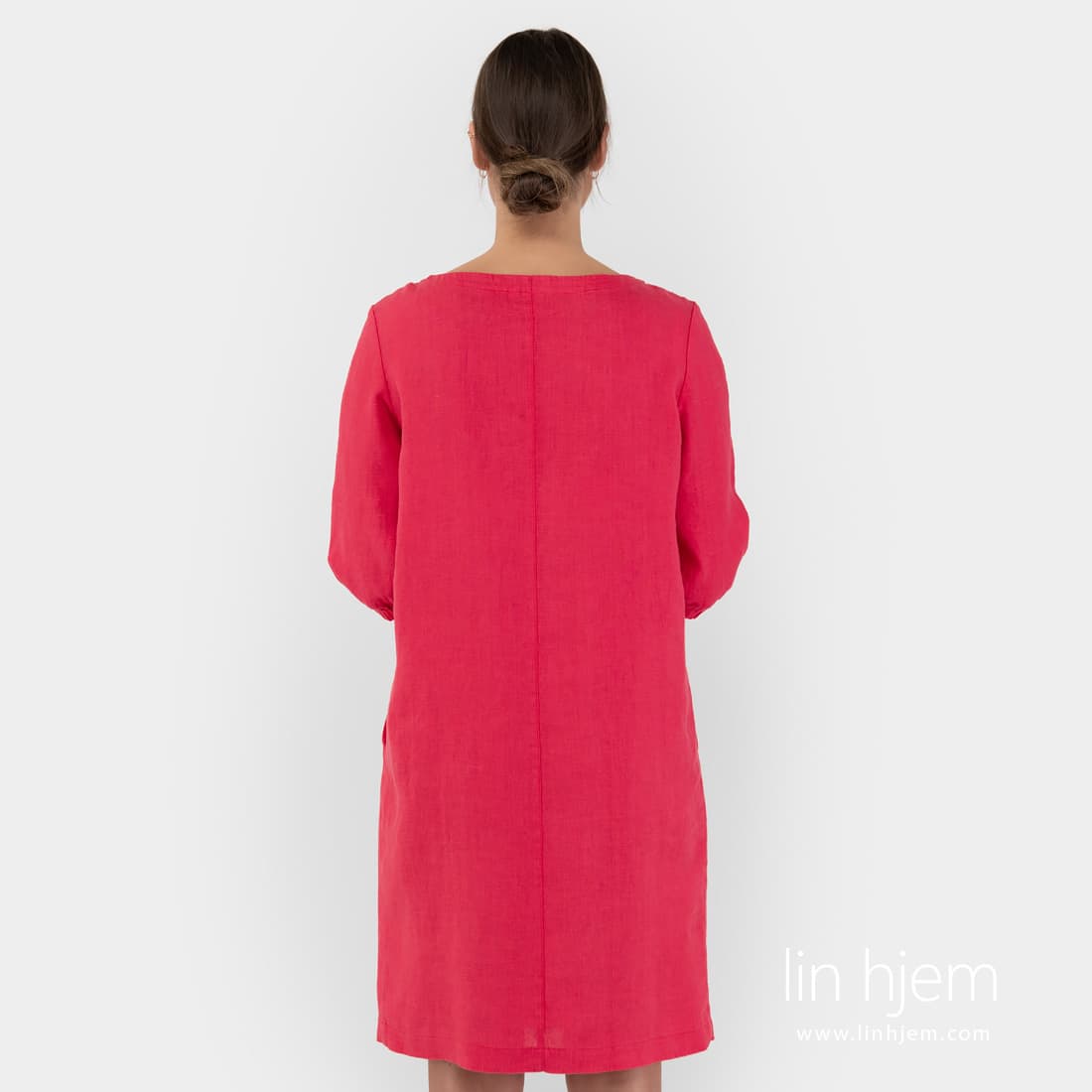 Kort rød linkjole. Denne kjolen av lys rød farge kan brukes som hverdags kjole som også passer for alle anledninger. Laget av 100% linstoff!
