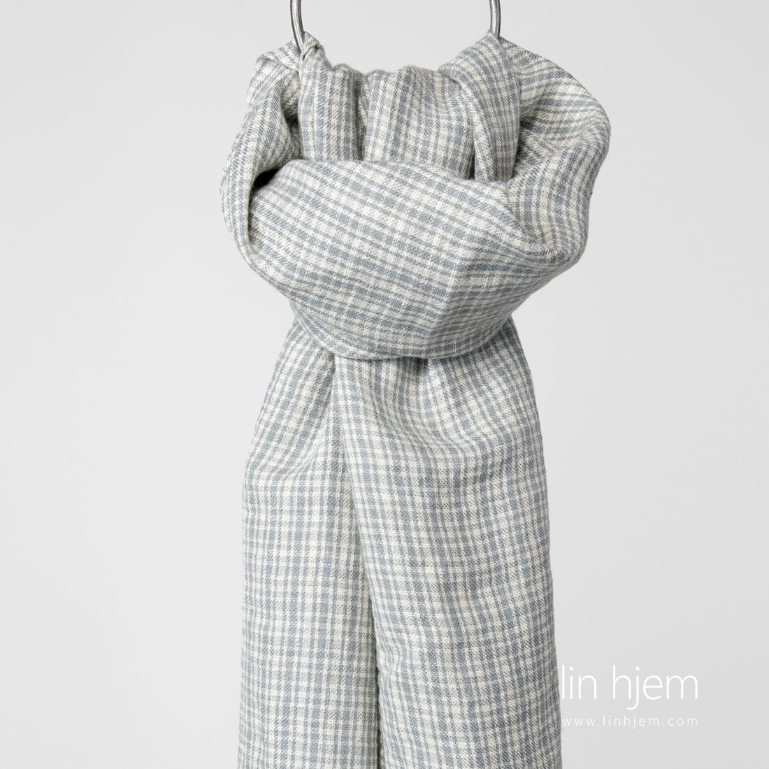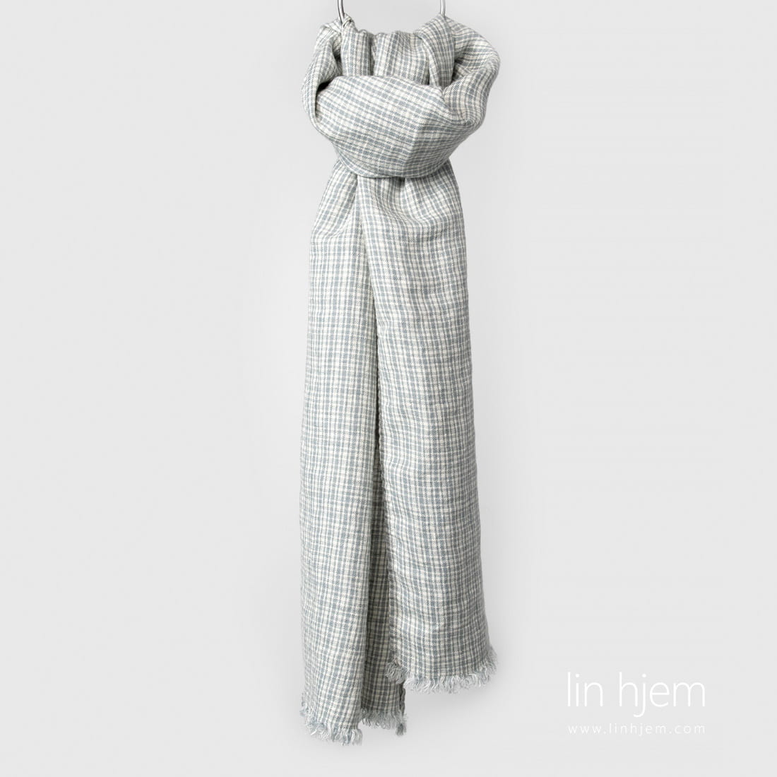 Grått sjal i lin-ull, rutete. Ruter ble vevd fra gulaktig grå lin og ull garn. Produktets stoff er spesielt vasket med ny teknologi som gjør dette sjalet mykt og skånsomt. Pyntet med frynser på kortsidene. Kan være en fin gave til venner!