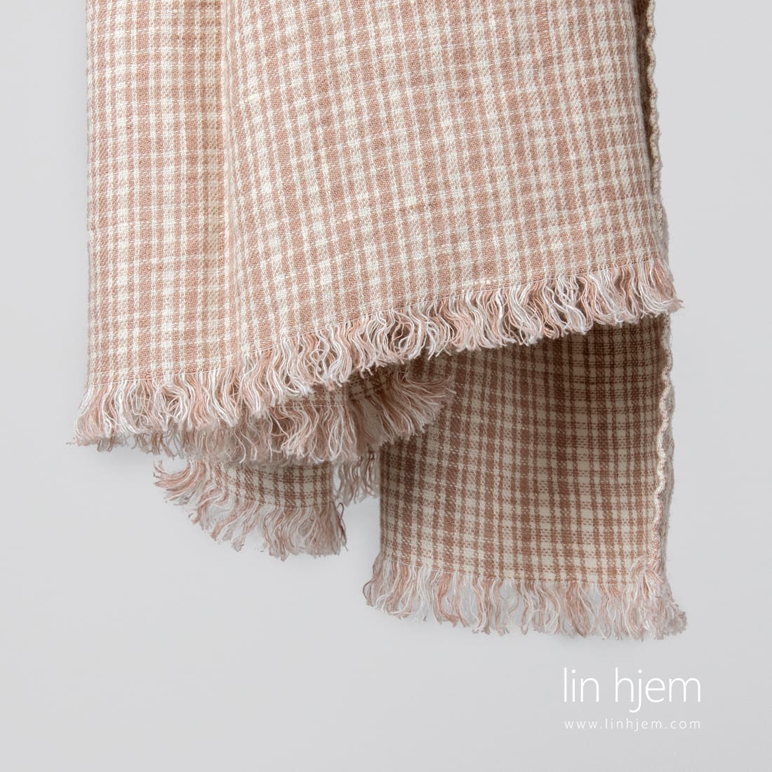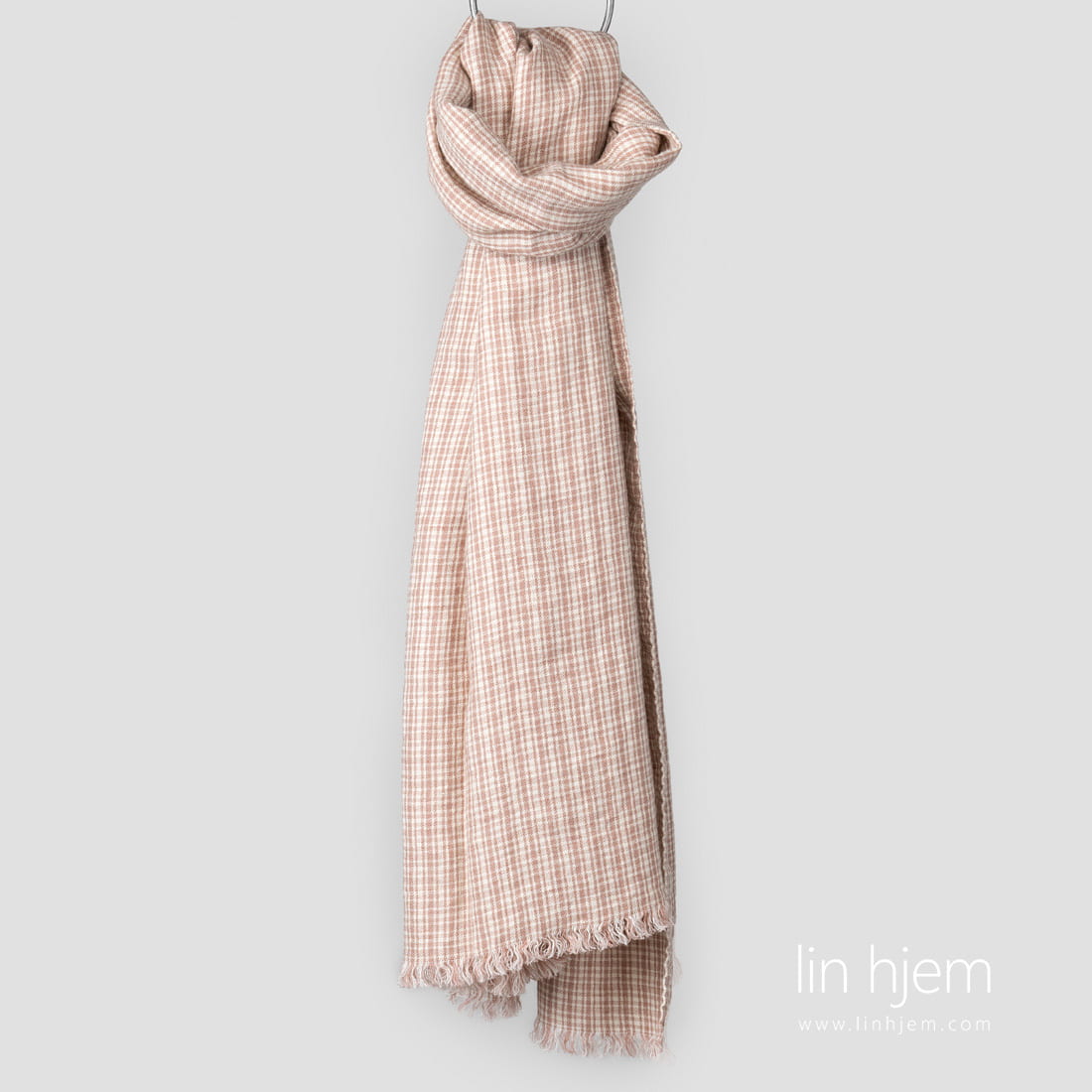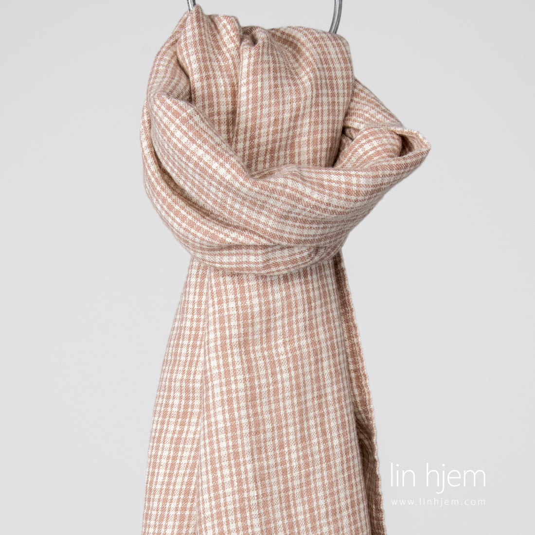 Hvitt/brunt sjal i lin-ull, rutete. Produktets stoff ble vevd fra gulaktig hvite og lysebrune lin og ull garn. Spesielt vasket stoff er veldig mykt, skånsomt. Kortsidene er pyntet med 2cm lange frynser. Dette sjalet passer for både kvinner og menn. Kan også være en nydelig gave!