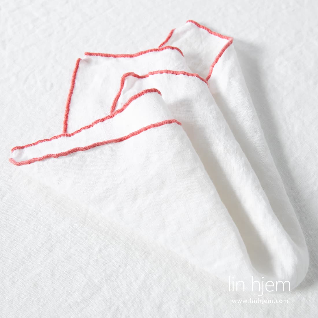 • Hvit linserviett med rødaktig kant fra ARVO kolleksjon.
