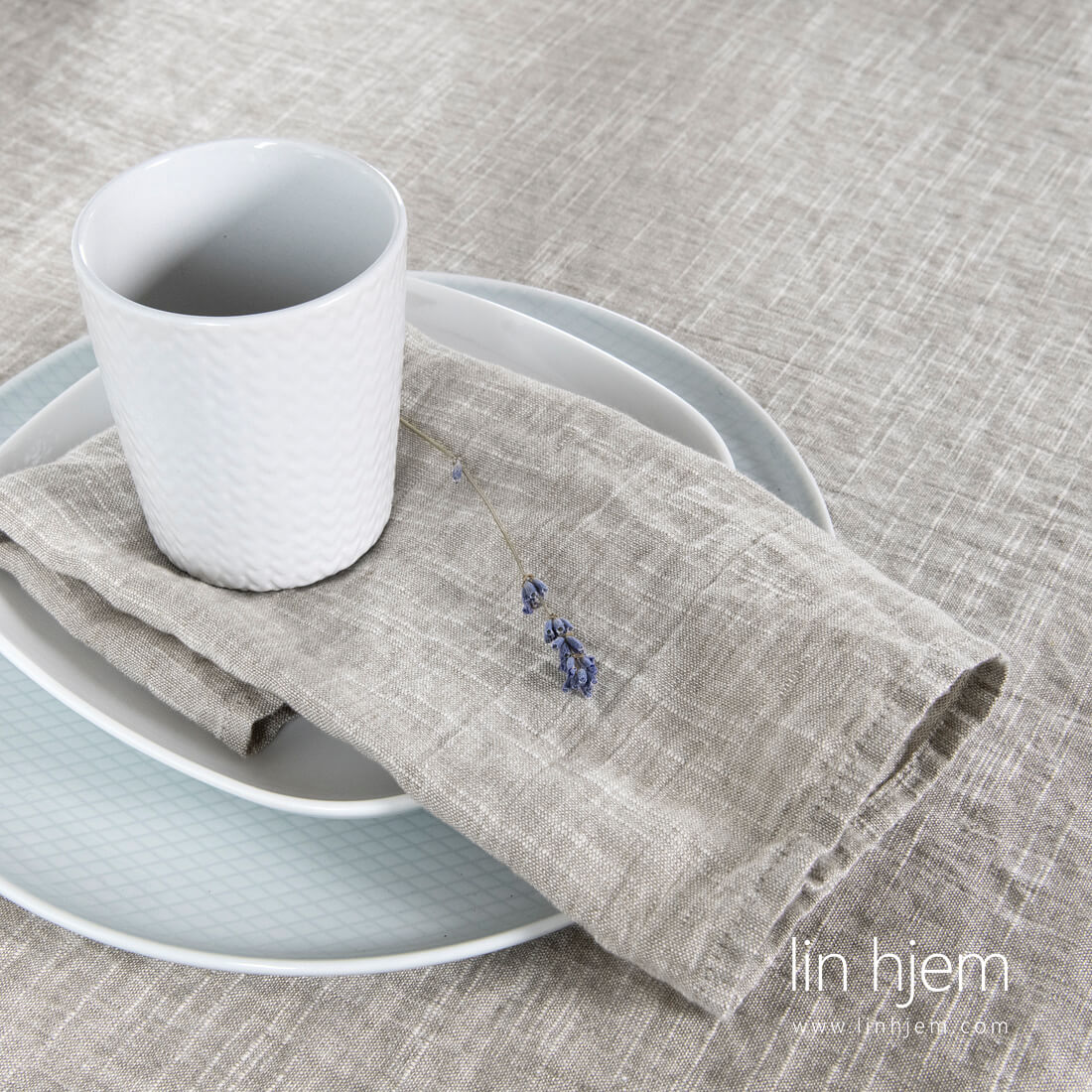 Vasket lysegrå lin-bomull serviett med tilfeldige striper av bomullsgarn og spesielle fortykninger. Spesielt vasket produkt som er veldig mykt og skånsomt. Trenges ikke å stryke. Nøytrale med ikke kjedelige servietter som passer perfekt til å dekorere spisebordet deres. Kombiner med ulike farger duker.