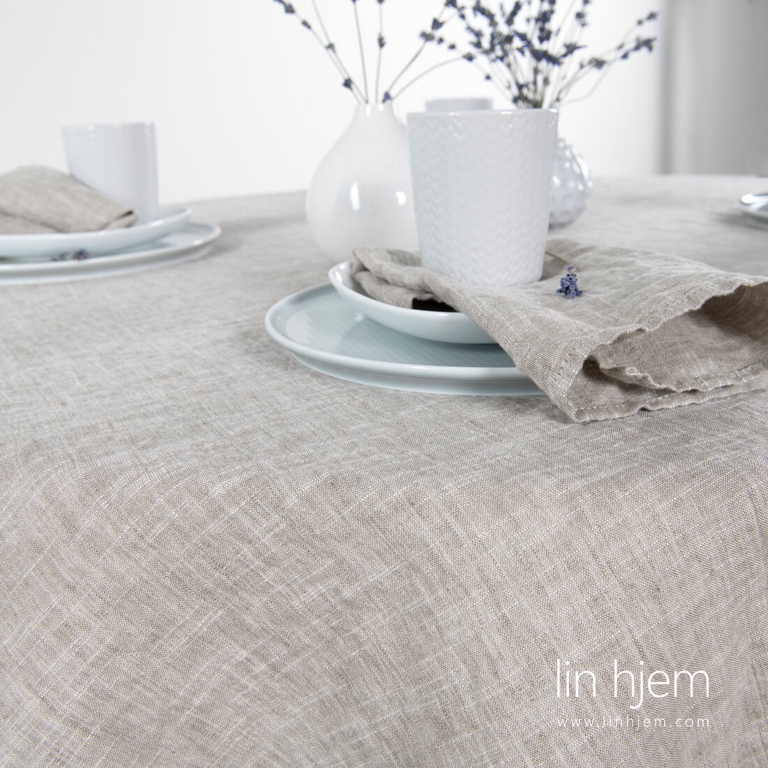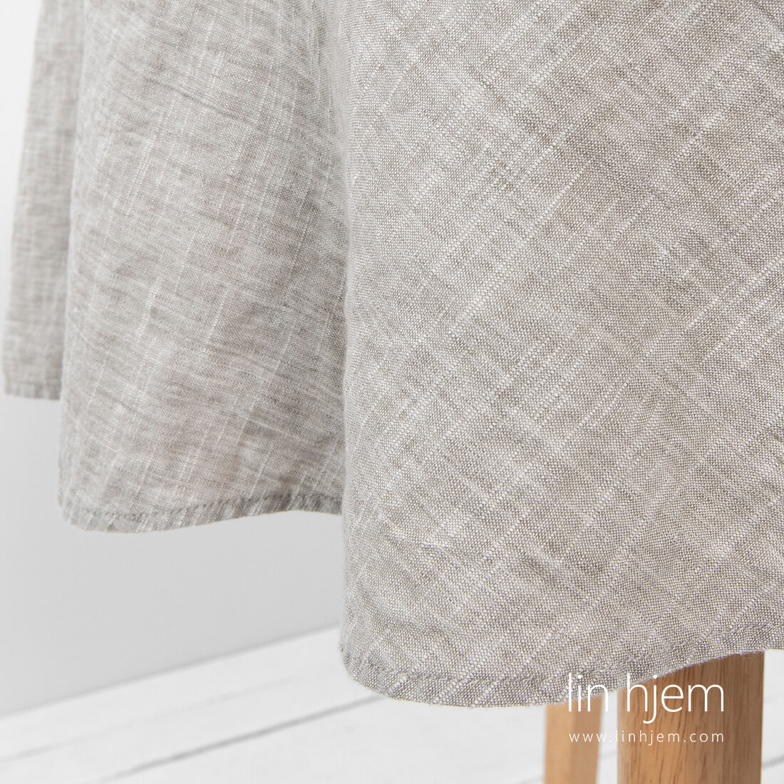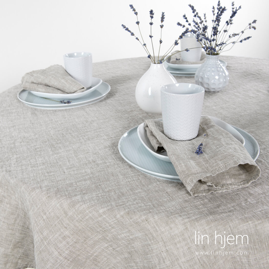 Vasket rund lin-bomull duk i lys grå farge. Produktets stoff laget av brunaktige grå og hvite lin og bomull garn med spesielle fortykninger som skaper et mønster av tilfeldige striper. Varm, myk farge, etter spesiell vask stoffet er mye mykere og trenges ikke å stryke. For festlig innredning anbefaler vi å kjøpe mørkegrå eller hvite servietter av samme stoff med striper.