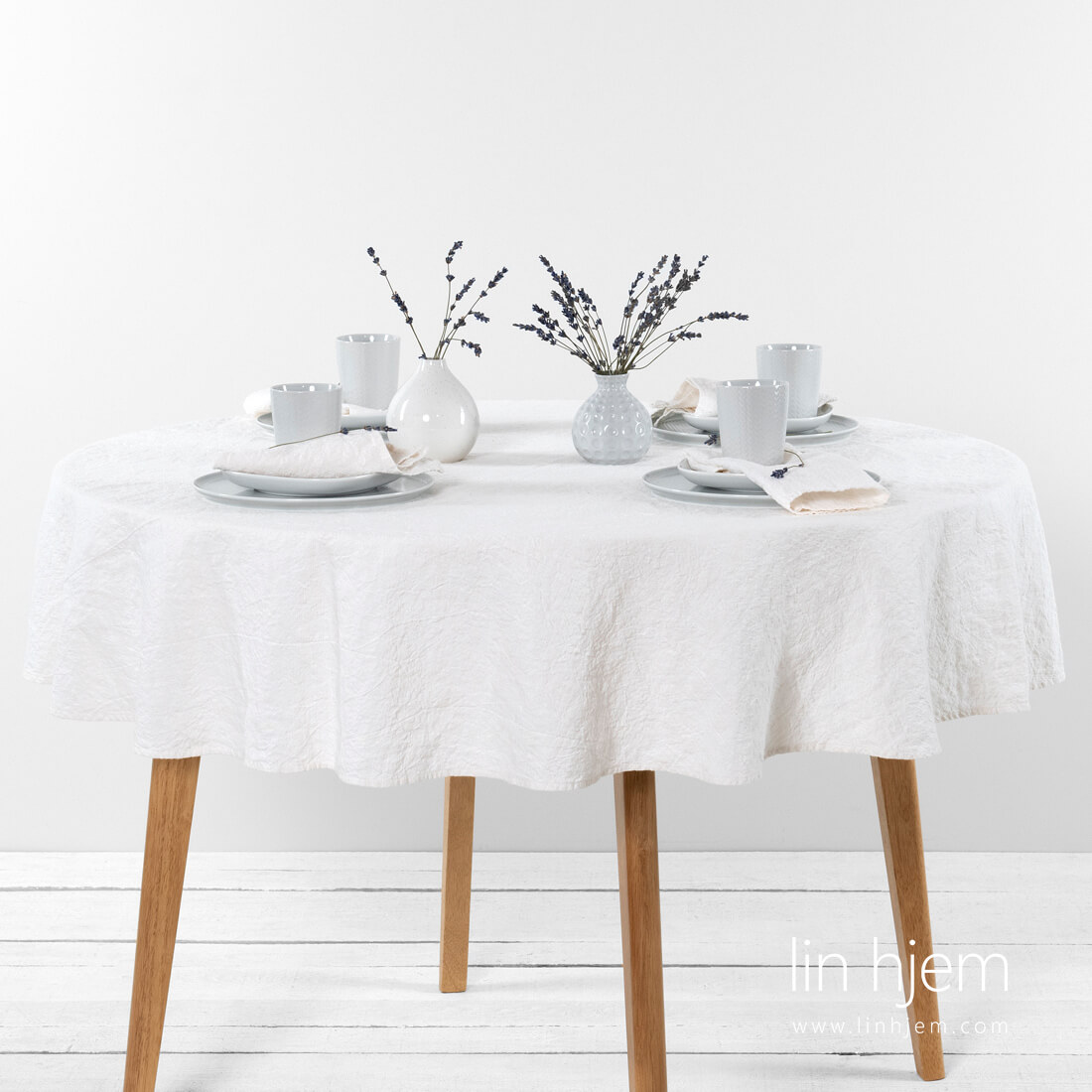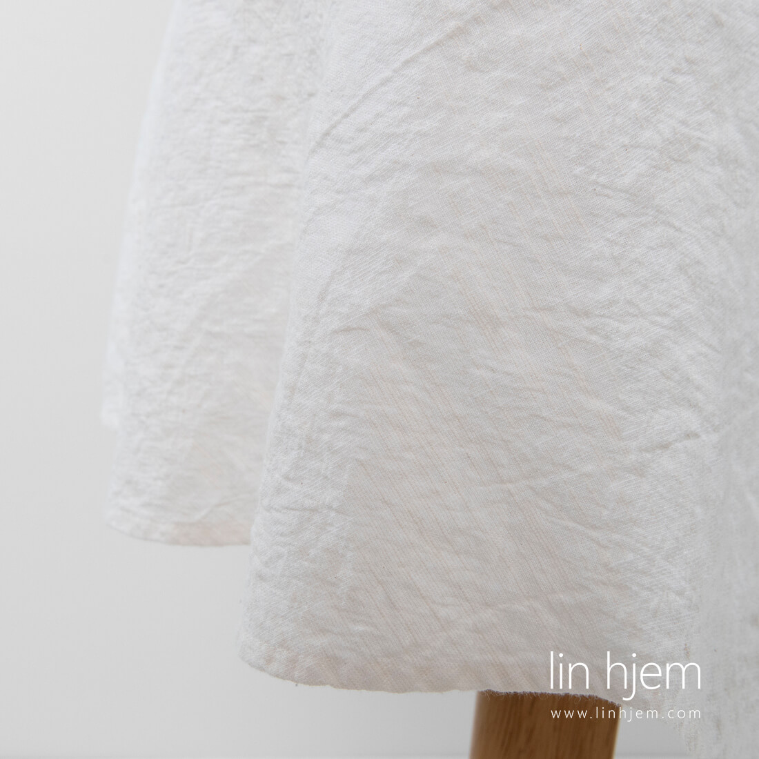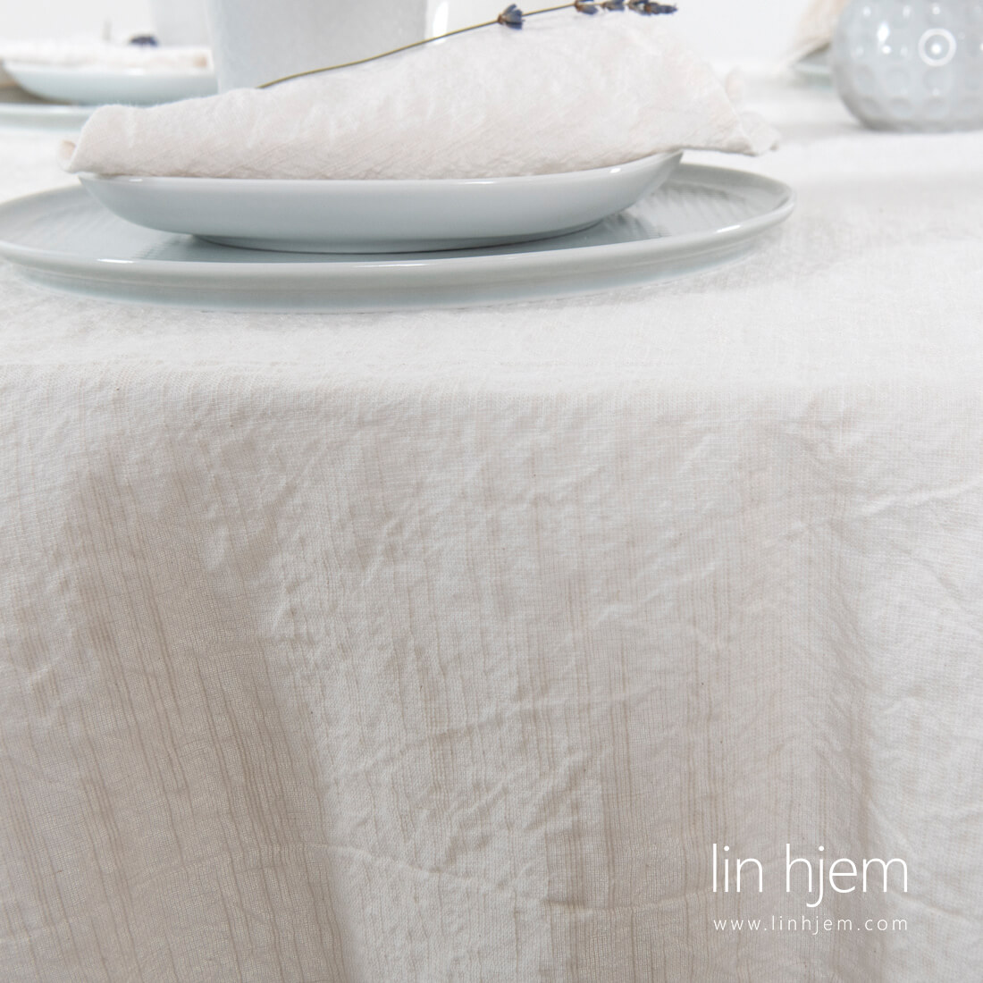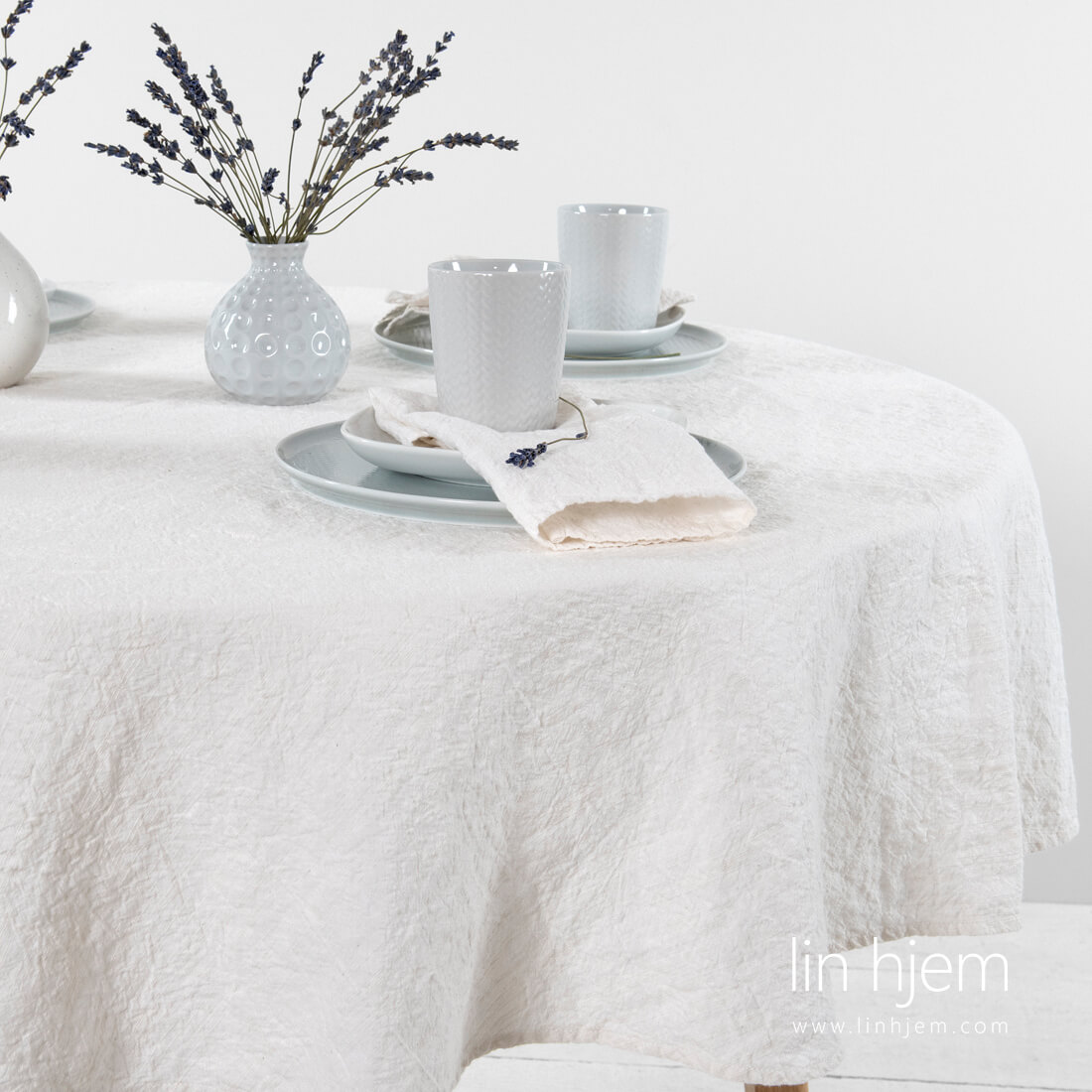 Rund melkehvit lin-bomull duk, vasket. Dette stoffet er lagt av hvit lin og bomull garn. Det er striper spredt i stoffet tilfeldig. Det ble brukt en spesiell metode å vaske duken på som gjør denne duken ekstremt myk og skånsom. Størrelser varierer fra 200cm bredde til 260 bredde. Det finnes også servietter av samme stoff som passer perfekt til denne duken.