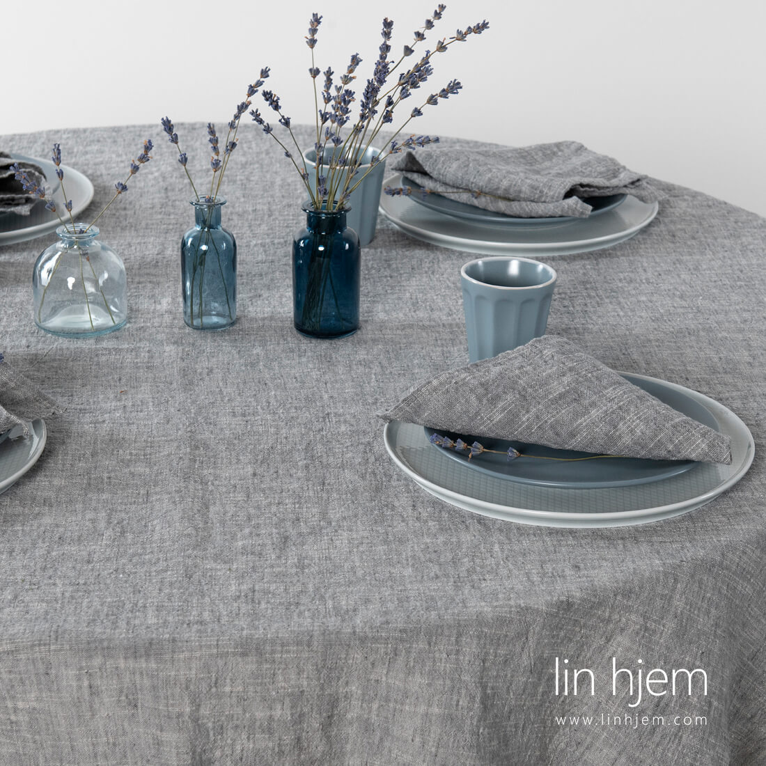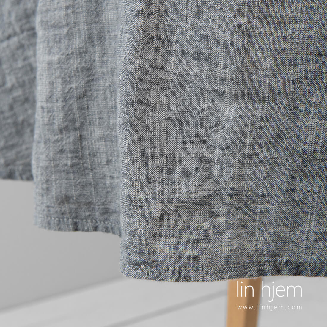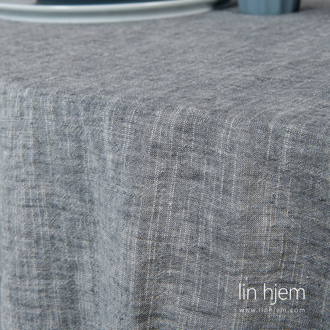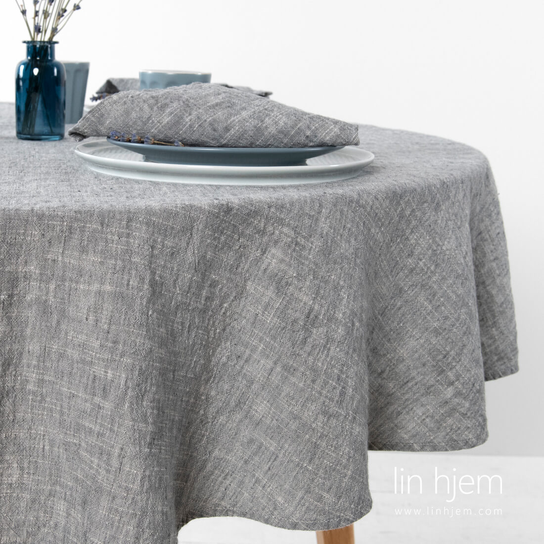 Rund mørkegrå duk i vasket lin-bomull. Dette melange stoffet ble vevd fra mørkegrå og hvite lin og bomull garn med spesielle fortykninger. Produktet er vasket med en spesiell teknologi for å gjøre stoffet mykt og skånsomt. Det er ikke nødvending å stryke produktet. Vi tilbyr også en duk med diameter på 260 cm! Og selvfølgelig matchende servietter.