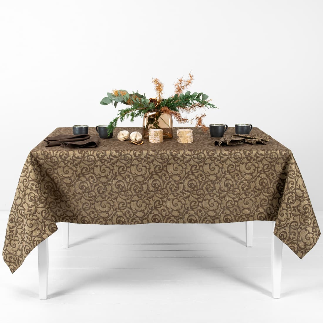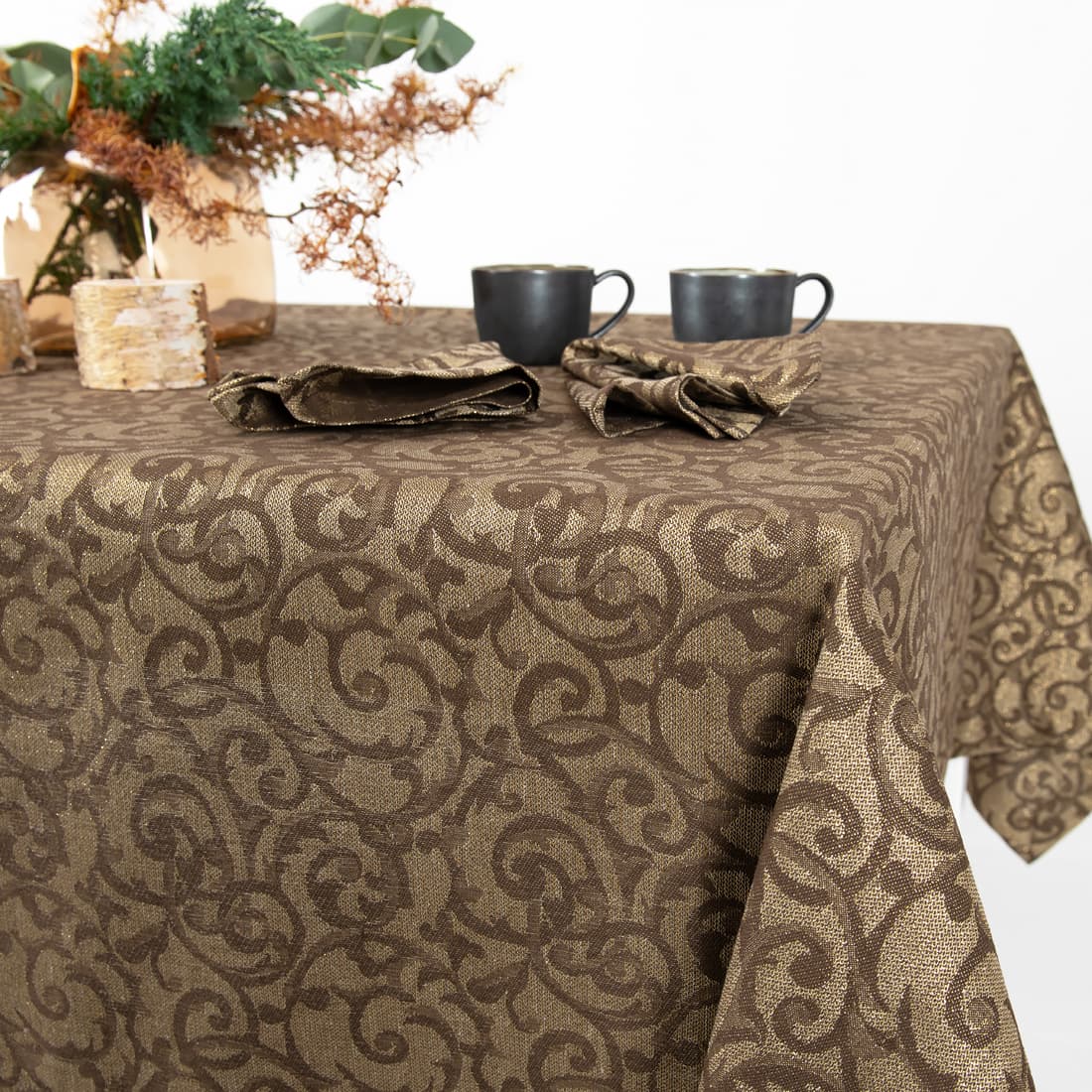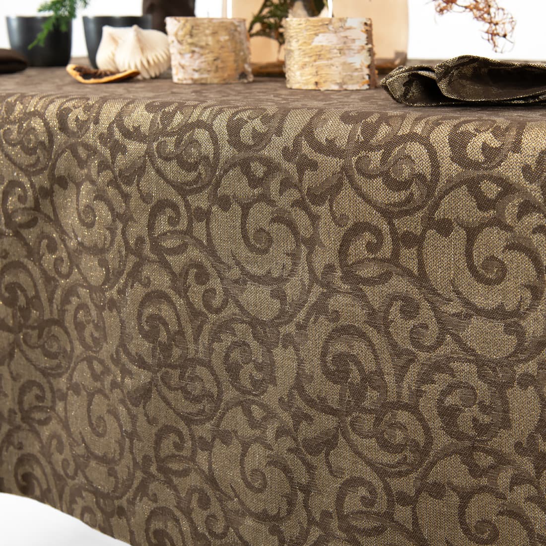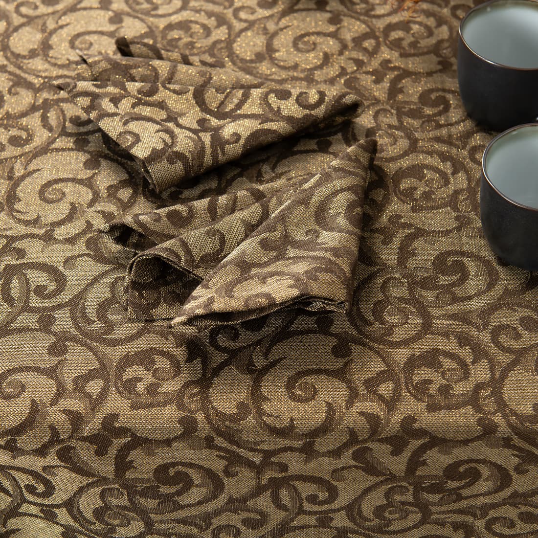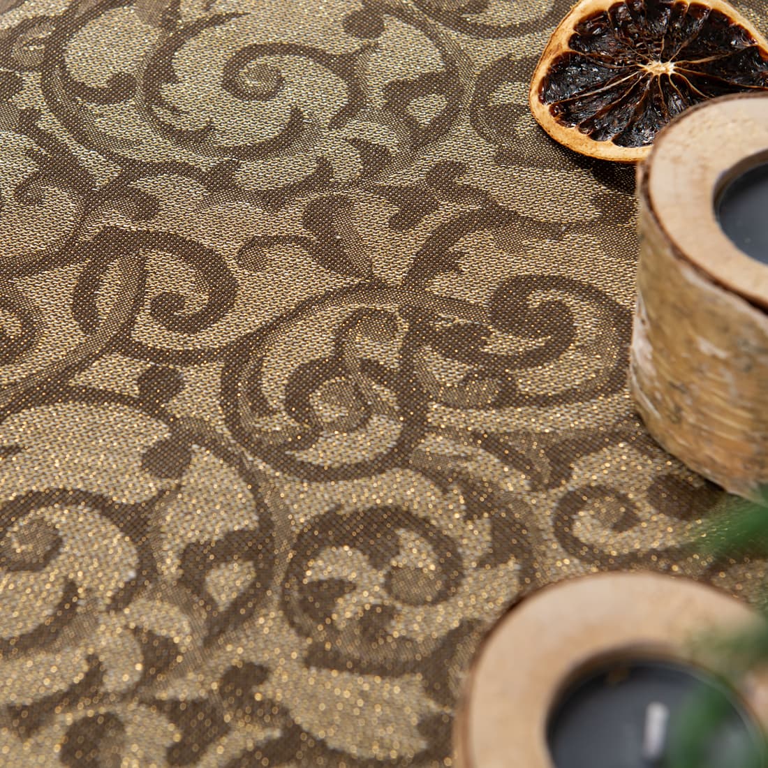 - Farge: vevd av mørkebrun bomull, naturlig farge (ufarget, brungrå) lin og gull polyestergarn