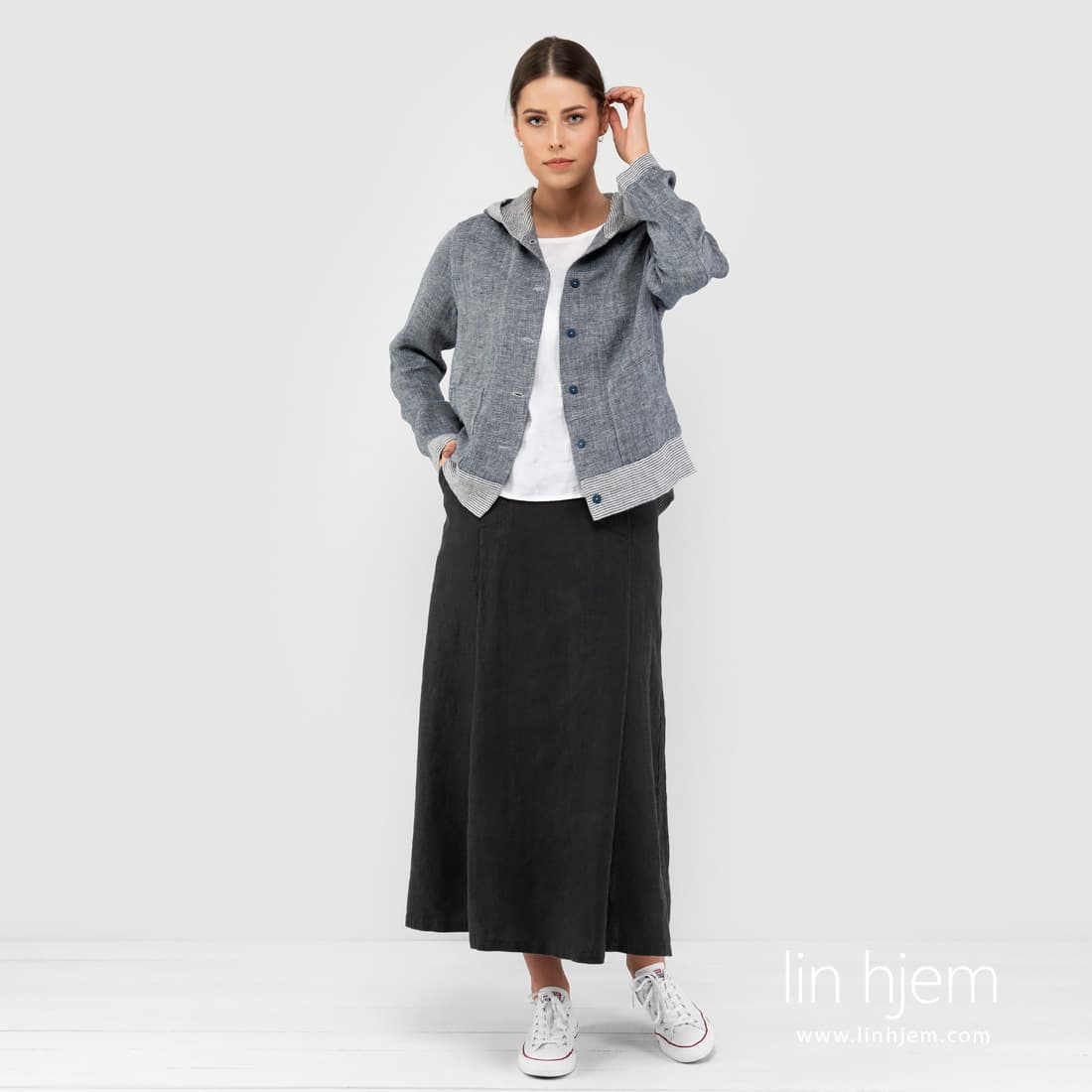 Lang mørkegrått lin skjørt - løs plagg som er uerstattelig om sommer: begrenser ikke bevegelser, lar huden puste. I dette produktet har vi kombinert elegante, delikate detaljer, praktiskte farger, naturlig stoff og komfortabel sporty stil. Du kan kombinere dette skjørtet med lysegrå melange jakken AZORA.
