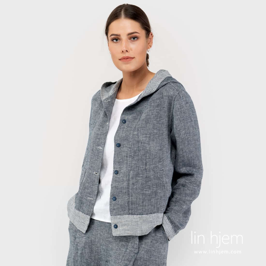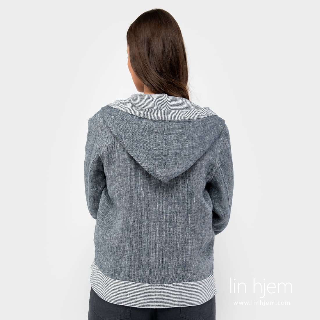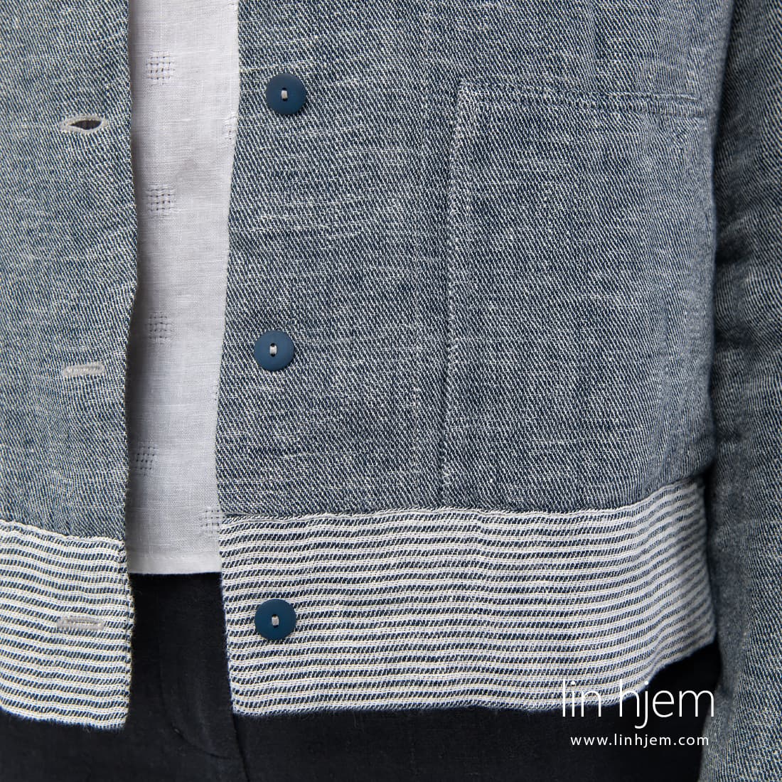 Kort sport stil linjakke. Laget av tosidig stoff : den ene siden er vevd i diagonale striper, den andre siden med horisontale striper. Stoffet ble vevd av hvite, gulaktig hvite og blå-svarte garn. Detaljene i jakken er også laget av begge sider av stoffet: stripete mansjetter, bunnen av jakken, hettekanten og innsiden.