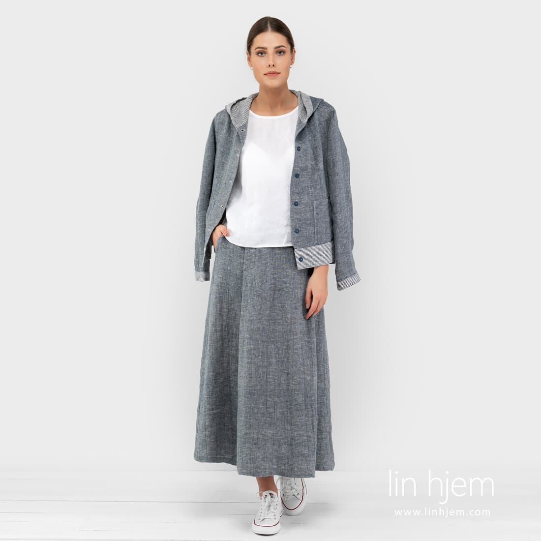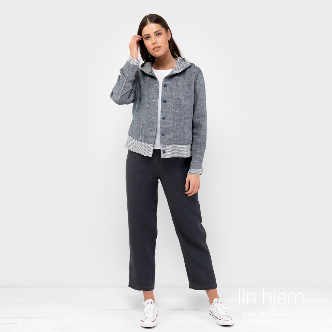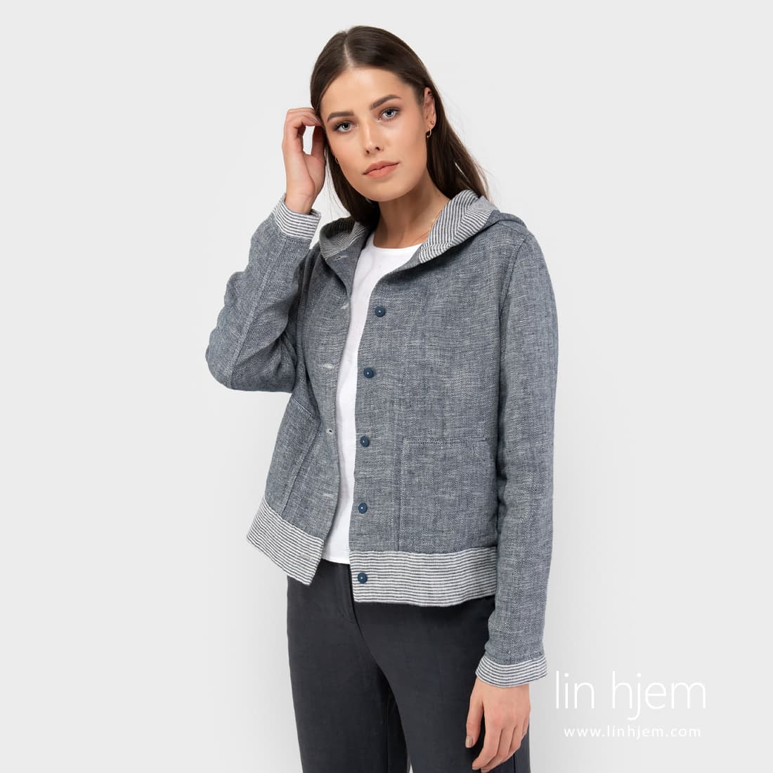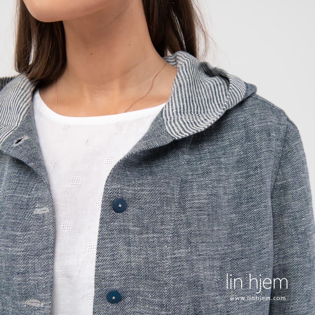 Kort sport stil linjakke. Laget av tosidig stoff : den ene siden er vevd i diagonale striper, den andre siden med horisontale striper. Stoffet ble vevd av hvite, gulaktig hvite og blå-svarte garn. Detaljene i jakken er også laget av begge sider av stoffet: stripete mansjetter, bunnen av jakken, hettekanten og innsiden.