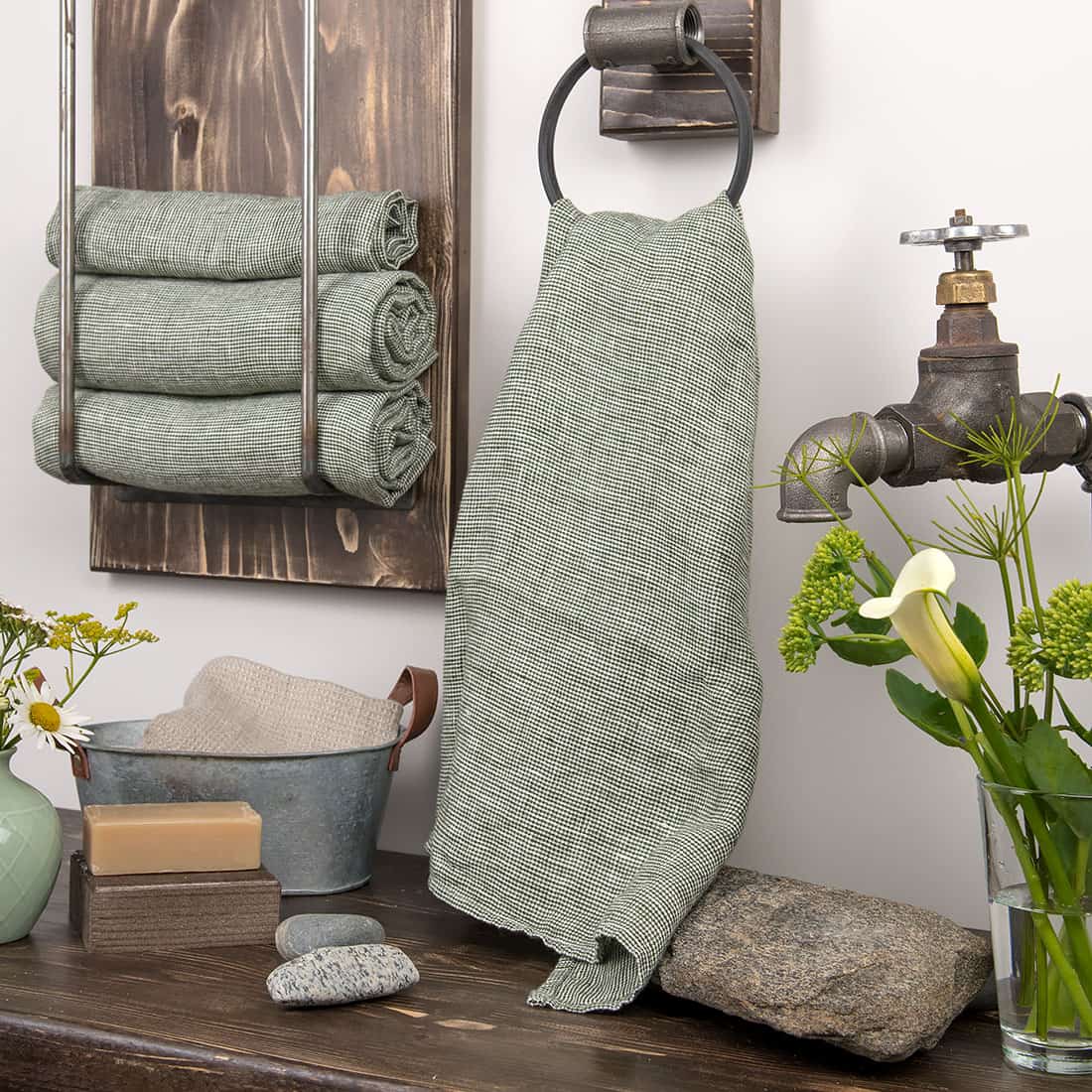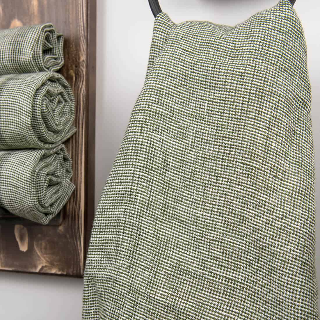Naturlig badehndkle i lin med grnne (mose) og hvite ruter. Det er laget av spesialvasket lin, s dette hndkleet er for de som setter pris p mykhet og glatthet. Dette hndkleet i unik vev kan bli en interessant interirdetalj p badet ditt.