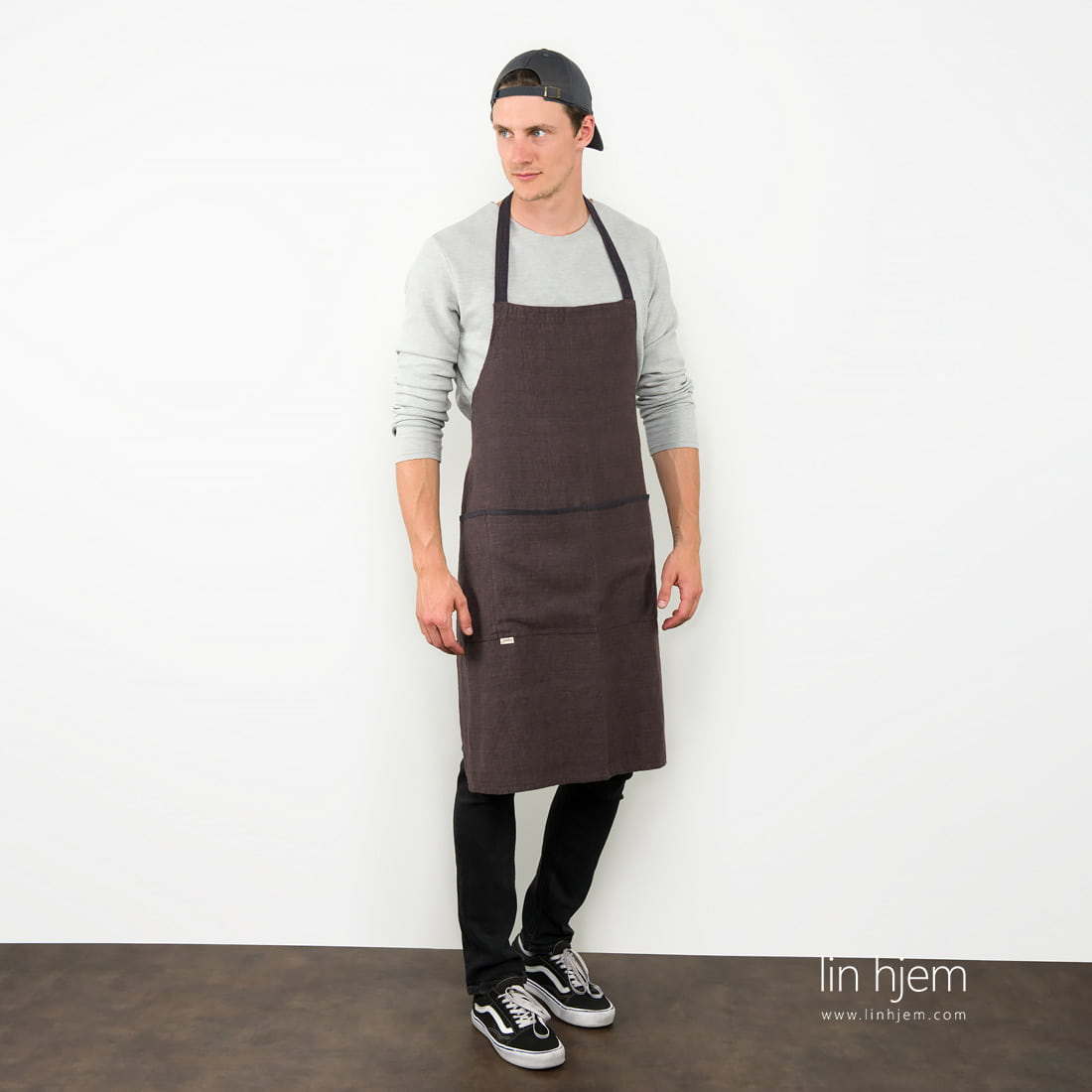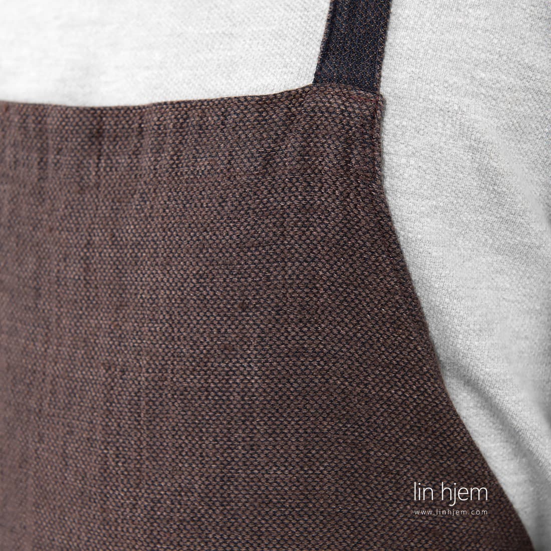 Mørkebrunt linforkle av mønstret lin-bomull stoff som ble vevd fra mørkebrune og svarte garn. Produktets stoffet ble spesielt vasket som gir dette produktet mykhet og skånsomhet, litt ujevn overflate.
