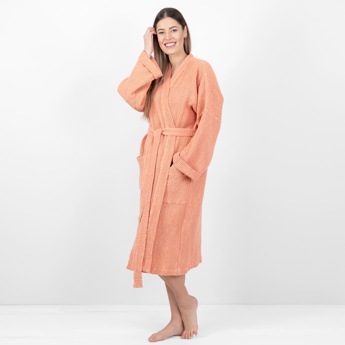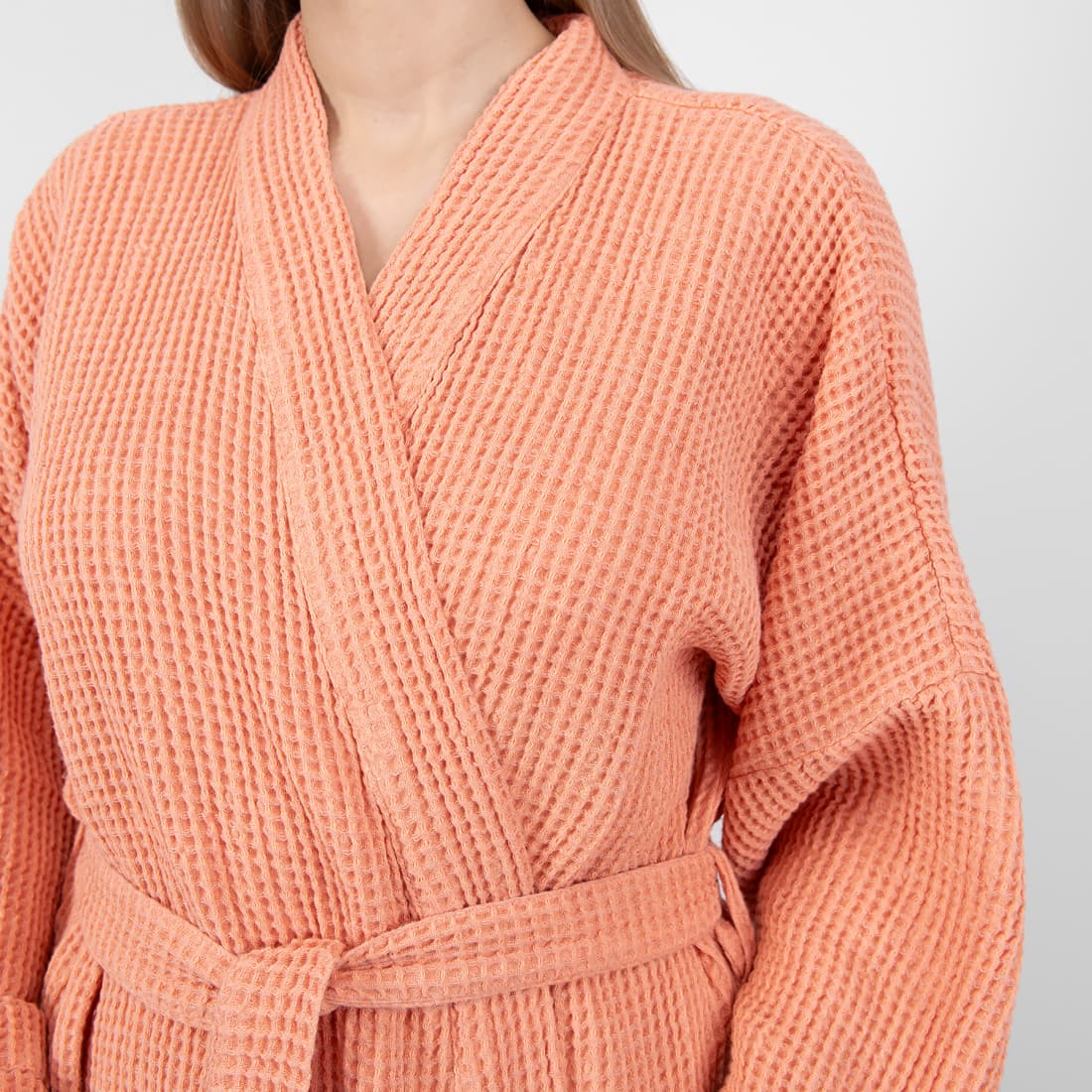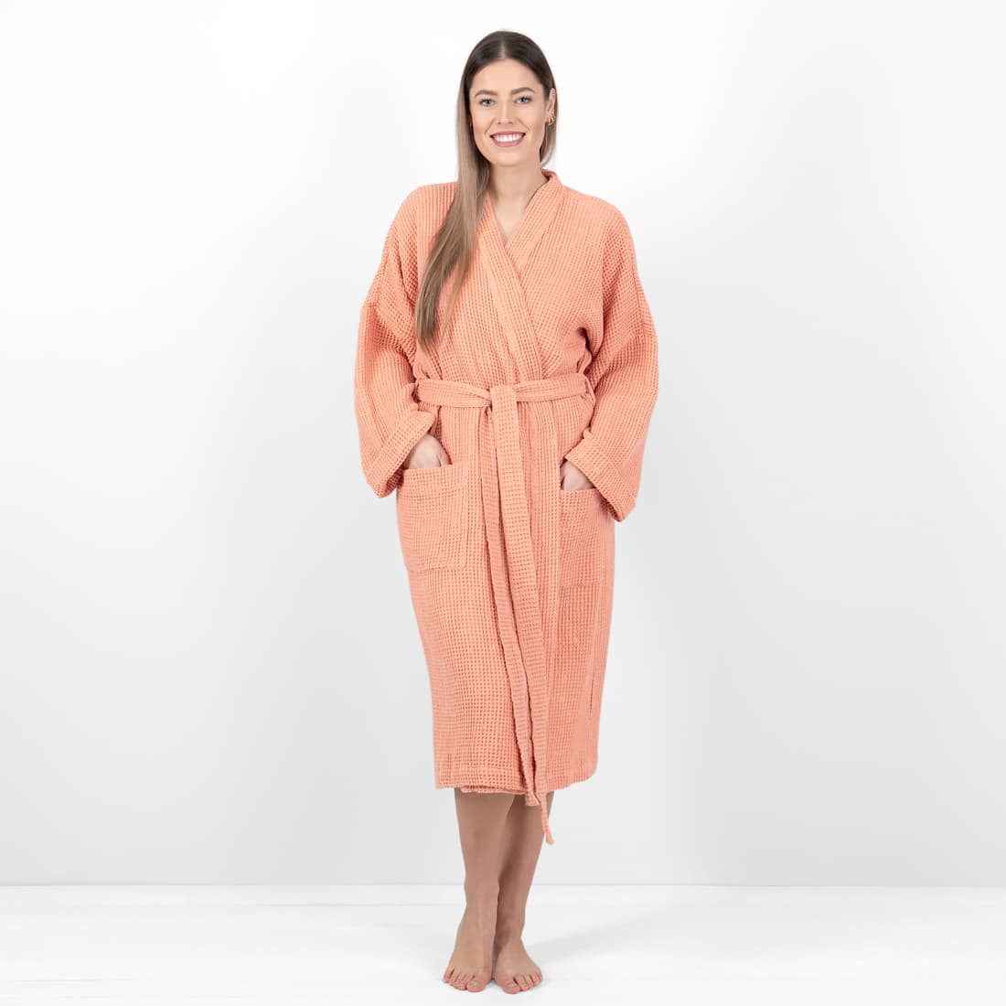 - Detaljer: bundet med et belte, med lommer foran