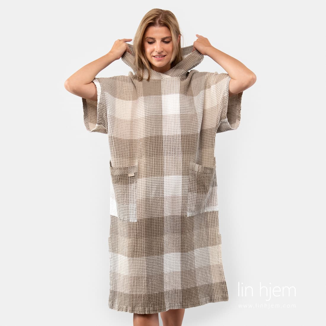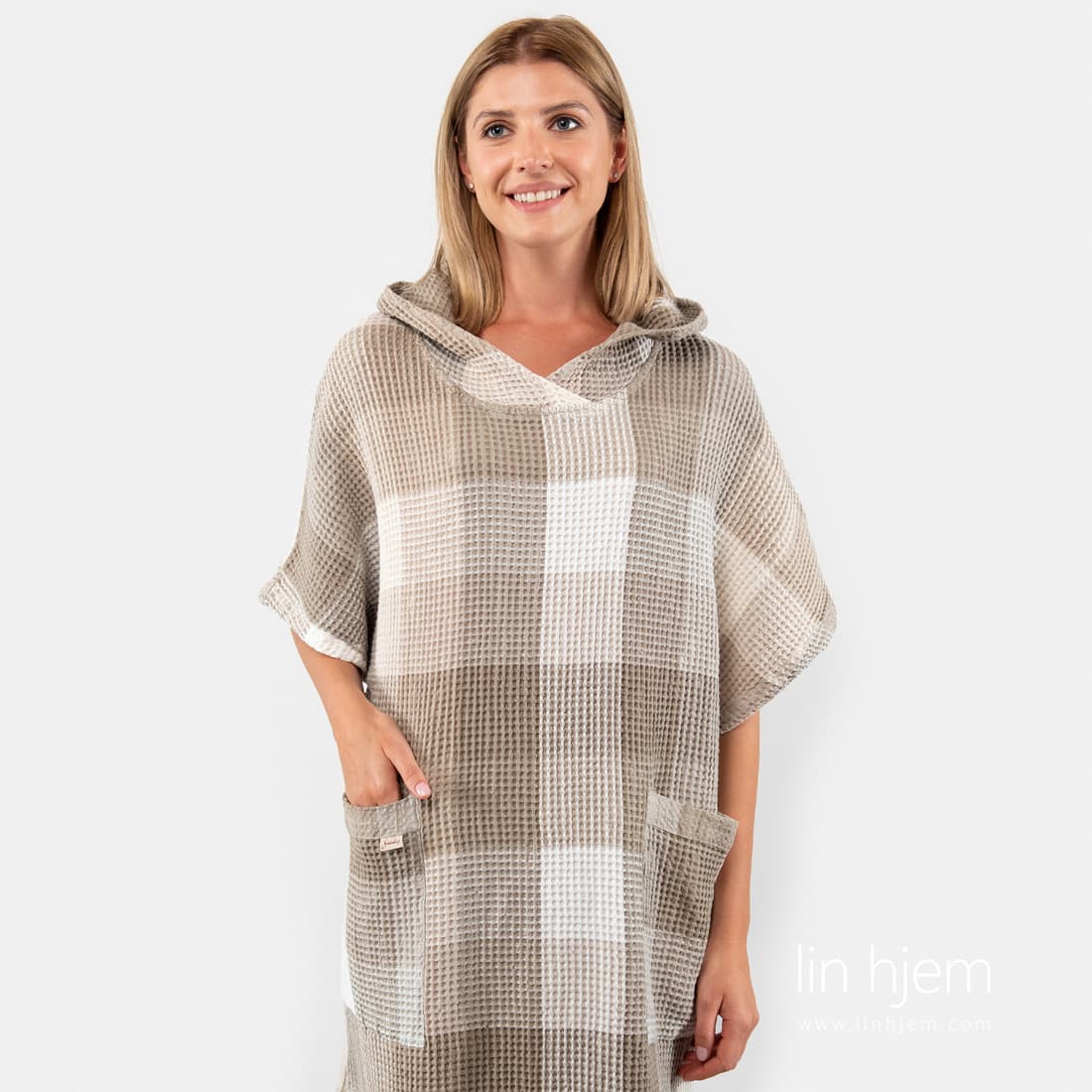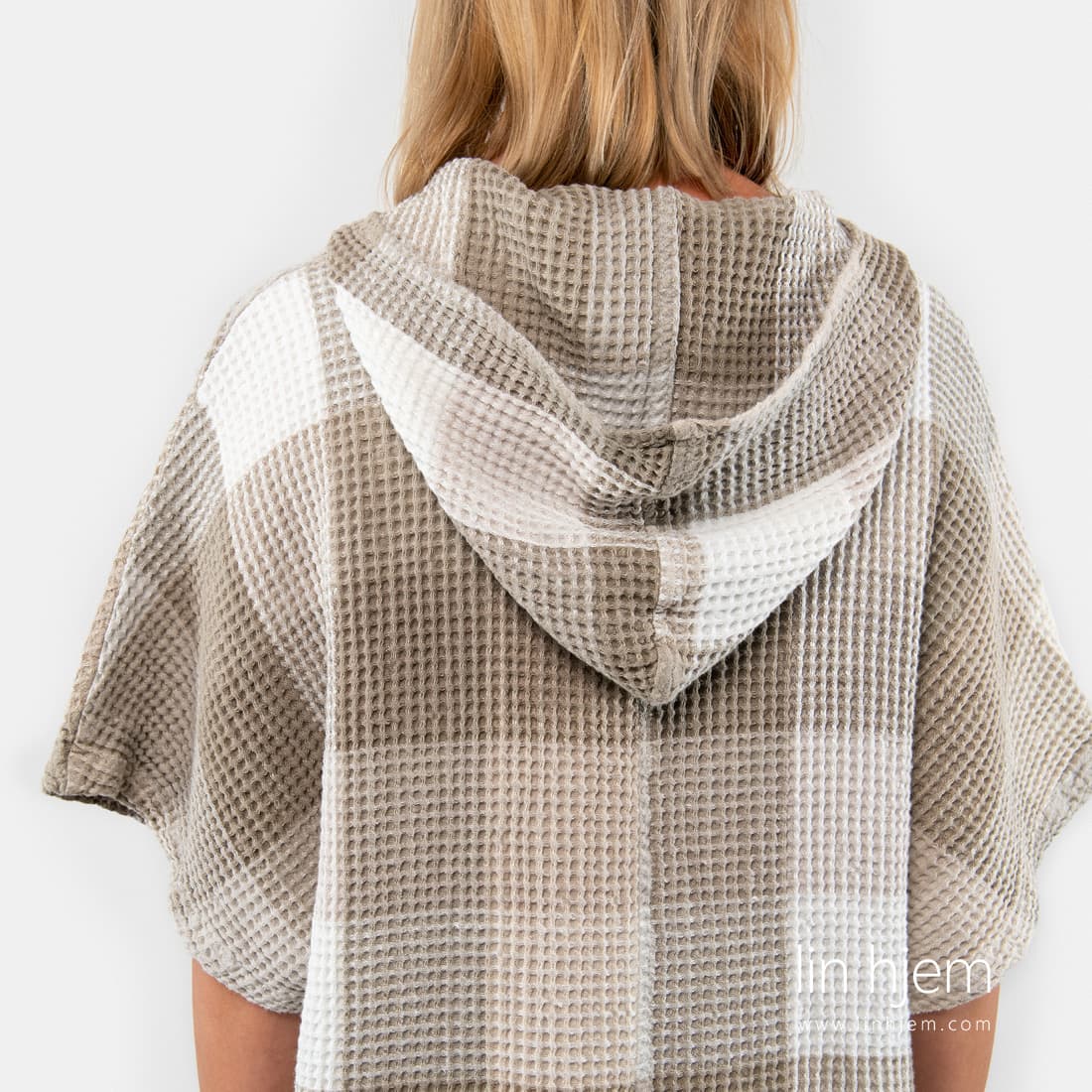 Halvlin rutete grå poncho laget av brunaktig grå og melkehvite garn. Laget av "vaffel" mønstret stoff. Spesielt vasket for å gjøre produktet mykt, skånsomt og behagelig mot huden. Ponchoen er laget med hette, lommer, spalter på sidene og korte ermer. Finnes i 2 størrelser, for ham og henne. Gjem deg fra solen med denne fine ponchoen!