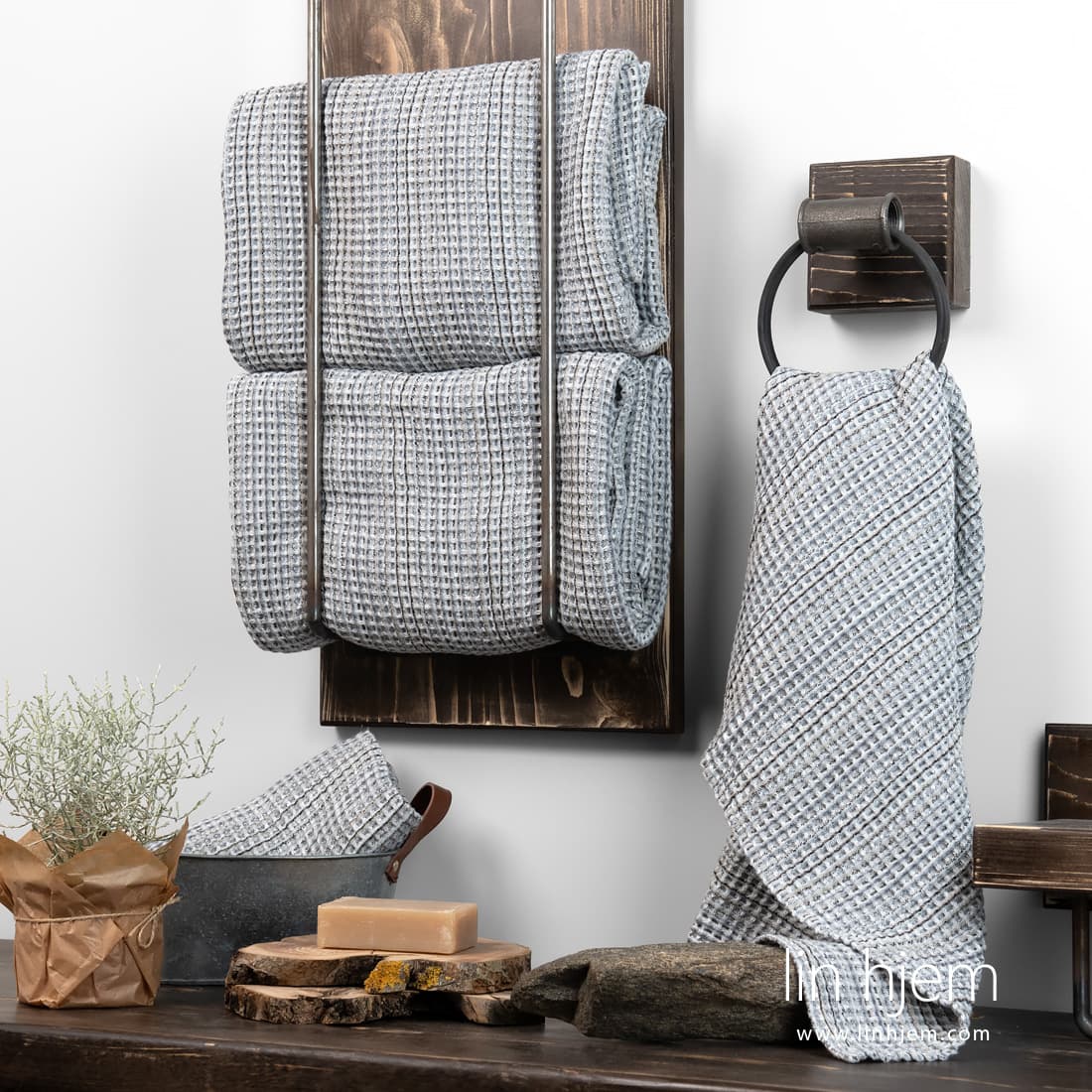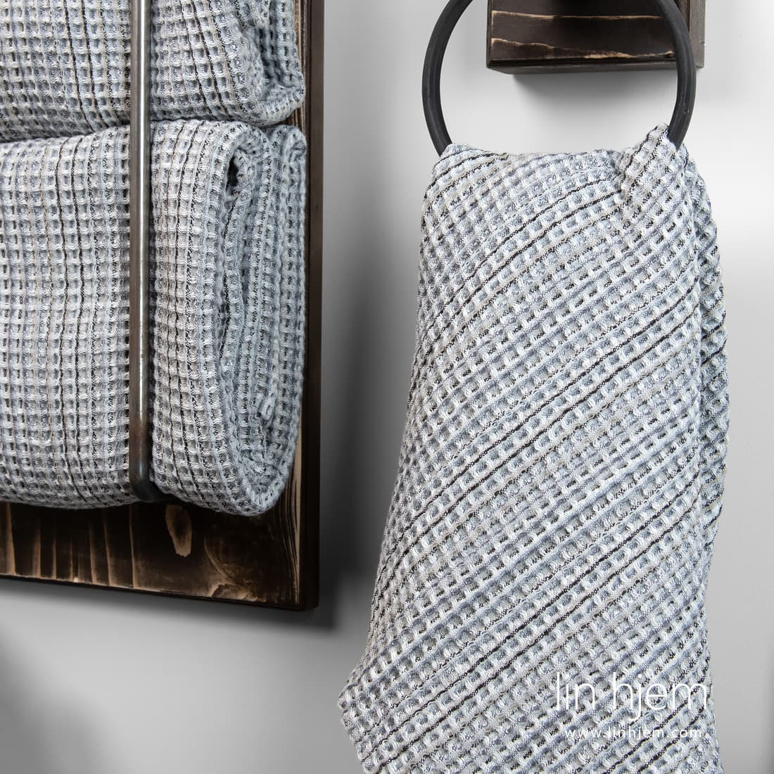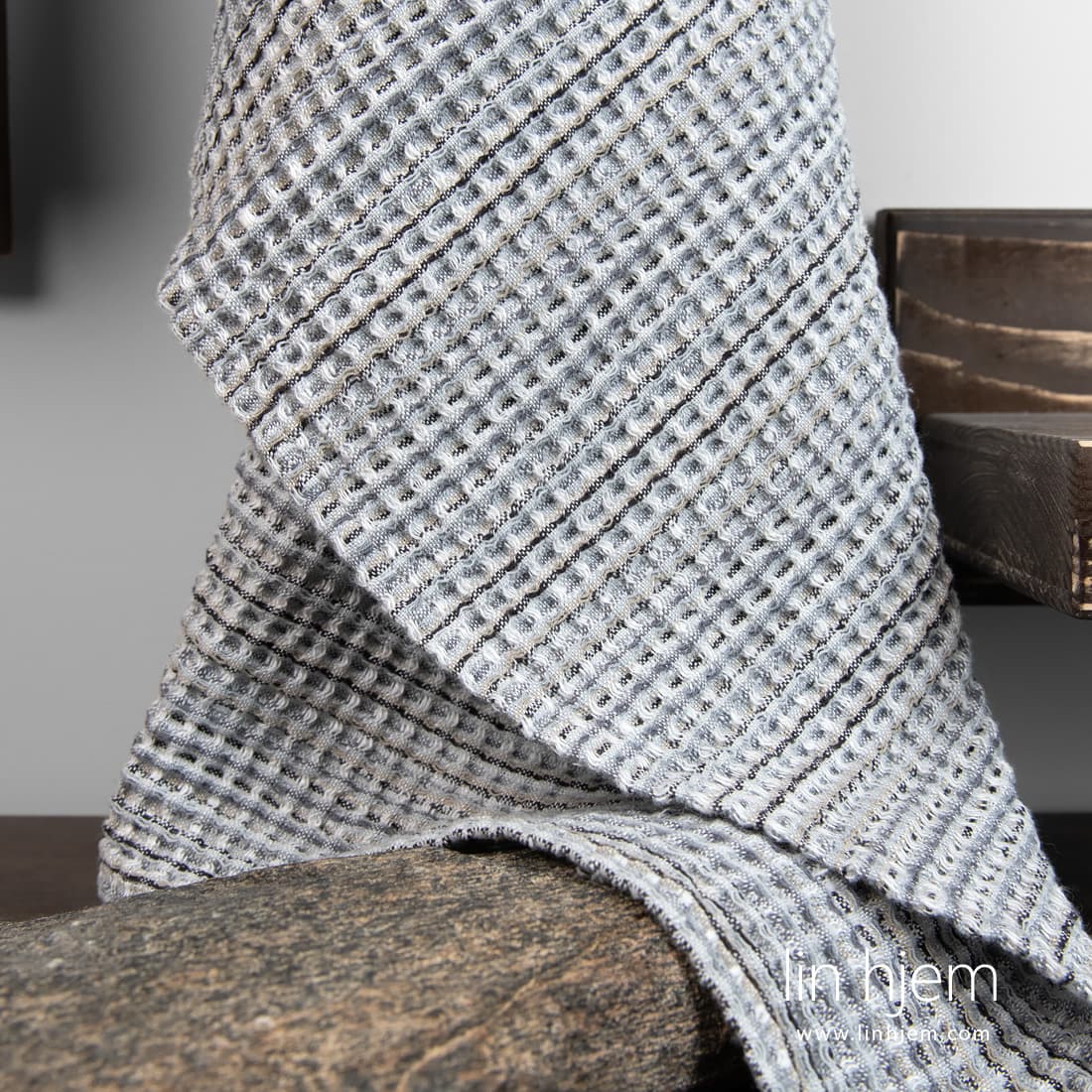 BINGO grått håndkle. Laget av vaffel lin-bomulls stoff som ble vevd av flere nyanser av blåaktig grå, sand farget og hvite garn, dekorert med svarte striper. Spesielt vasket med ny teknologi for å gjøre stoffet mykt, skånsomt. Vaffel ruter absorberer fuktighet veldig godt. Kjøp hele sett av ansikts og kropps håndkle pyntet med hvitt bånd. Perfekt som en gave!