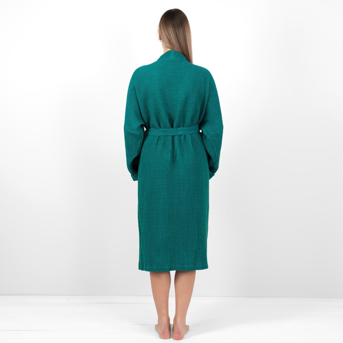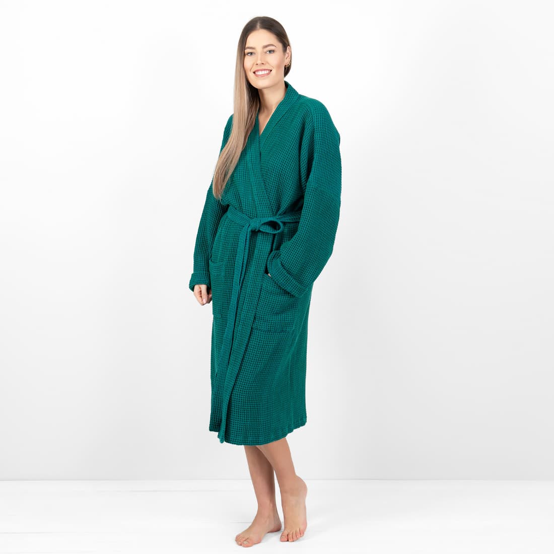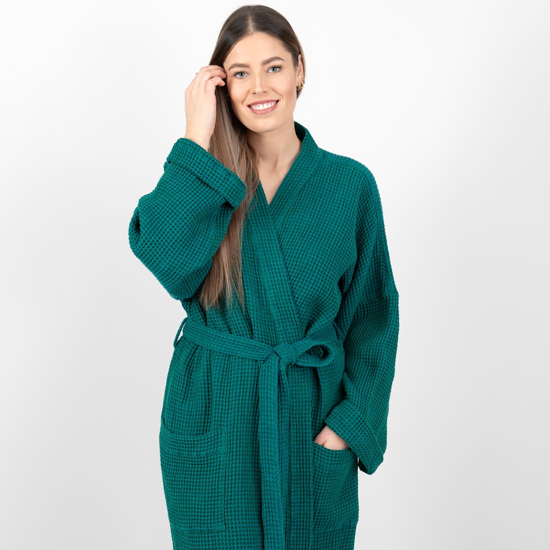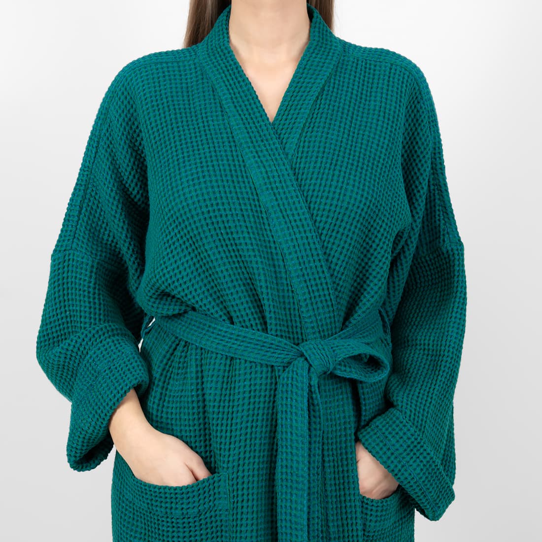 - Detaljer: bundet med et belte, med lommer foran