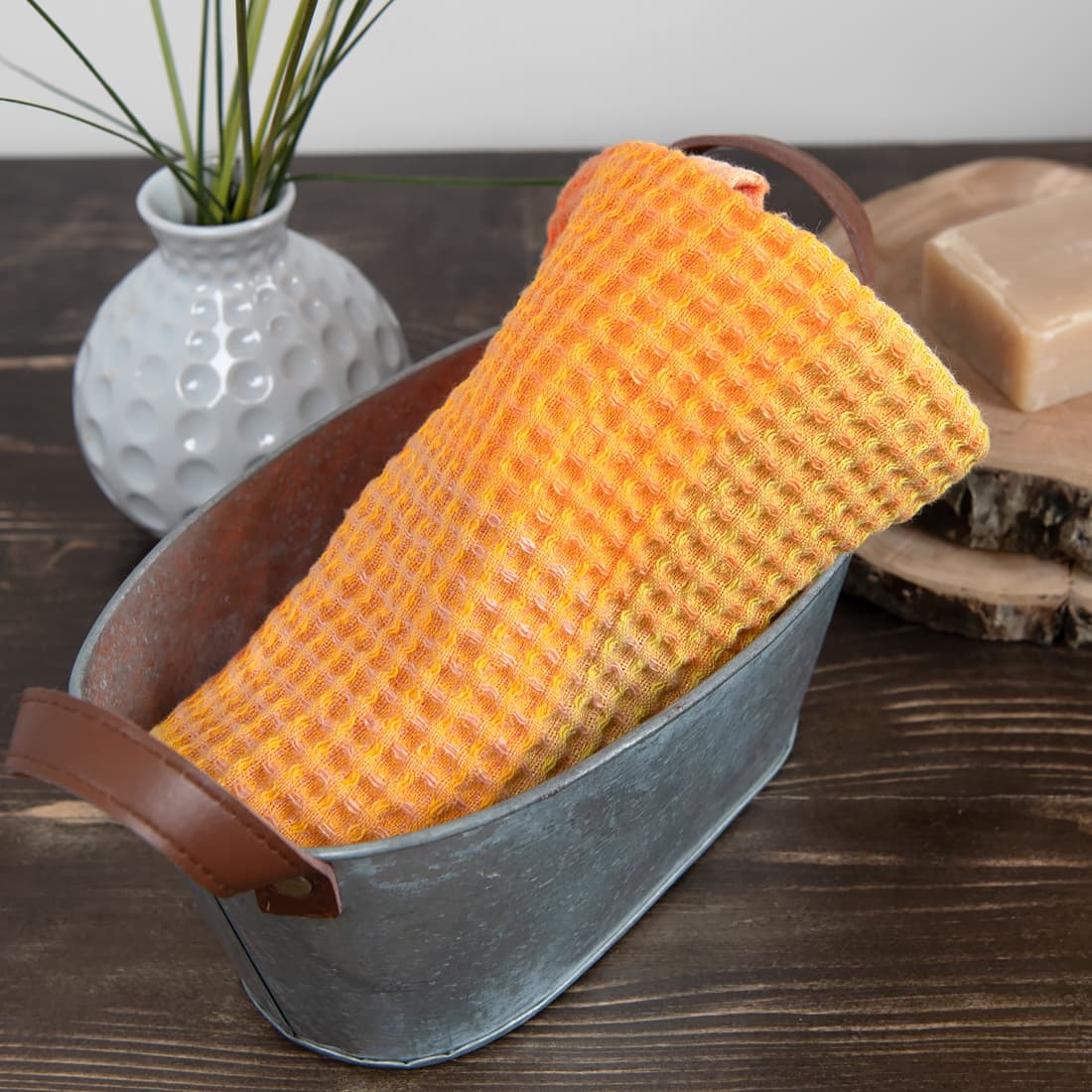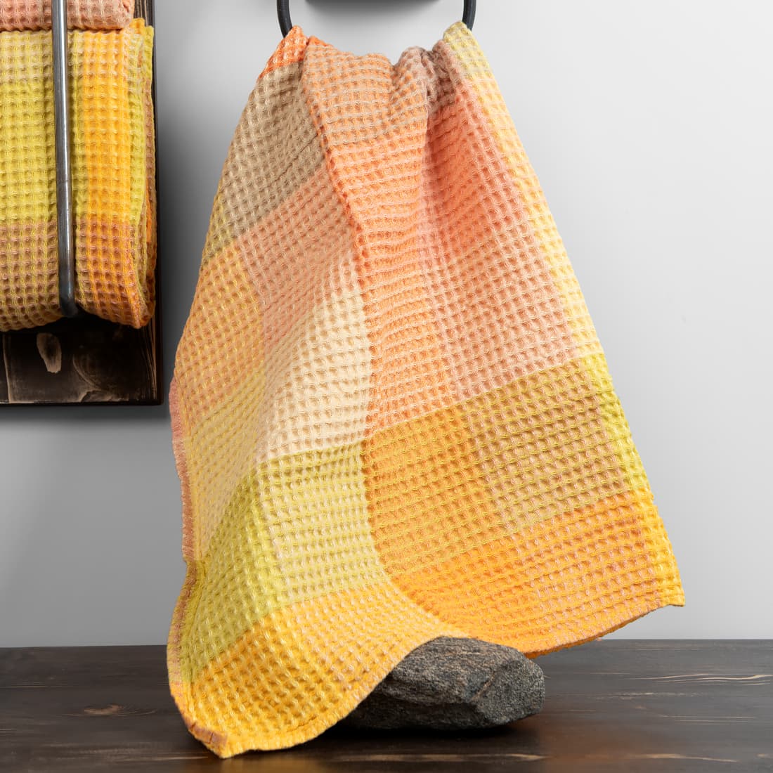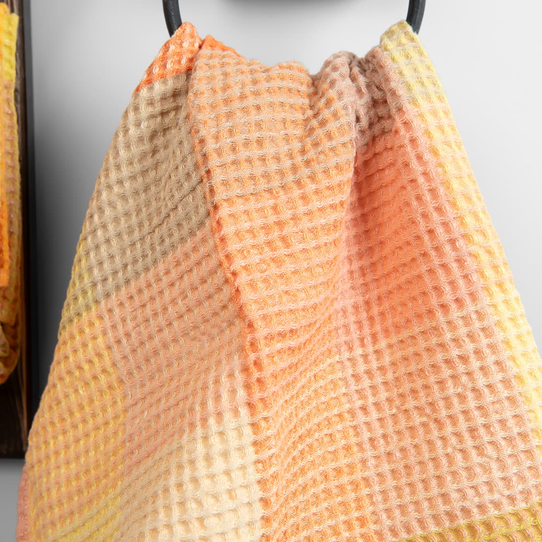 - Farge: vevd av gult og oransje garn i flere nyanser