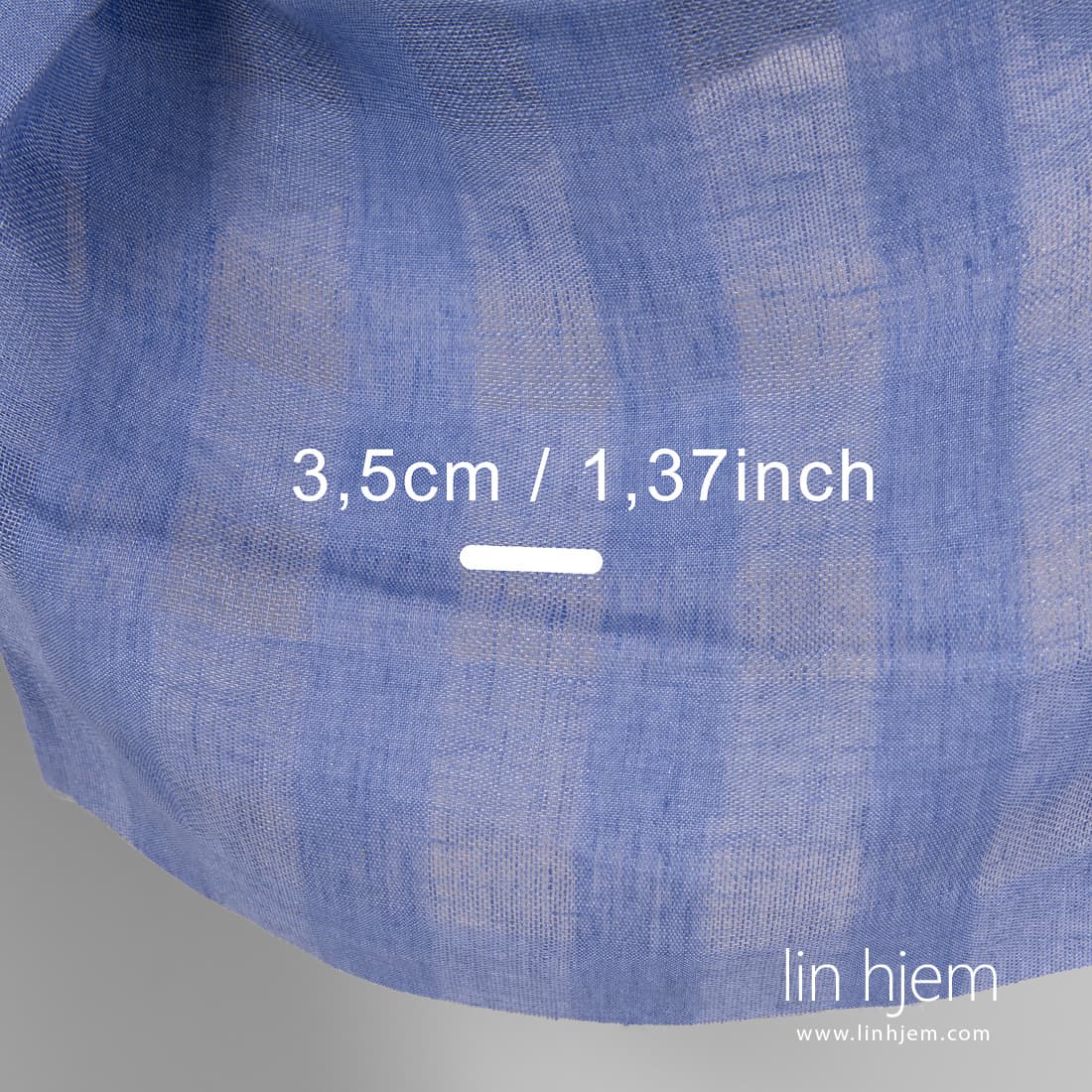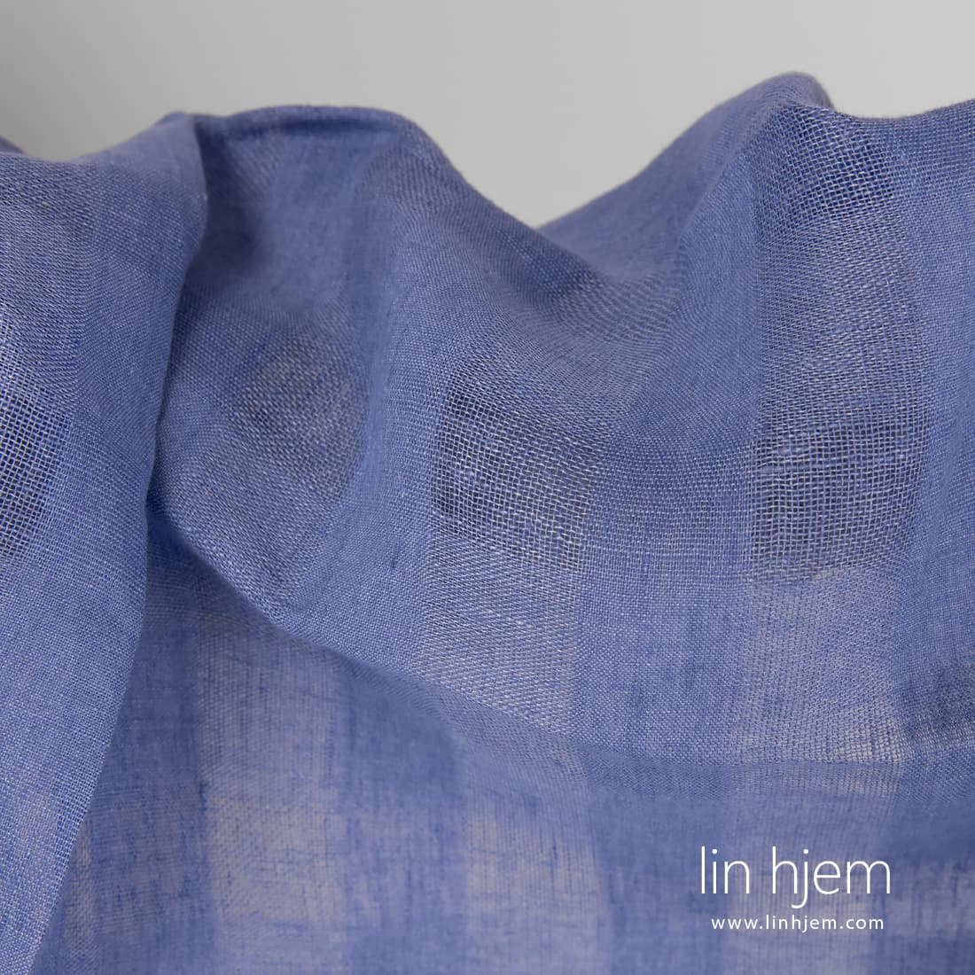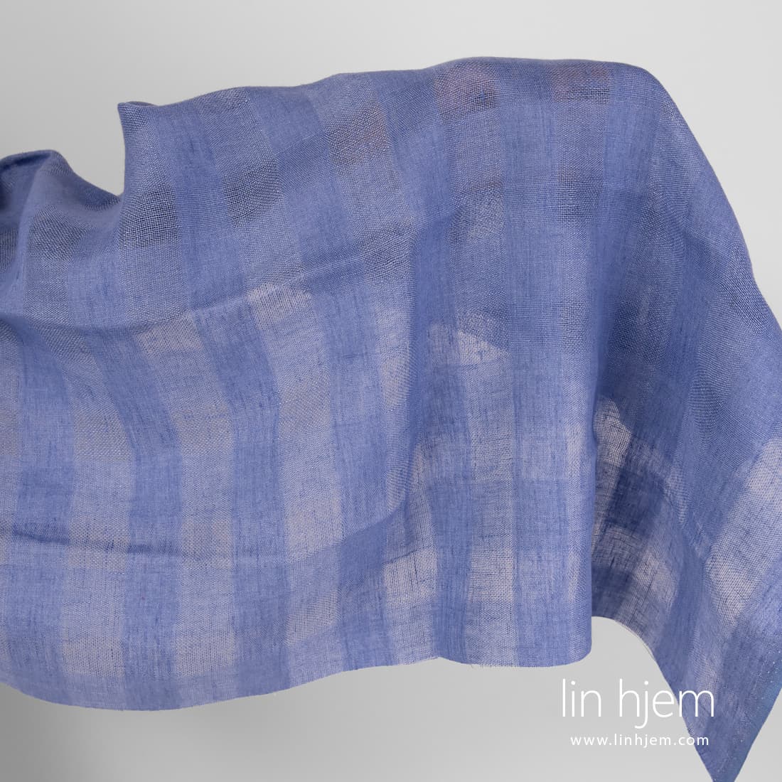 Blått gjennomsiktig linstoff i ruter med lilla fargetone vevd i løstvevde tettere ruter. Passer til å sy gardiner, skjerf, sjal.
