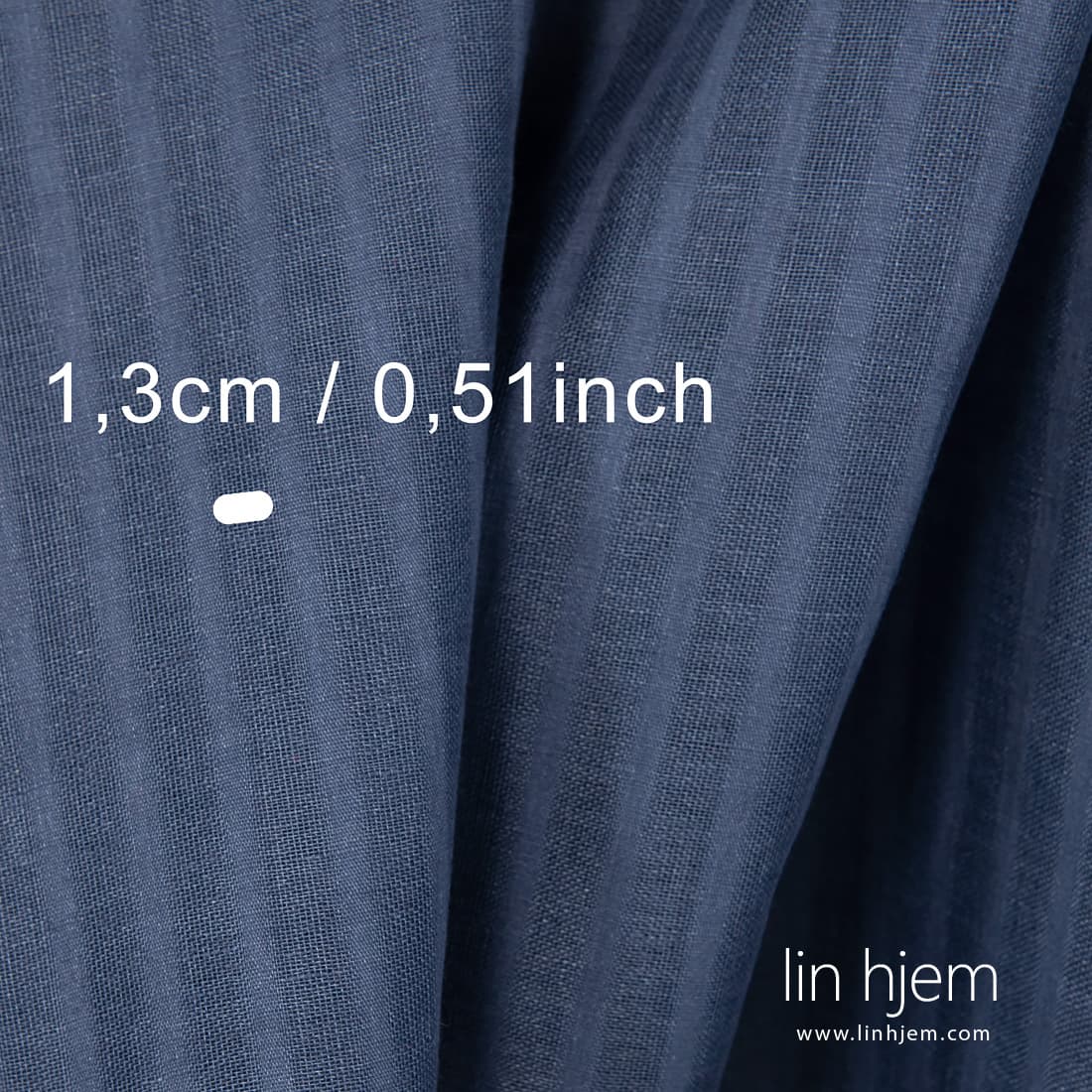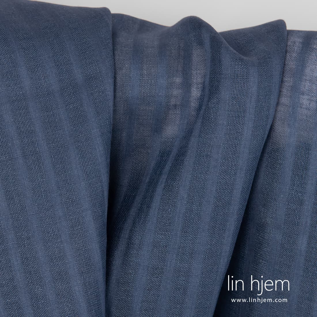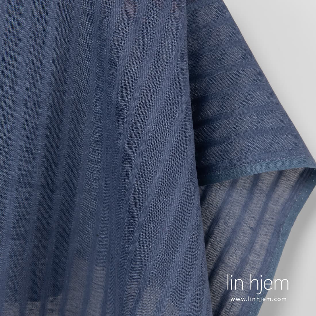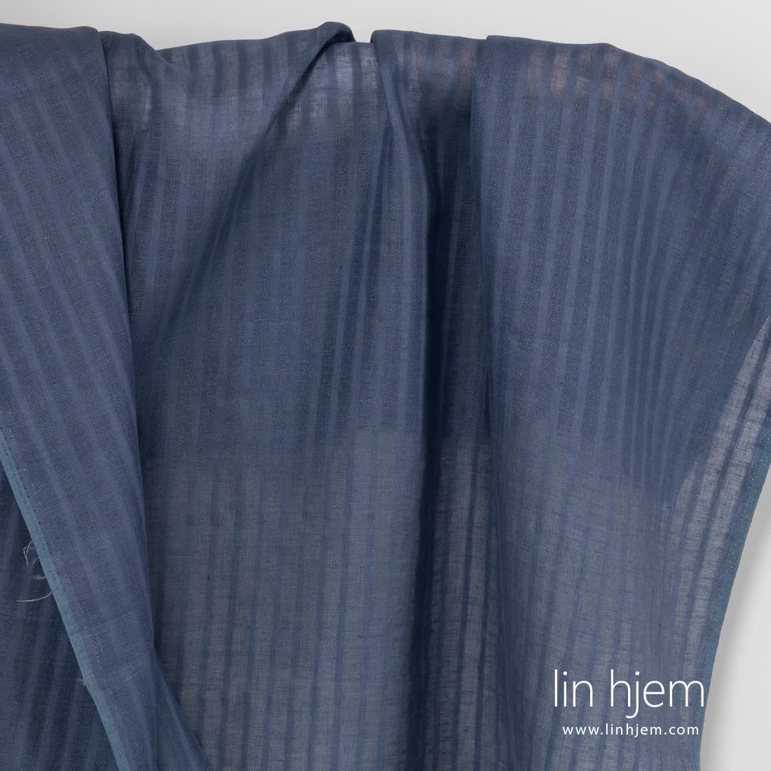 Blått linstoff med gjennomsiktige(løstvevde) striper vevd vertikalt. Dette stoffet er lett derfor passer best til å sy gardiner, skjerf, duker.