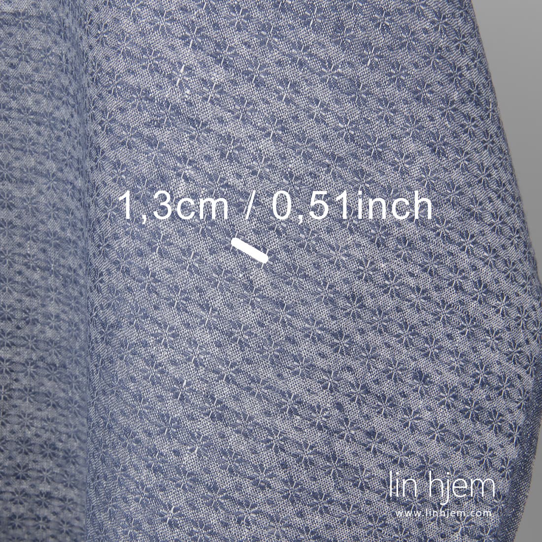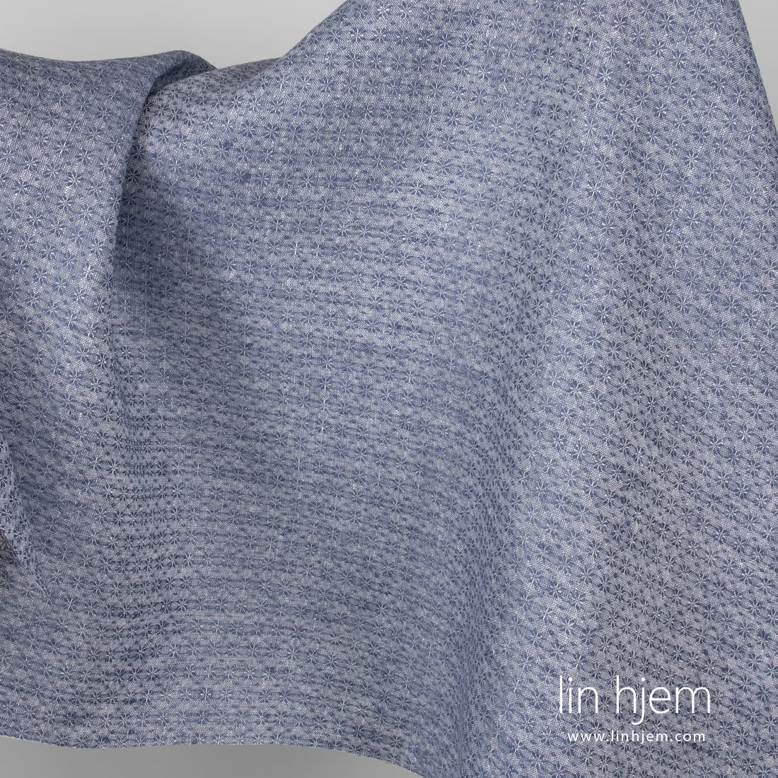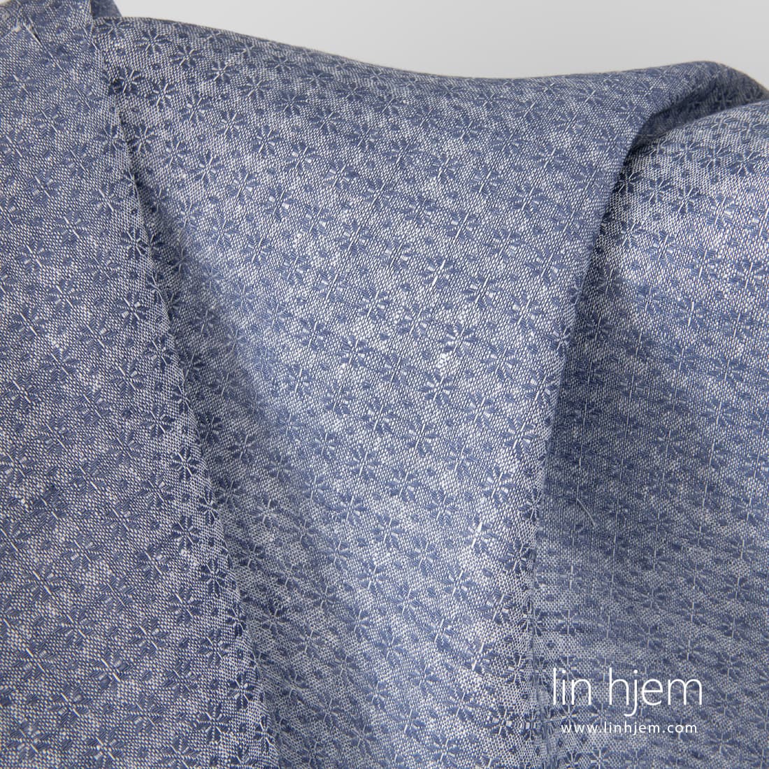 Blått linstoff med snøfnugg av blå og hvite garn. Vevd med små snøfnugg og bobler. Fra dette stoffet som er tettvevd, holdbart kan dere sy klær og hjem tekstil produkter.