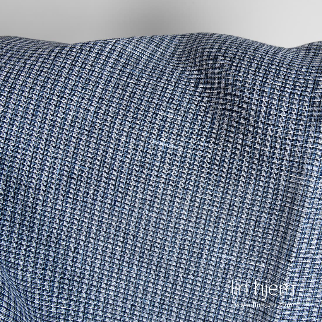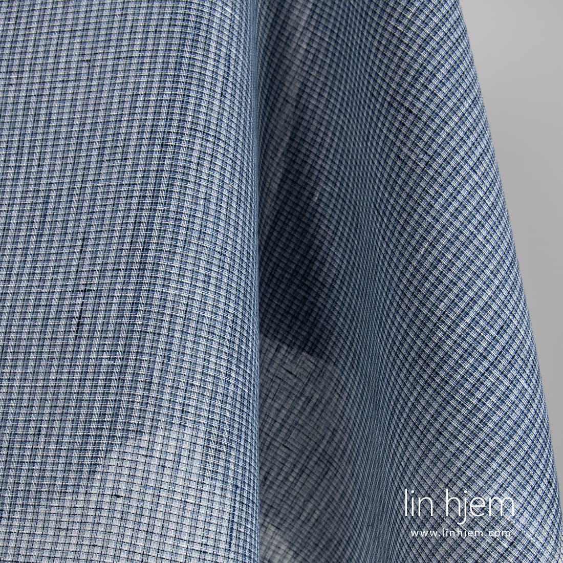 Blått rutete gjennomsiktig linstoff som er vevd av flere nyanser av blå, melkehvite, blåaktig grå og gråaktig garn. Løstvevd, lett linstoff som passer til å sy gardiner, skjerf.