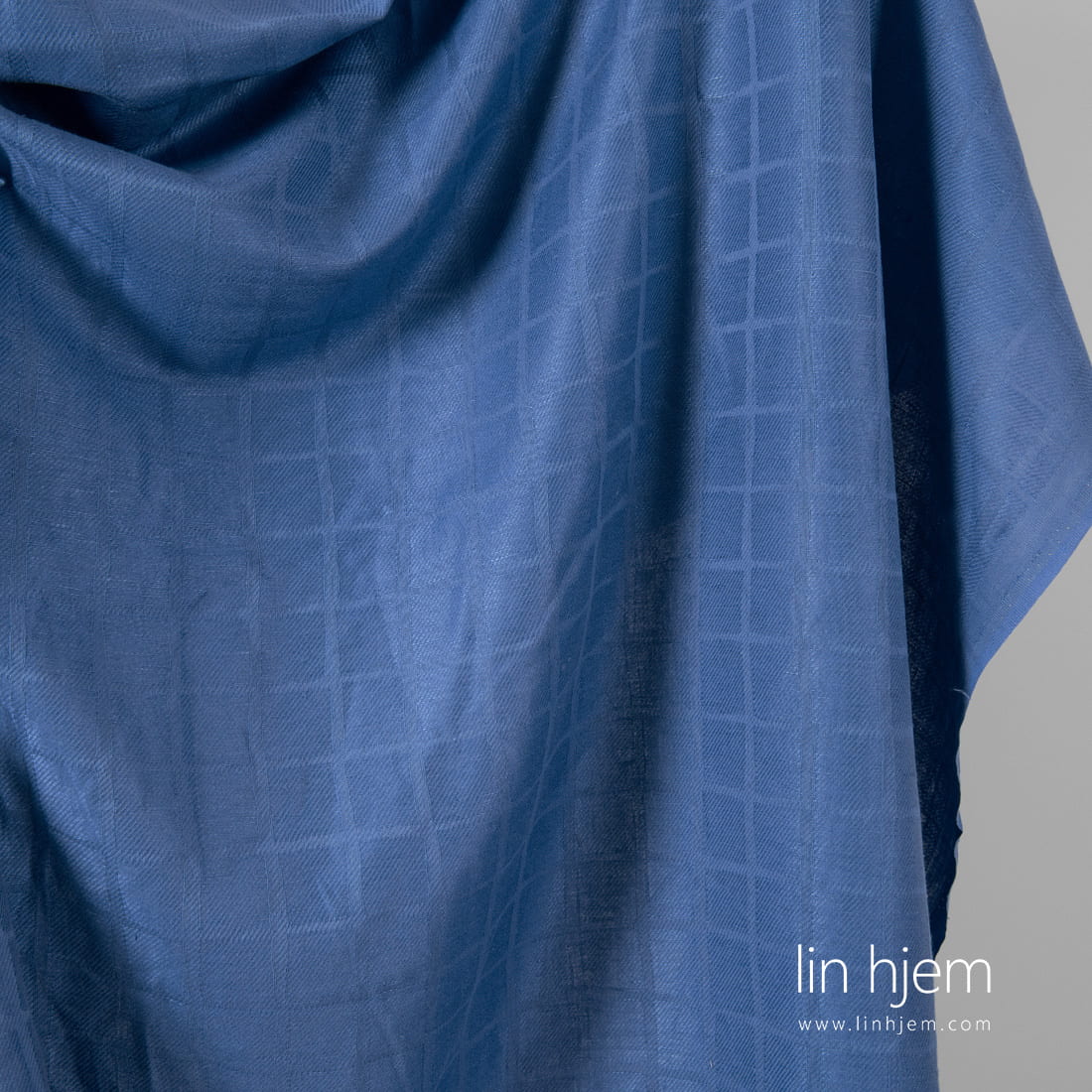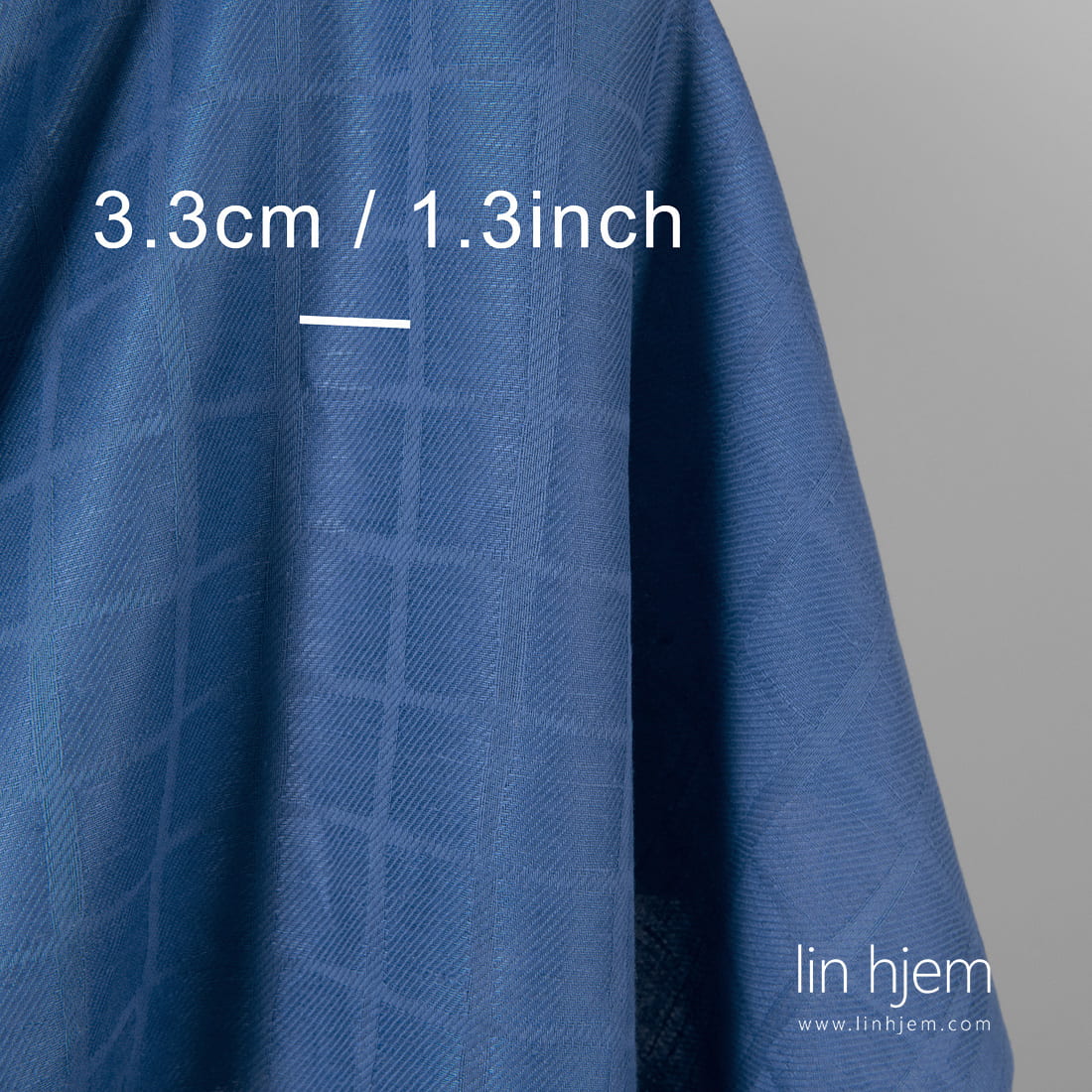 Blått rutete jacquard lin-bomull stoff med diagonale striper. Vertikale og horisontale striper deler stoffet i 4,2 x 4,5cm ruter. Tettvevd, holdbart, middels tykkelse halvlin stoff.