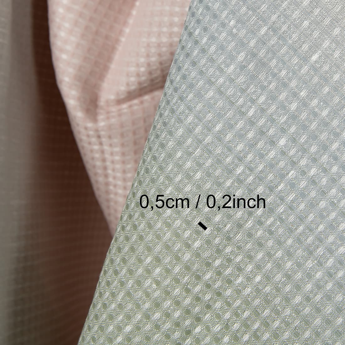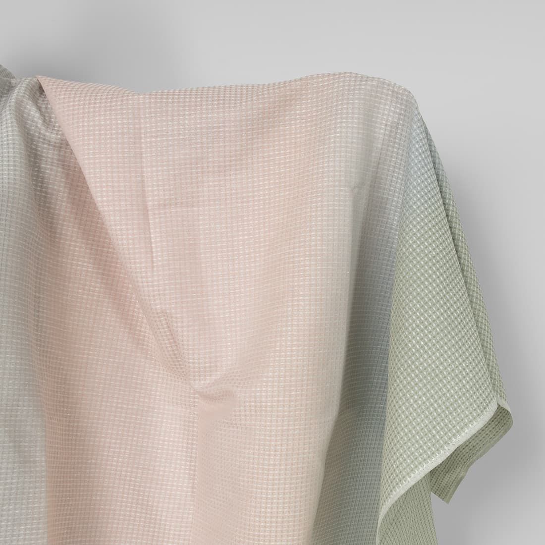 - Farge: vevd garn av gammelgrønt, hvitt, blågrått, brungrått, lysebrunt og lys rosa, melange med fargegradient