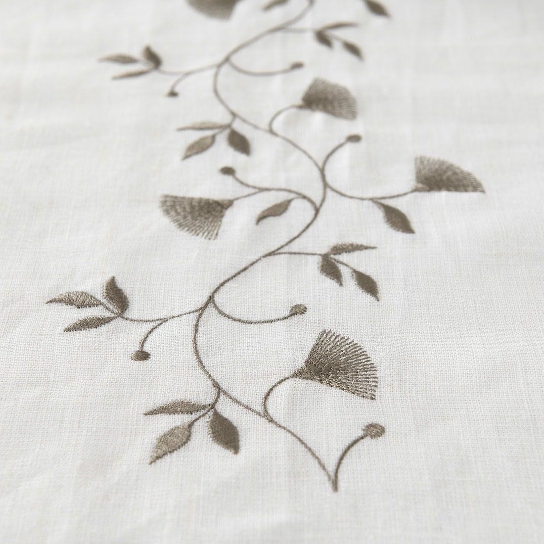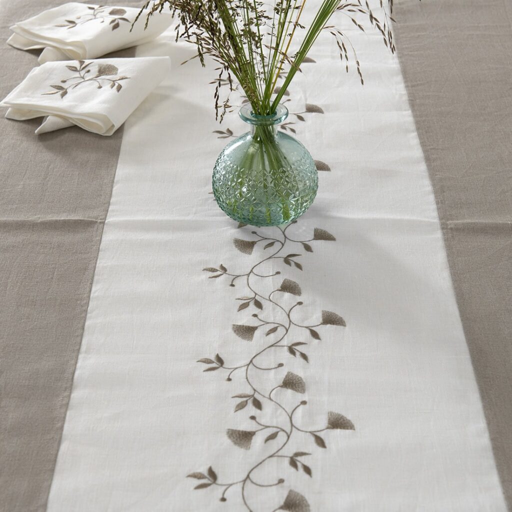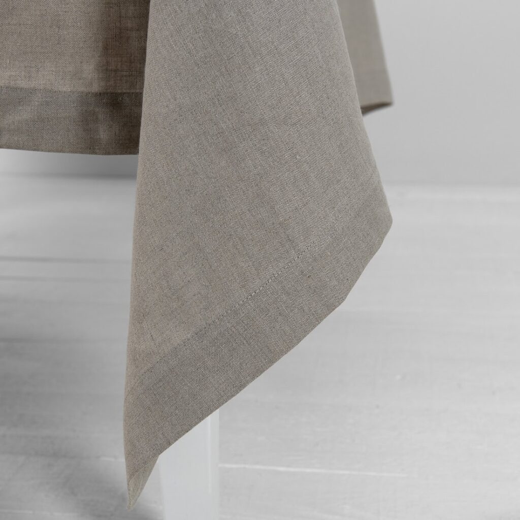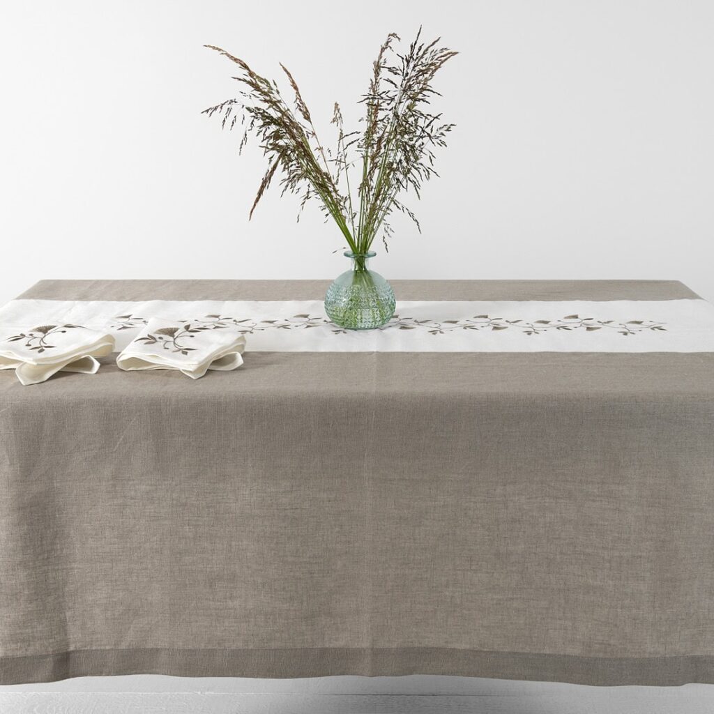 - Farge: naturfarget lin (ufarget, brungrå) kanter og off-white (gulhvit) midtparti