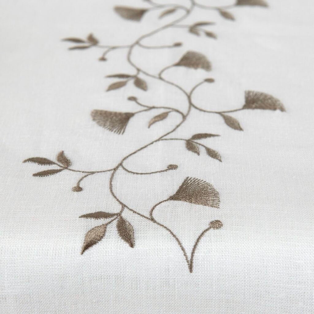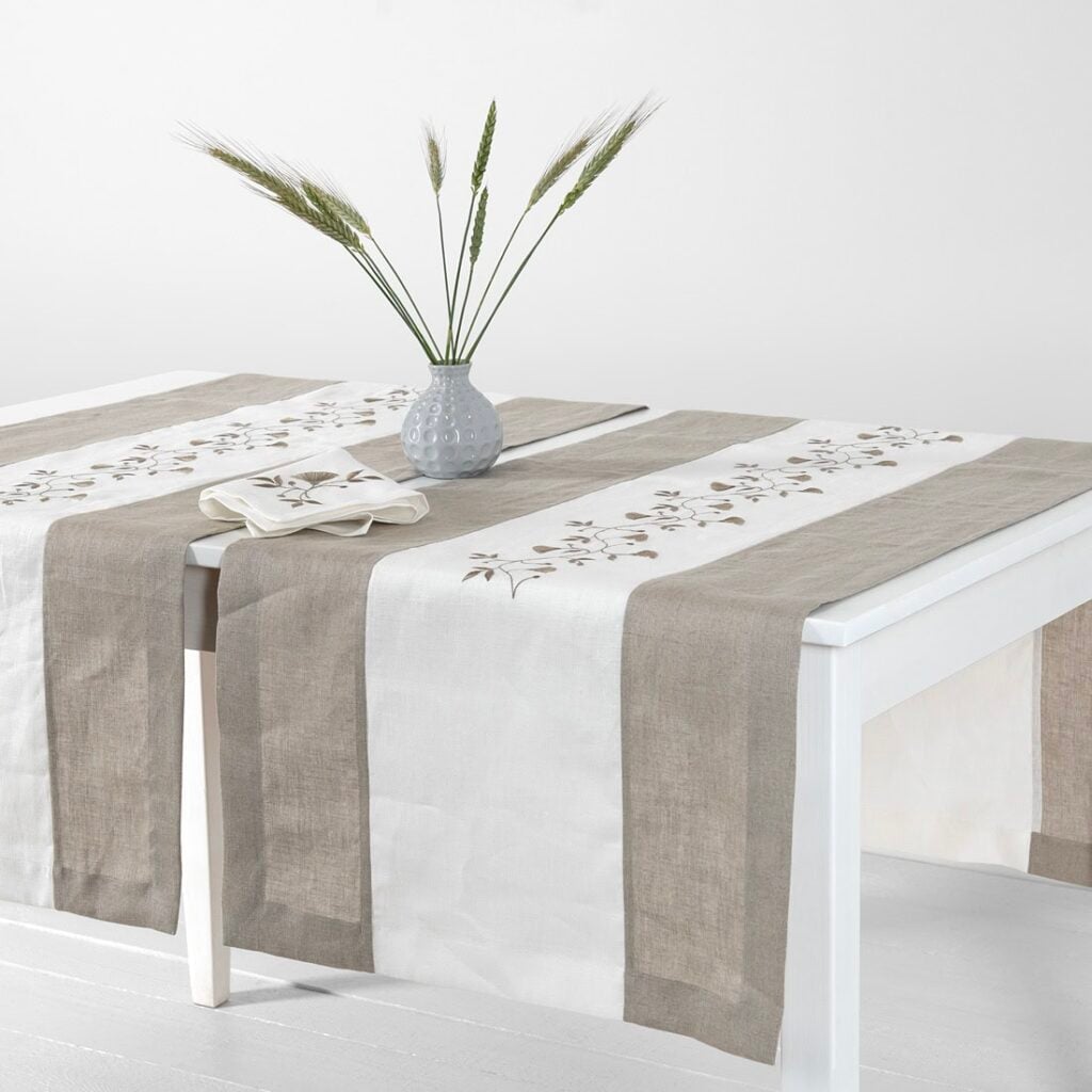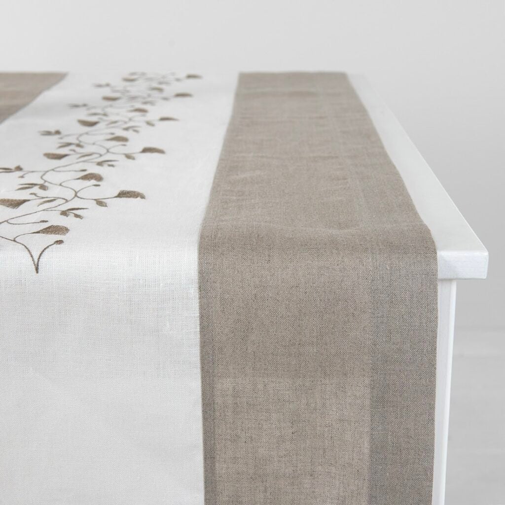 - Farge: naturfarget lin (ufarget, brungrå) kanter og off-white (gulhvit) midtparti