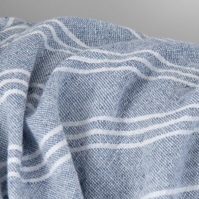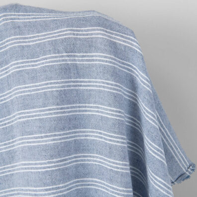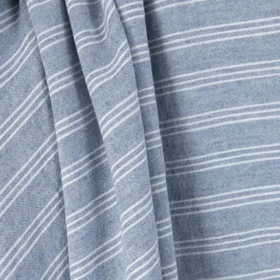 • Bredt blått halvlin stoff med hvitte striper vasket