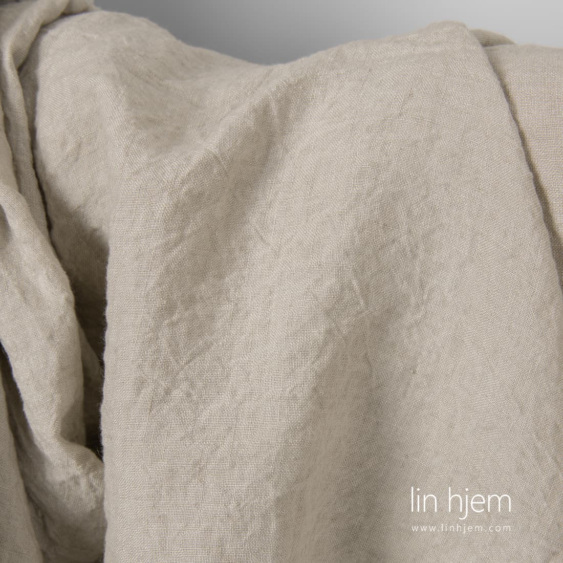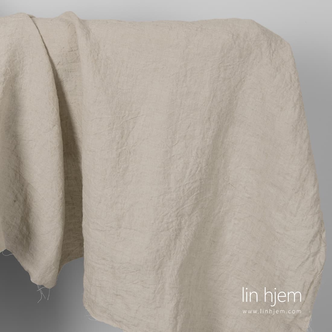 Bredt sand farget vasket linstoff. Spesielt vasket med ny teknologi for å gjøre stoffet mykt, skånsomt, behagelig mot huden. Tettvevd, holdbart, middels tykkelse. Passer til klær, kjøkken produkter, sengetøy, produkter til spisebord, gardiner.