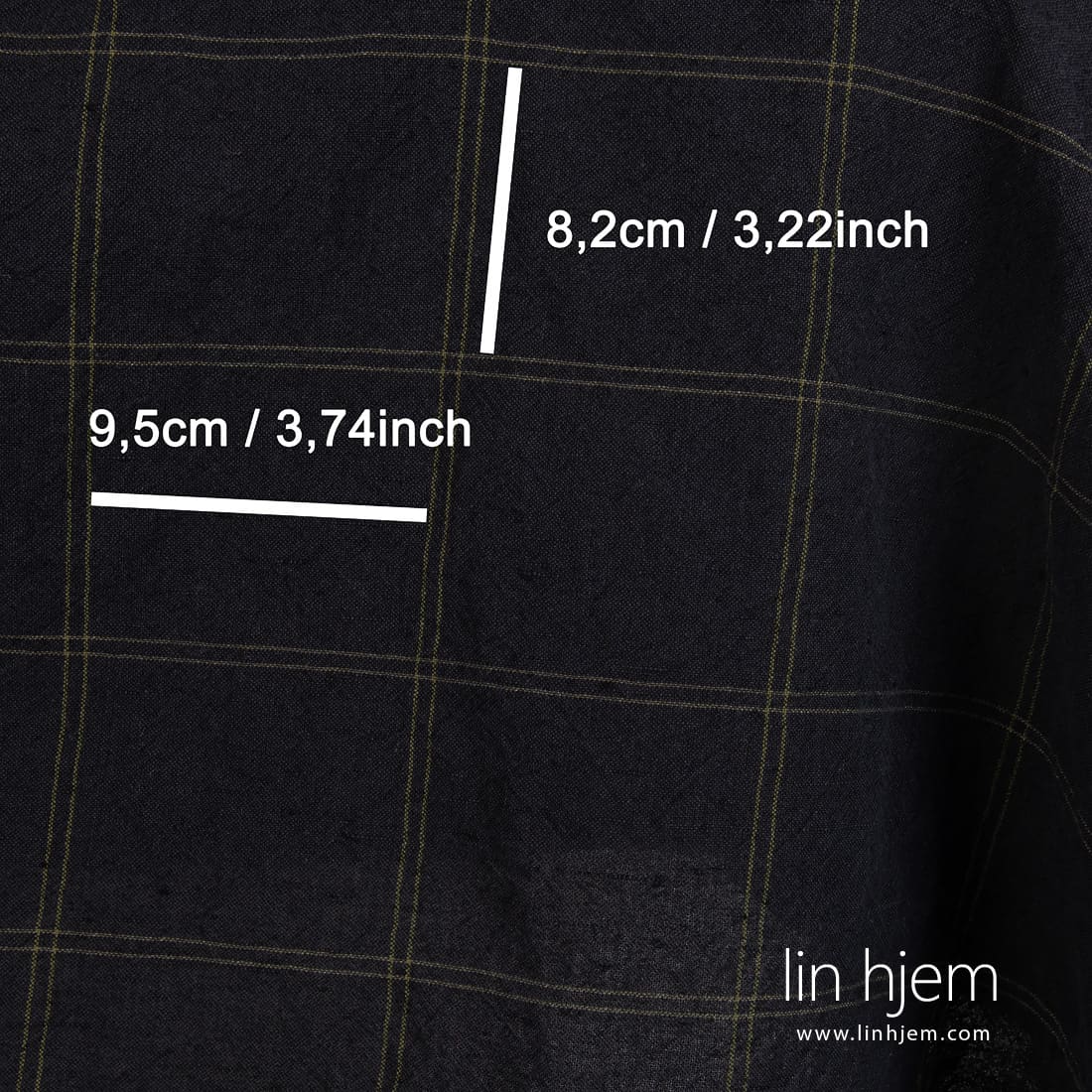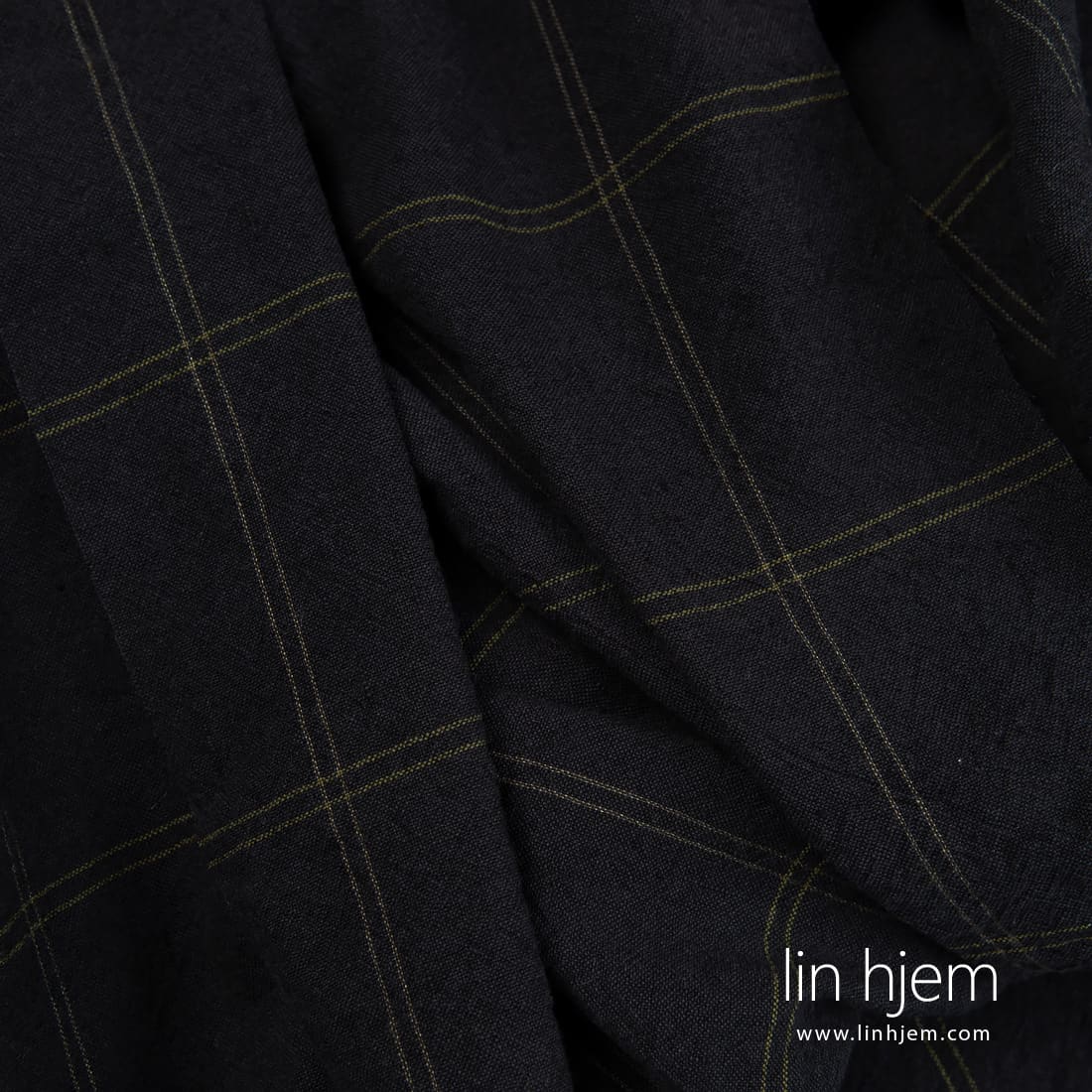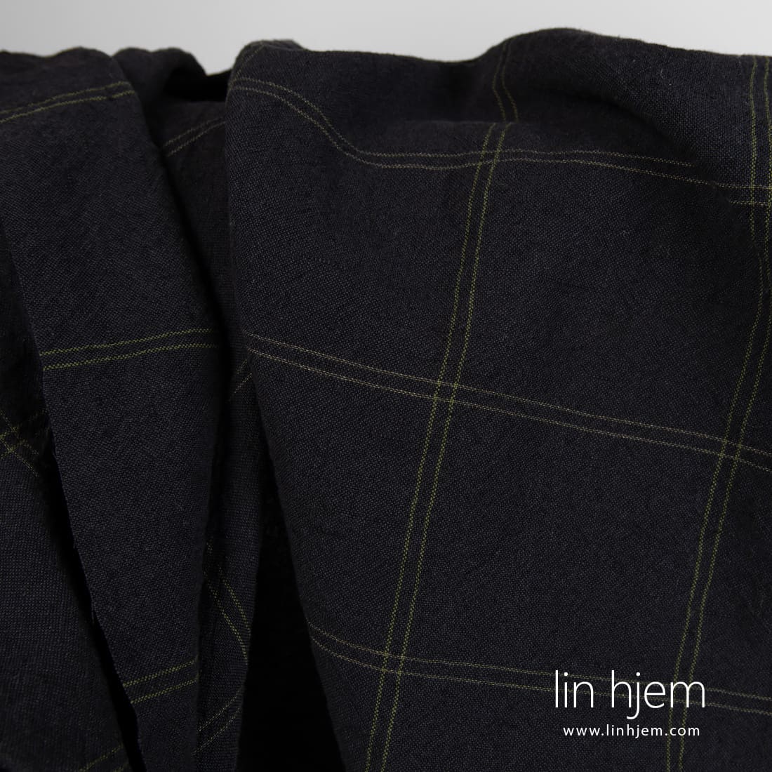 • Bredt sort lin bomullsstoff i grønne ruter, vasket