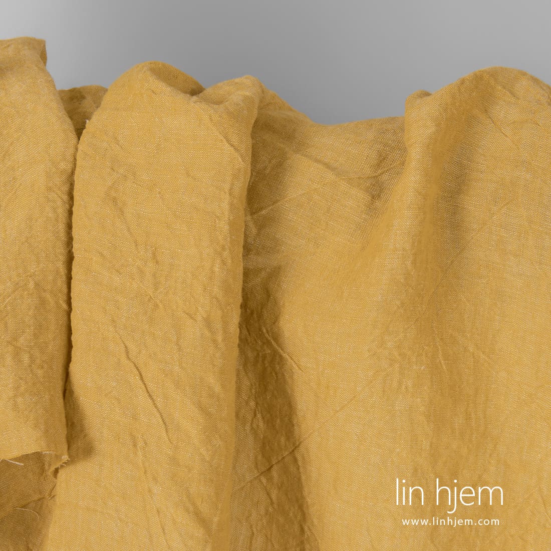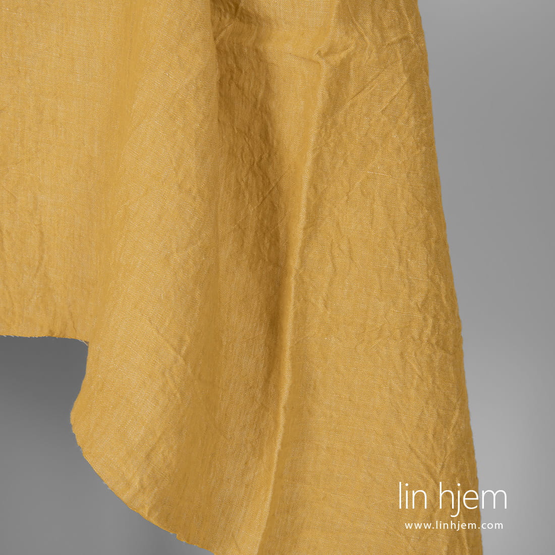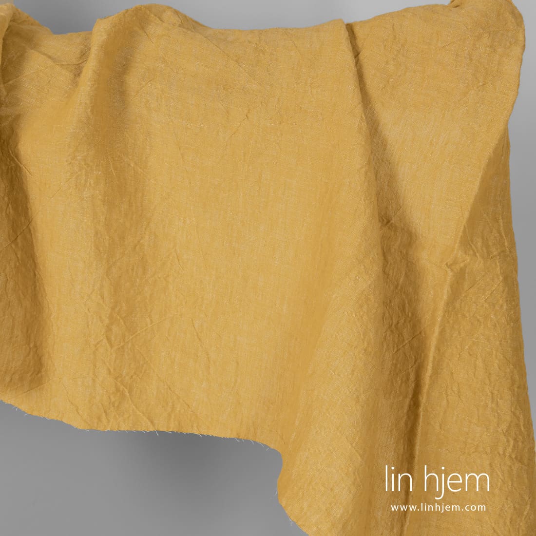 Bredt vasket gult linstoff vevd fra sennep farget og lysebrune garn. Lett, tettvevd og middels tykkelse. Spesielt vasket stoff som er mykt, skånsomt og krymper ikke. Dette stoffet er perfekt til å sy gardiner, duker, sengetøy osv.