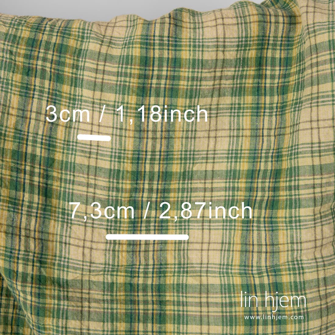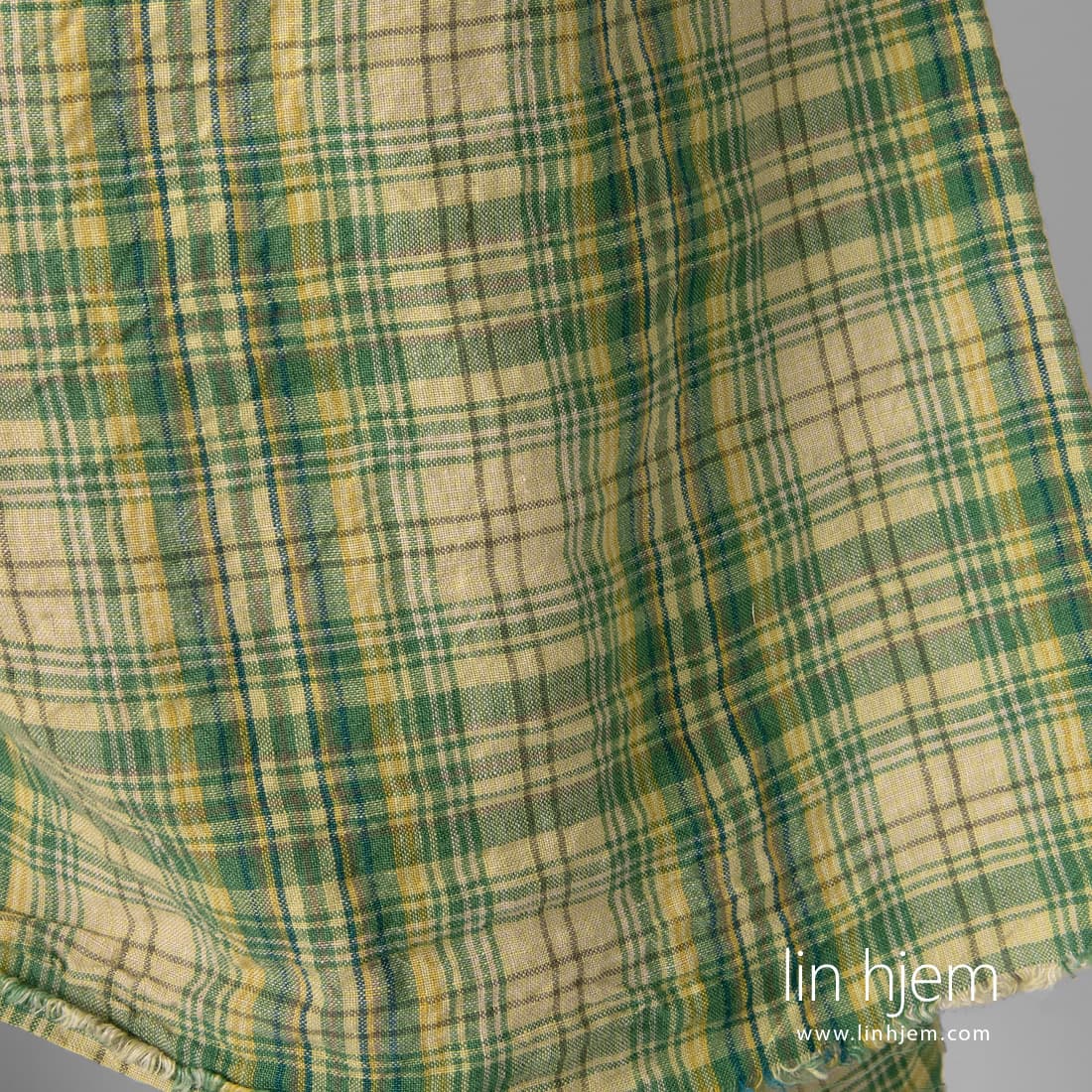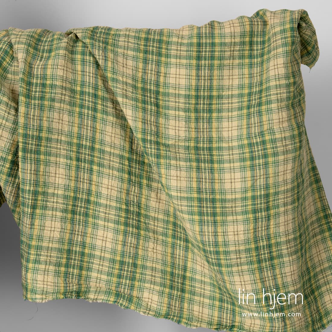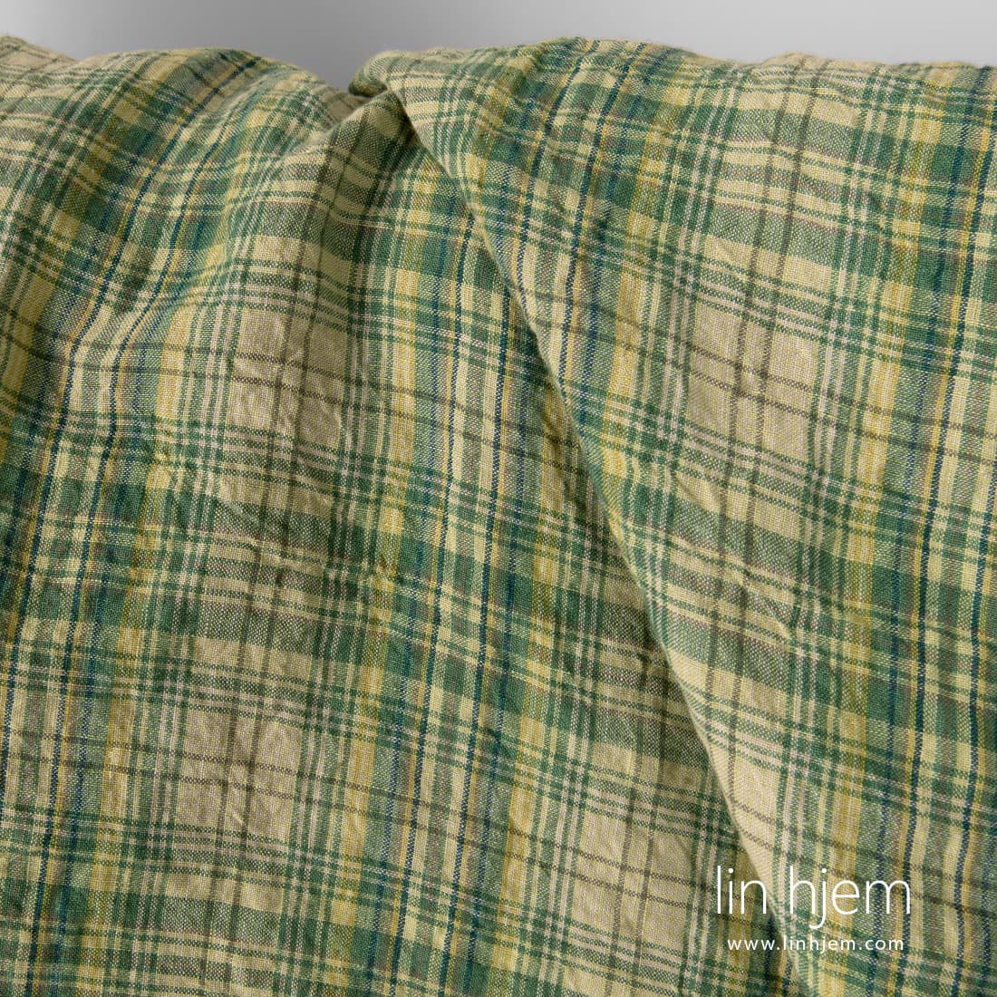 Bredt vasket linstoff i grønne ruter som ble vevd av grønnaktig grå, lysegrønne, mørkegrønne, turkis farget garn. Stoffet er spesielt vasket med ny teknologi som er mykt, skånsomt og behagelig mot huden. Passer perfekt til å sy sengetøy, klær og forskjellige hjem tekstil produkter.