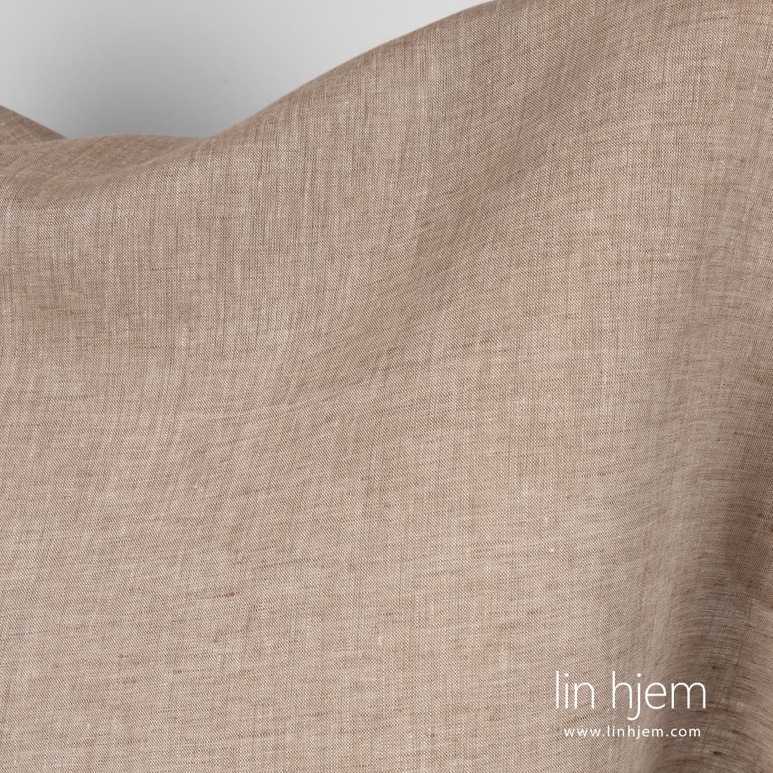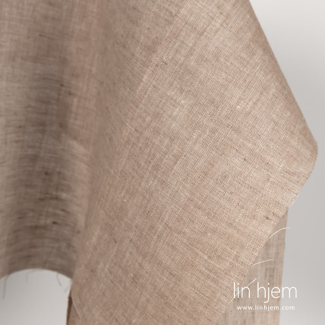 Brunaktig melange linstoff vevd av lysebrune og sand farget garn. Lett, holdbart, tettvevd stoff som passer til å sy klær, sengesett, gardiner, duker og servietter.
