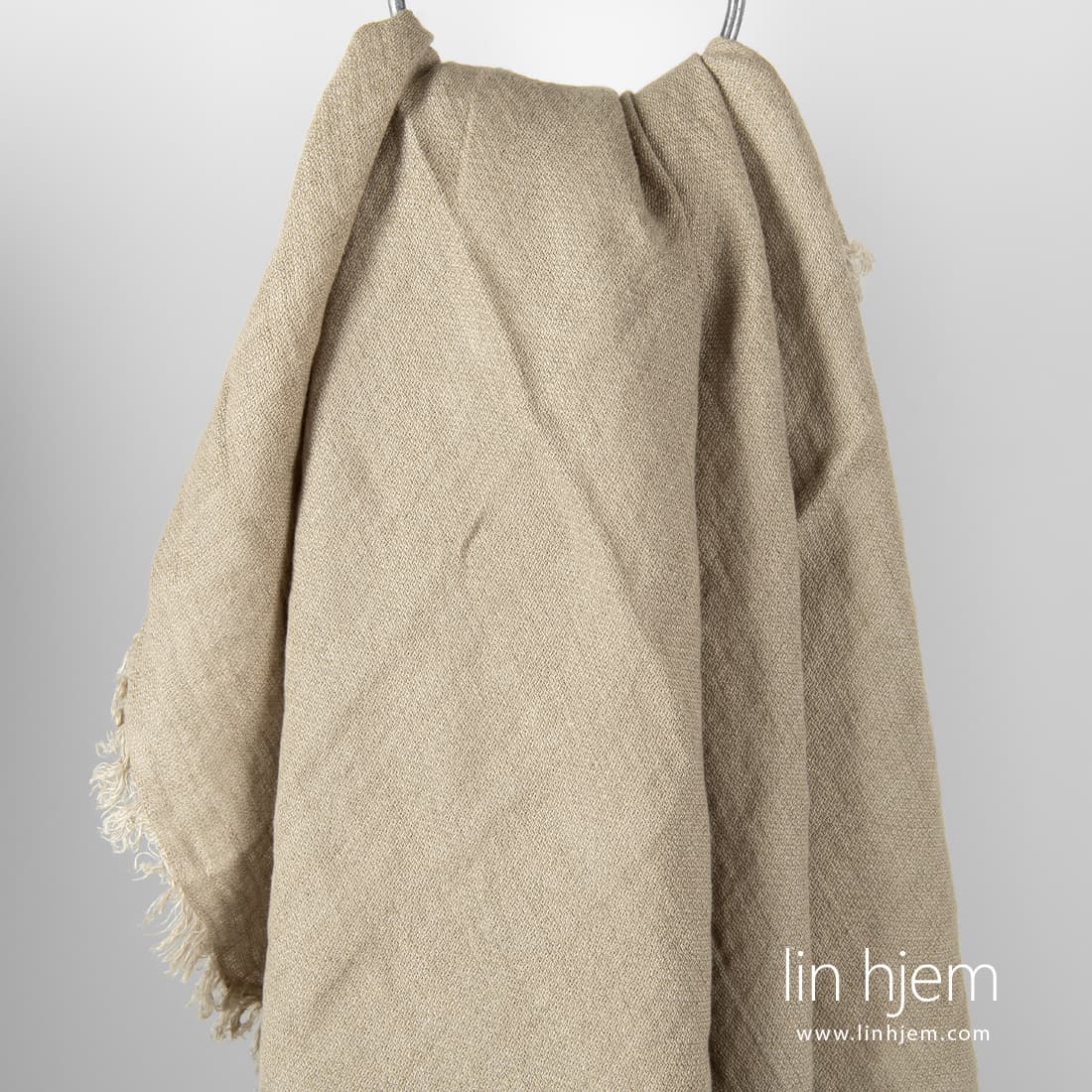 Linskjerf i brunatig grå farge(sand farget) i elegant mønster. Sider pyntet med 2cm lange frynser. Stoffet er spesielt vasket med ny teknologi for å gjøre stoffet mykt og skånsomt. Lett linskjerf kan kombineres med klær av rolige farger.