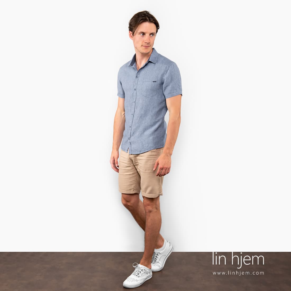 Blå linskjorte til herre av melange stoff som ble vevd av mørkeblå og lyseblå garn. Passer perfekt til varme sommer dager. Komfortabel skjorte til hverdagen.