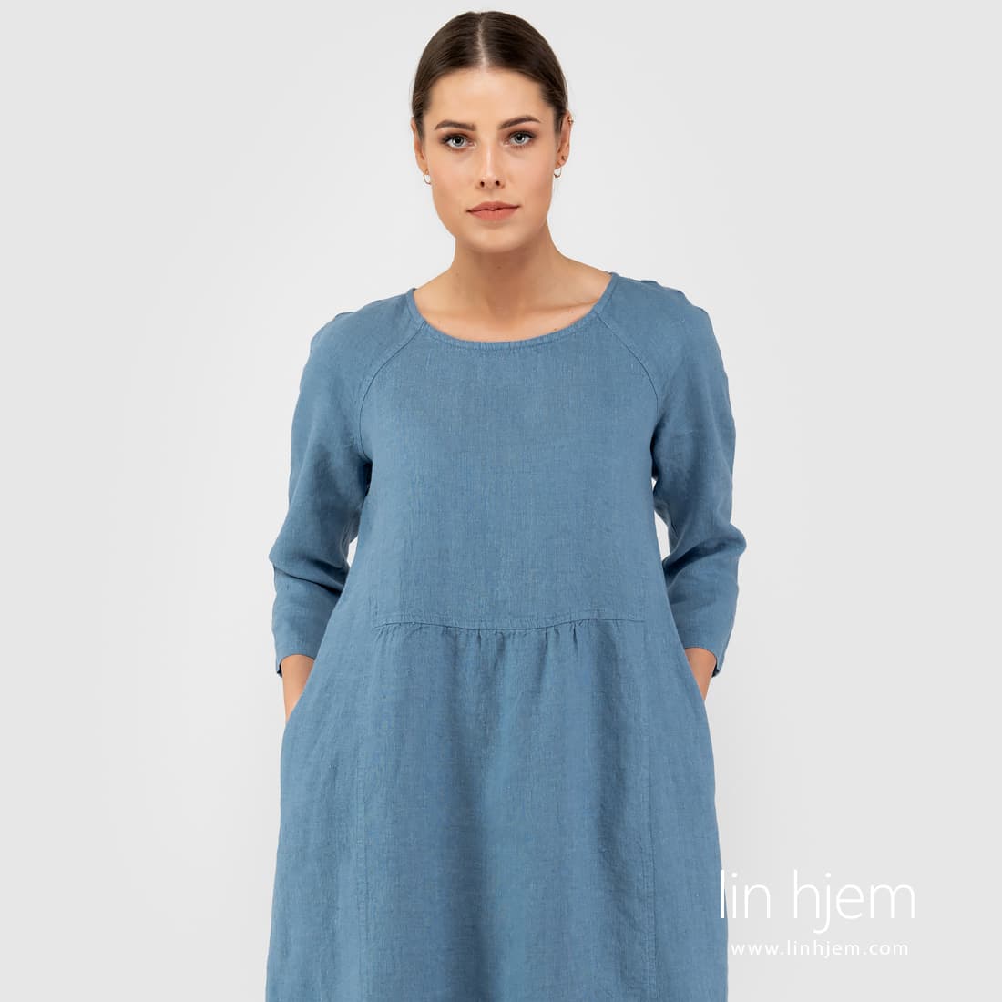 Blå linkjole laget av melange stoff. Stoffet ble vevd av lyseblå og grønn-blå lingarn. Enkel, hverdags kjole som er naturell og ekstremt myk.