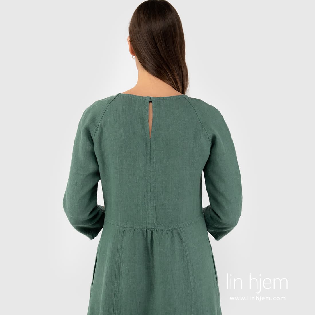 Mørkegrønn linkjole. Denne kjolen ble laget av melange linstoff som ble vevd av grønne og blå-grå lingarn. Bærekraftige, langvarige mote elskere denne linkjolen er egnet spesielt for deg. En enkel klipp, subtile farger lar deg bruke denne kjolen i mange år.