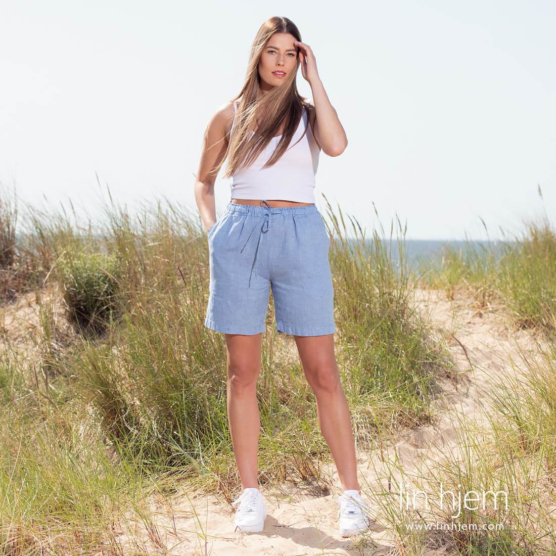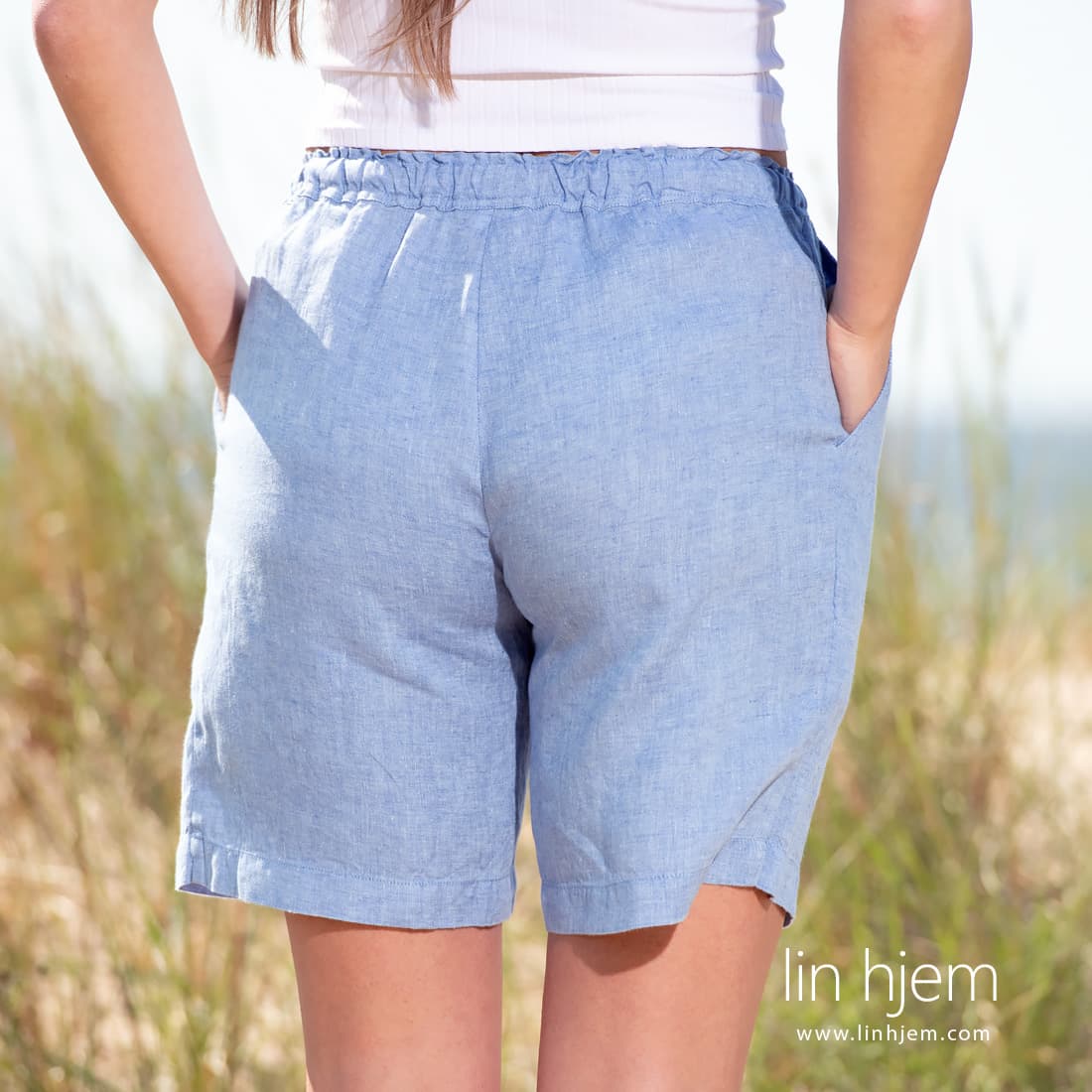 - Detaljer: lommer, midje med strikk og snøring