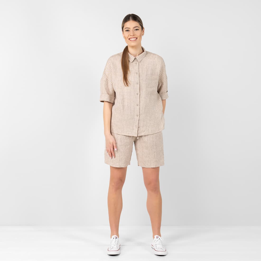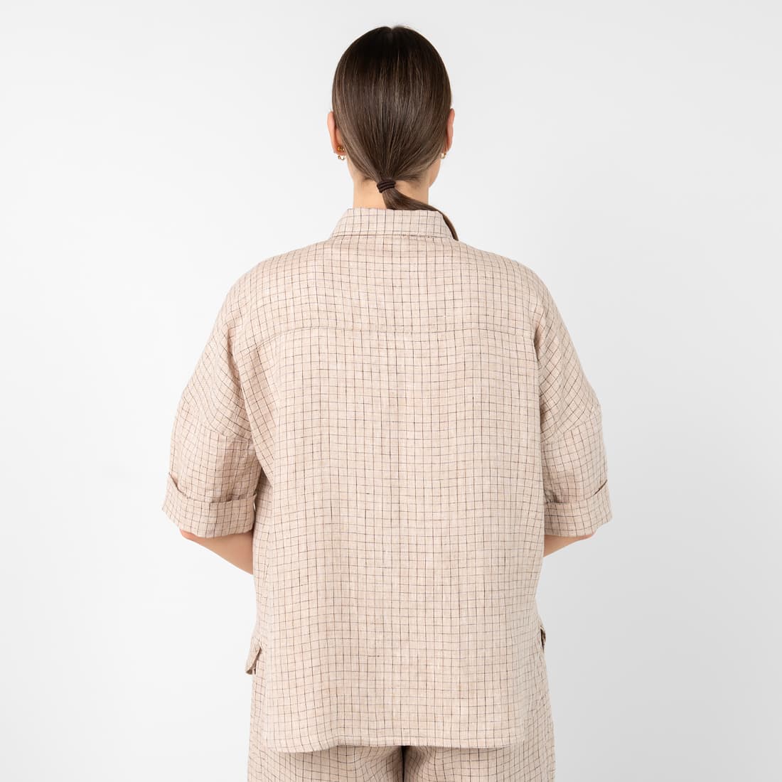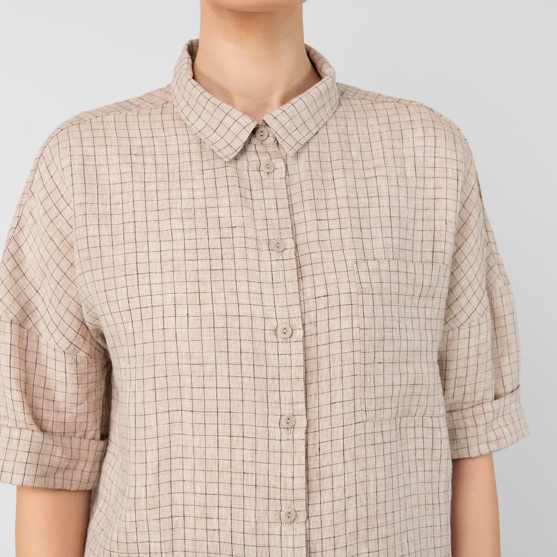 - Modell: rett løs silhuett, oversized bluse i skjortestil