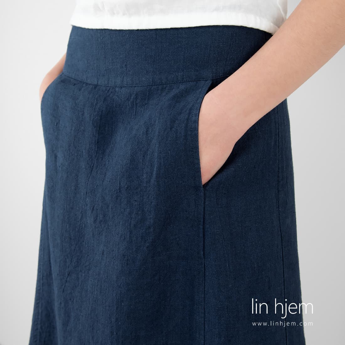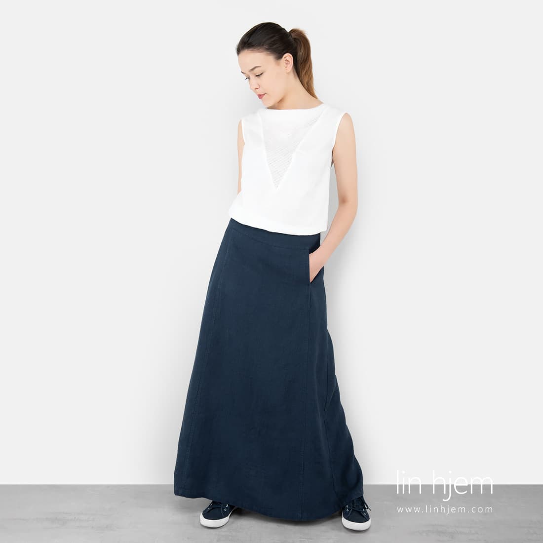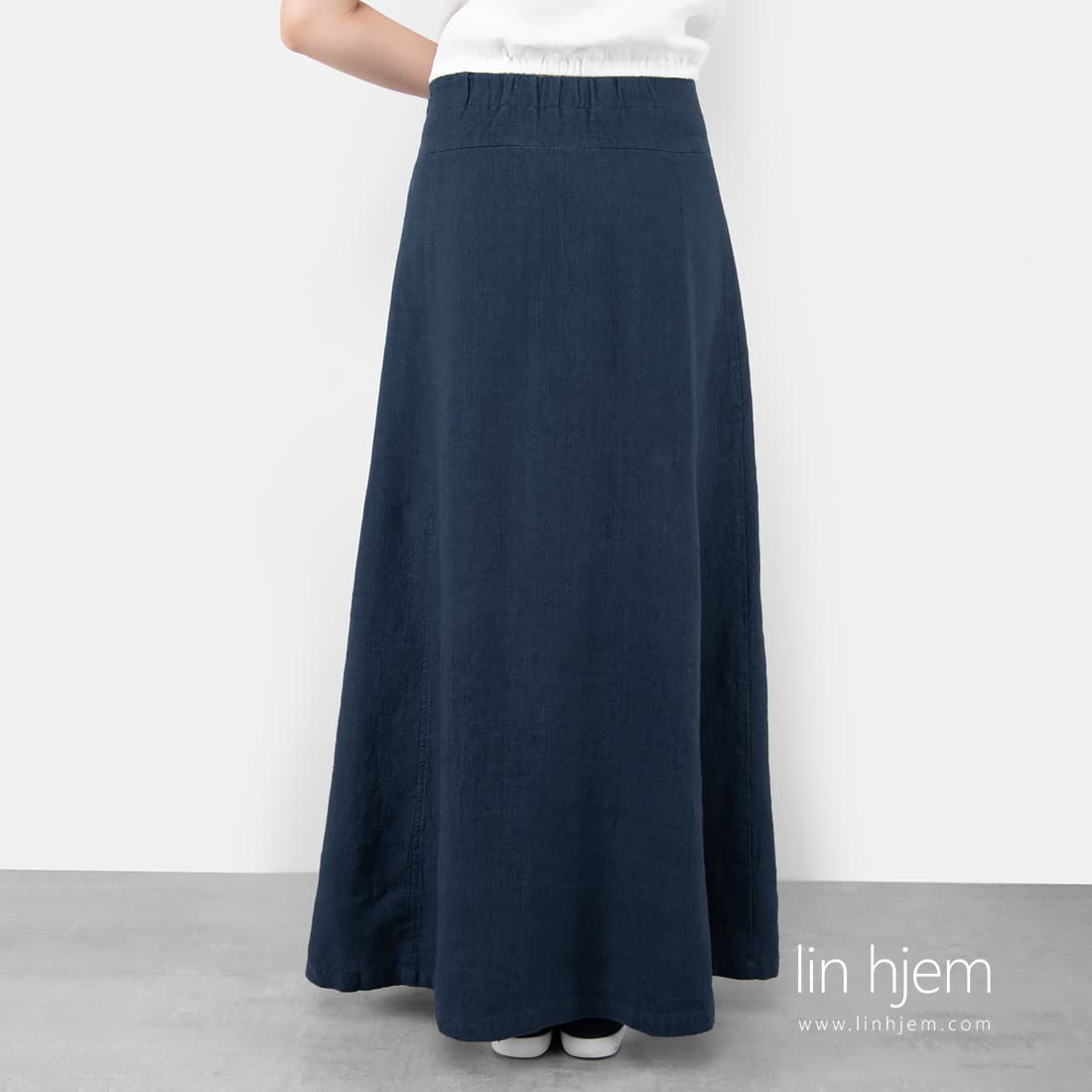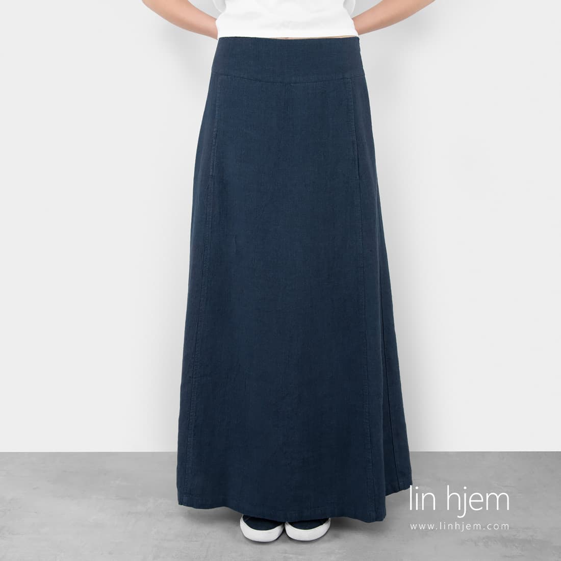 Langt blått skjørt av lin. Mørk solid farge og subtil design. Passer perfekt til alle anledninger. Kombiner med en bluse av lin fra vår nettbutikk. Bredt utvalg av størrelser (fra 36 til 54).
