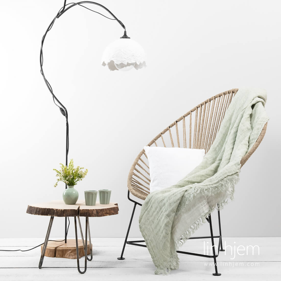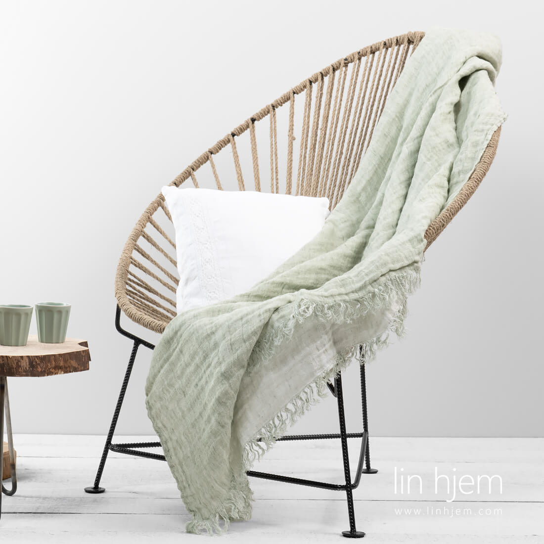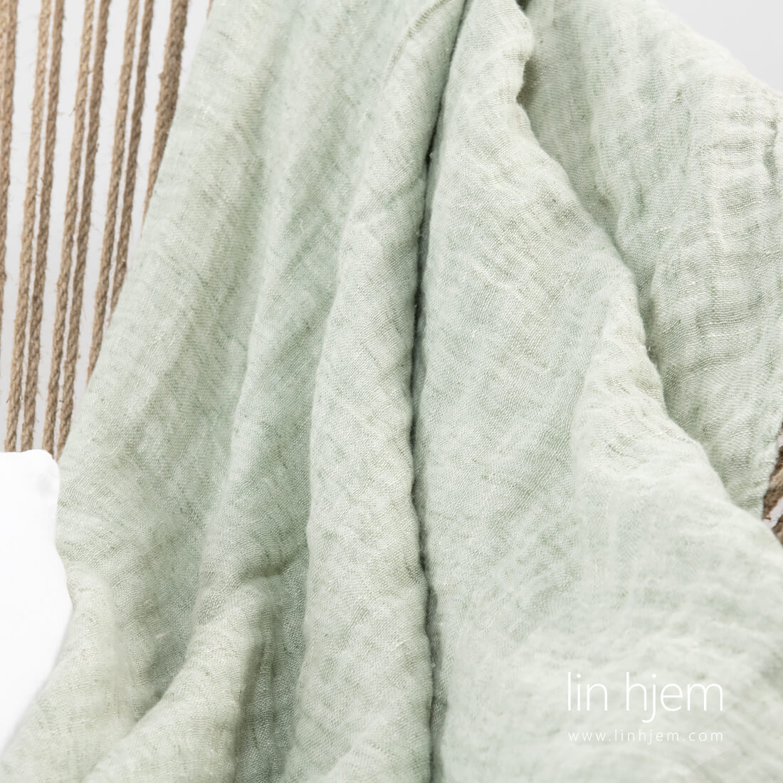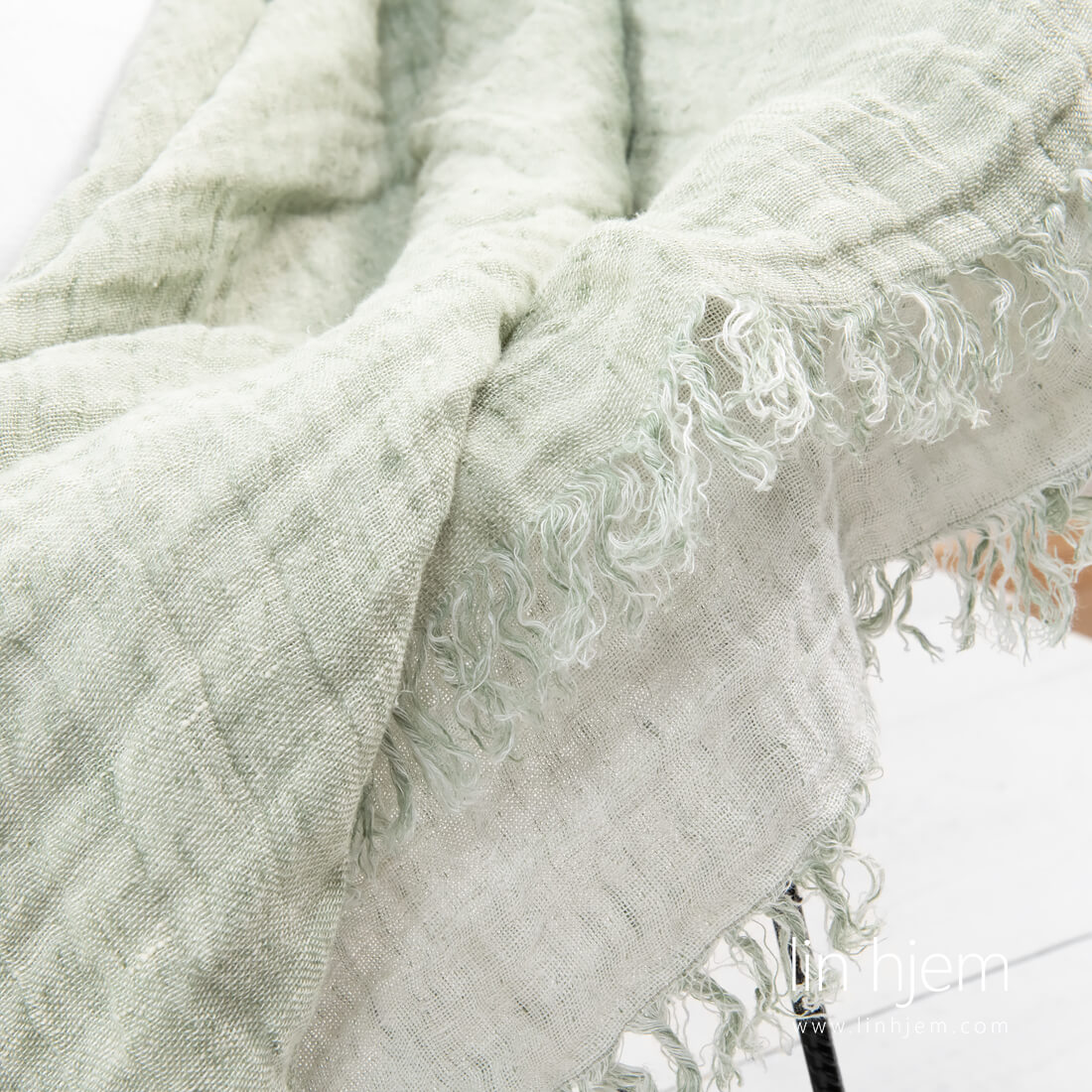 Tosidig linpledd i lys grønn farge pyntet med 5cm frynser på kortsidene. Varmt og mykt pledd vasket med spesielt teknologi. Siden pleddet er tosidig så du kan kombinere det med rommets interiør.