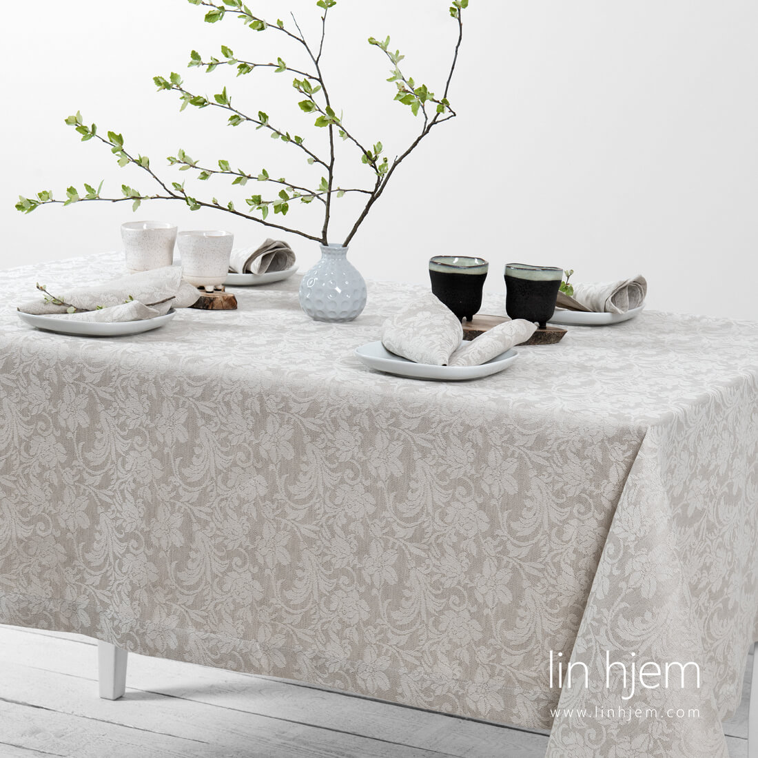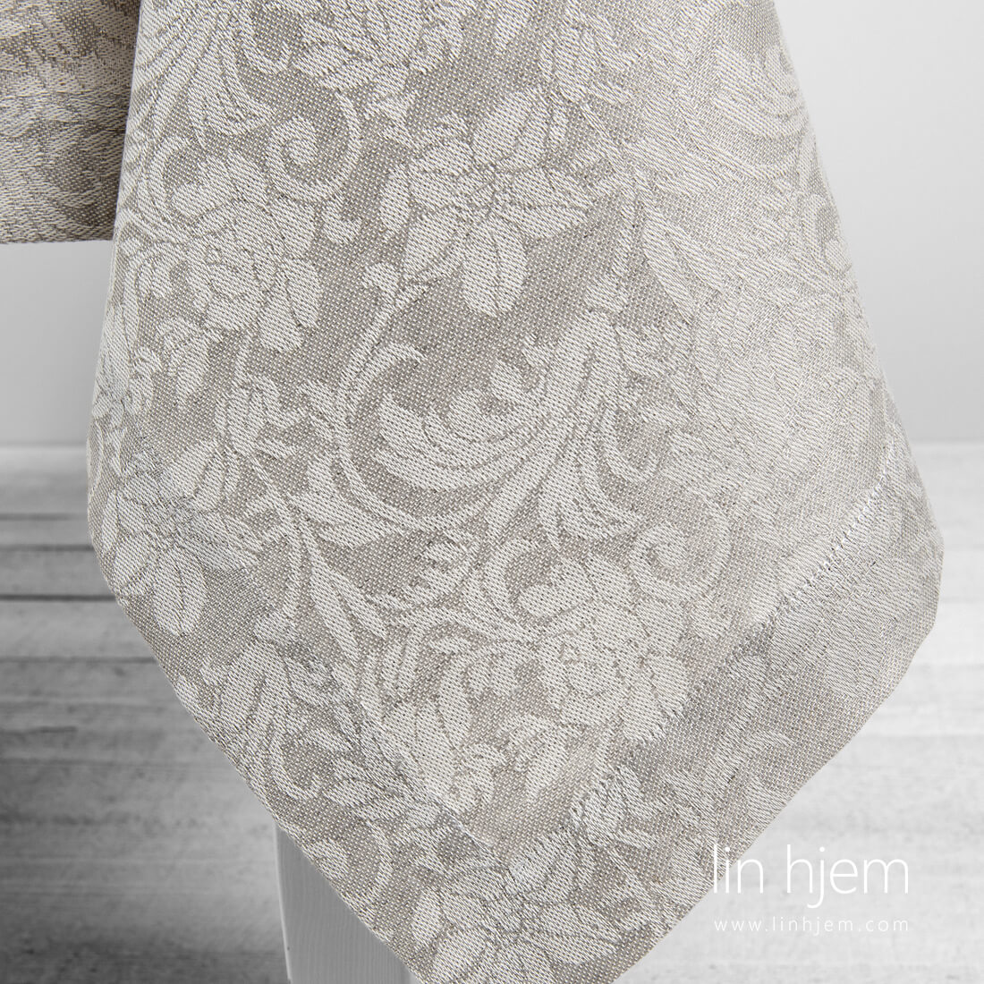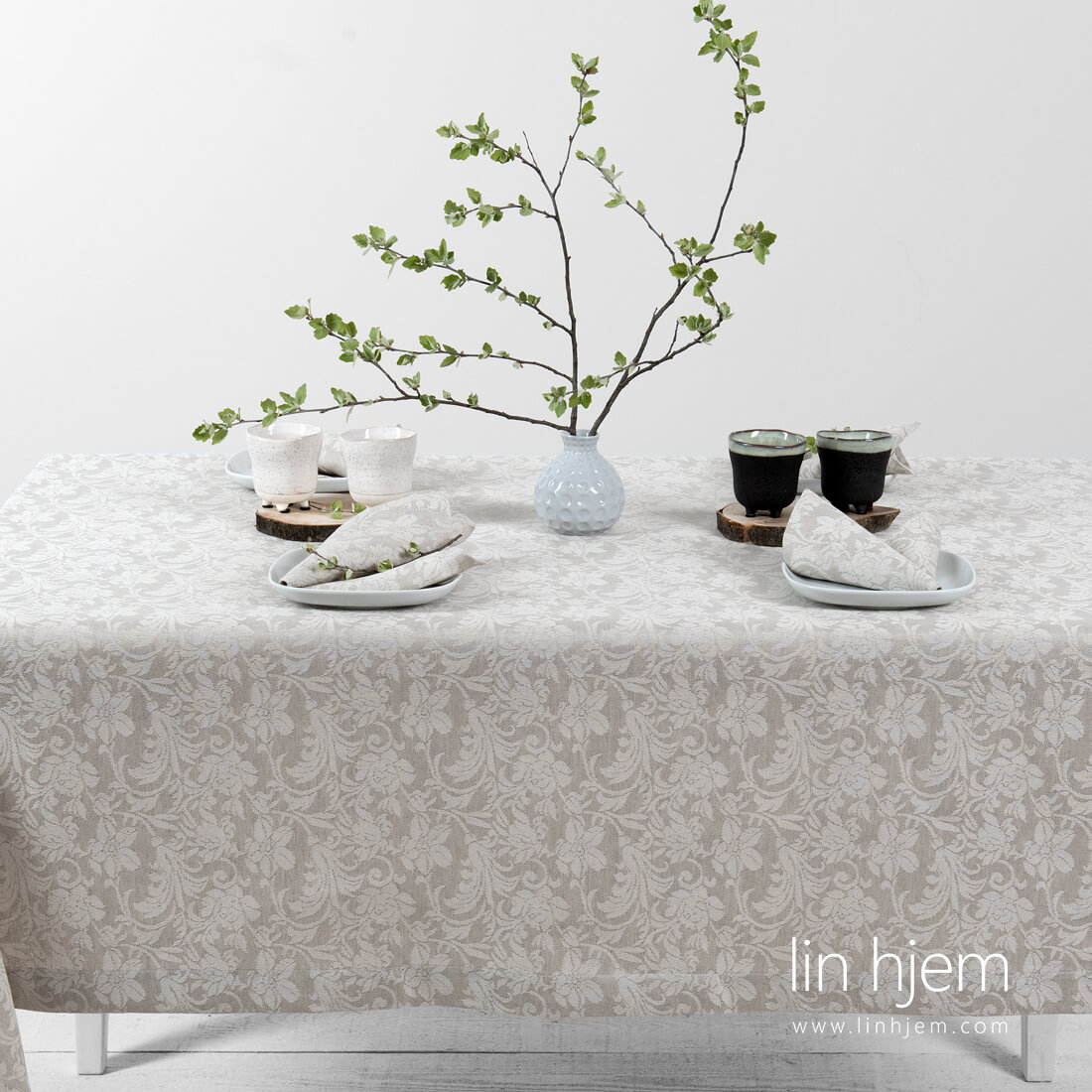Grå linduk med blomster mønster vevd fra grå og hvit farge garn pyntet med blomster mønster. Denne duken med rolige farger vil ikke skuffe deg både under spesielle feiringer og hverdagslunsj. Våre duker med samme ornamenter og farge passer perfekt til denne duken.