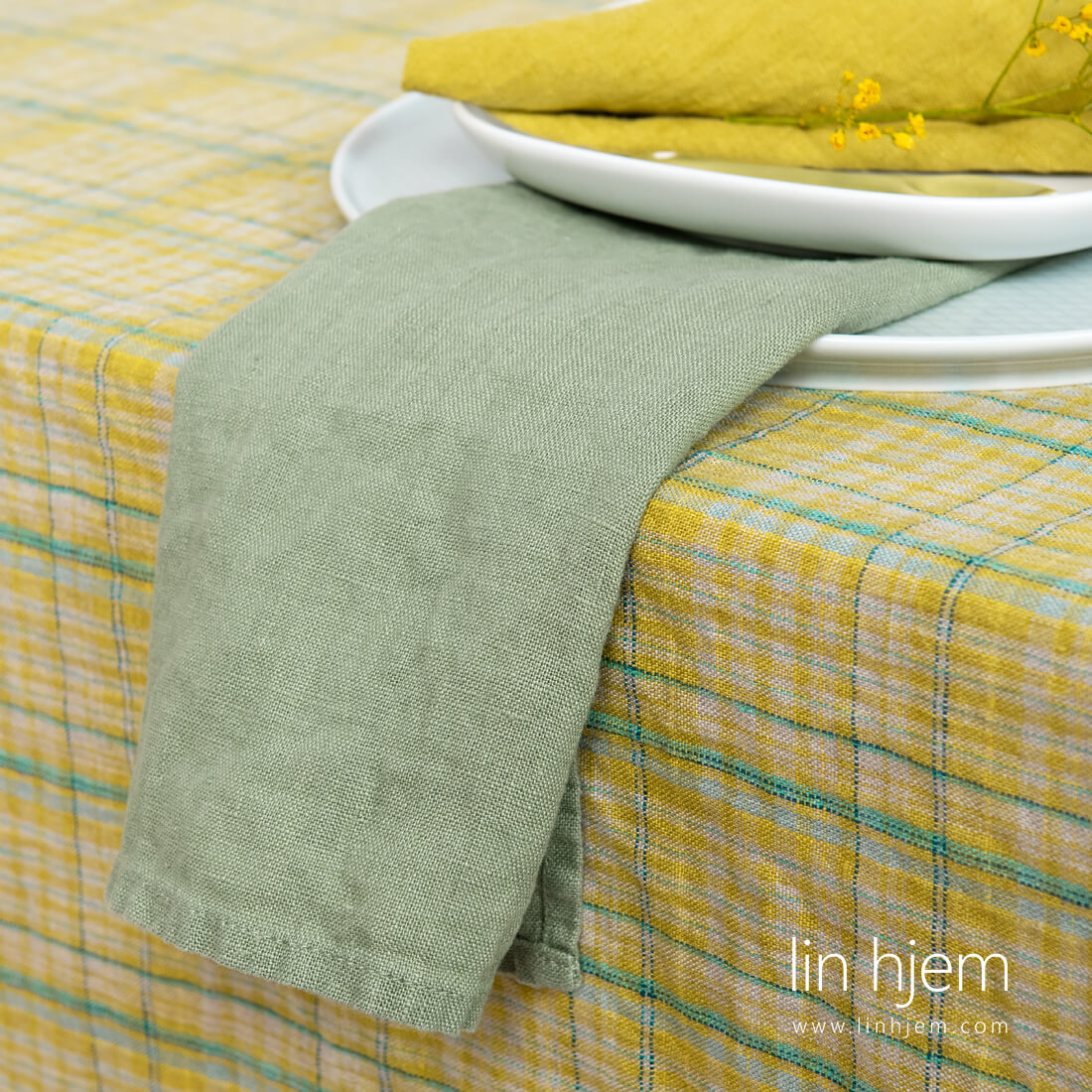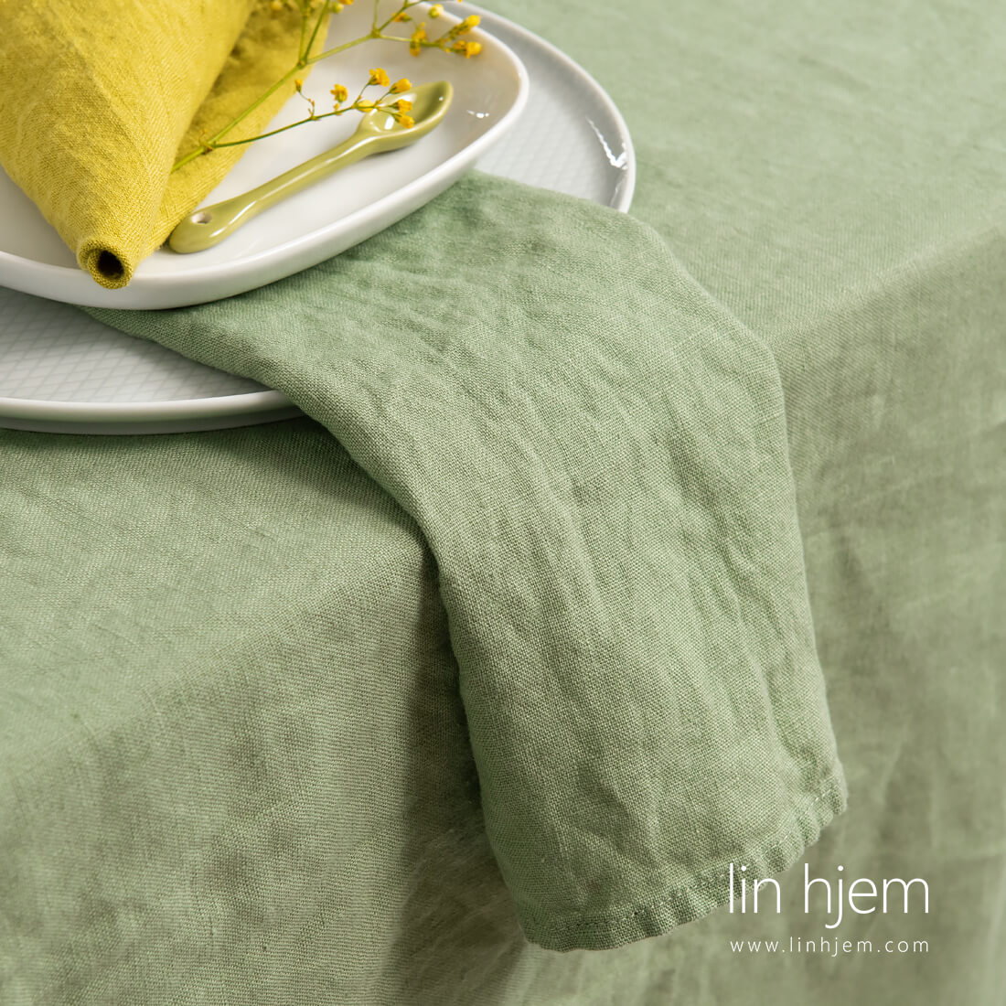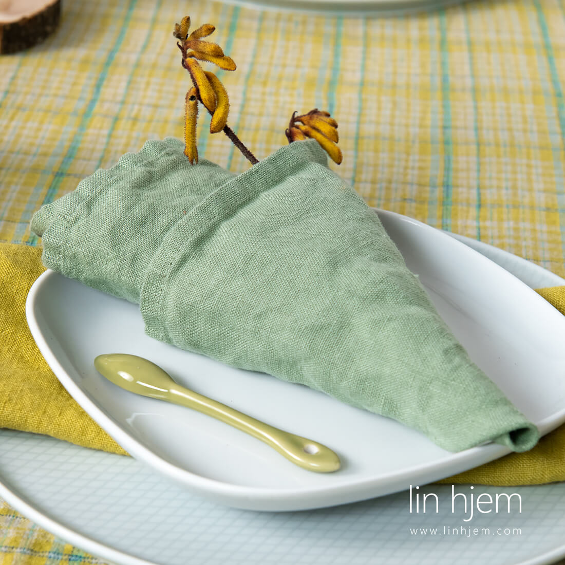 Grønnaktig serviett i vasket lin. Overflaten er litt rynkete fordi produktet er spesielt vasket. Veldig praktisk, tidsbesparende. Sjekk også våre duker av samme stoff og pynt ditt spisebord men en rolig, subtil farge.
