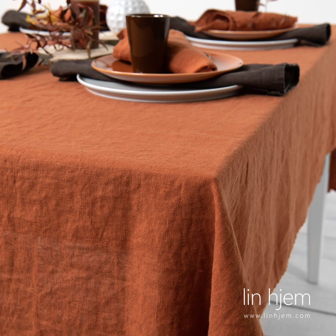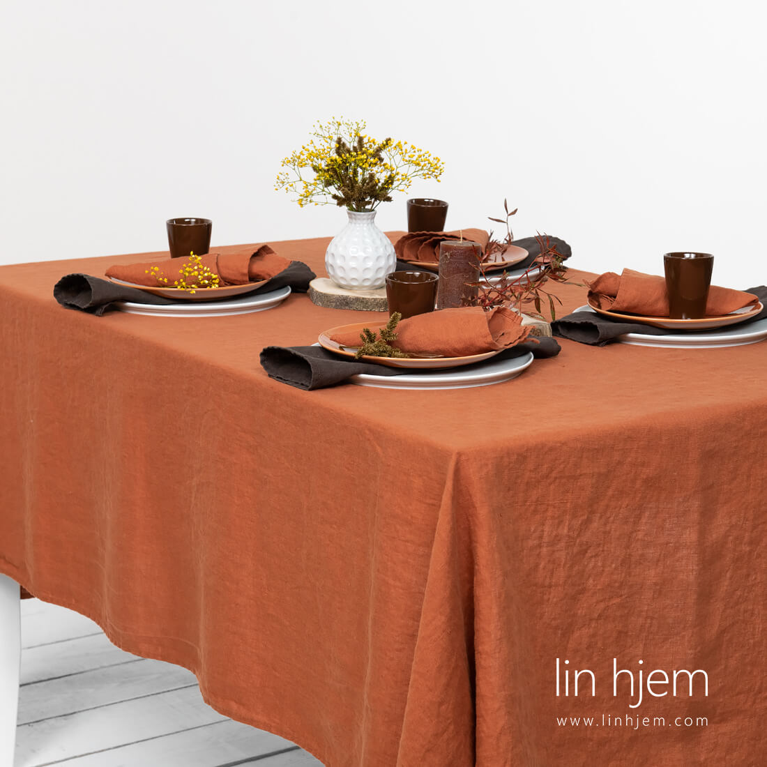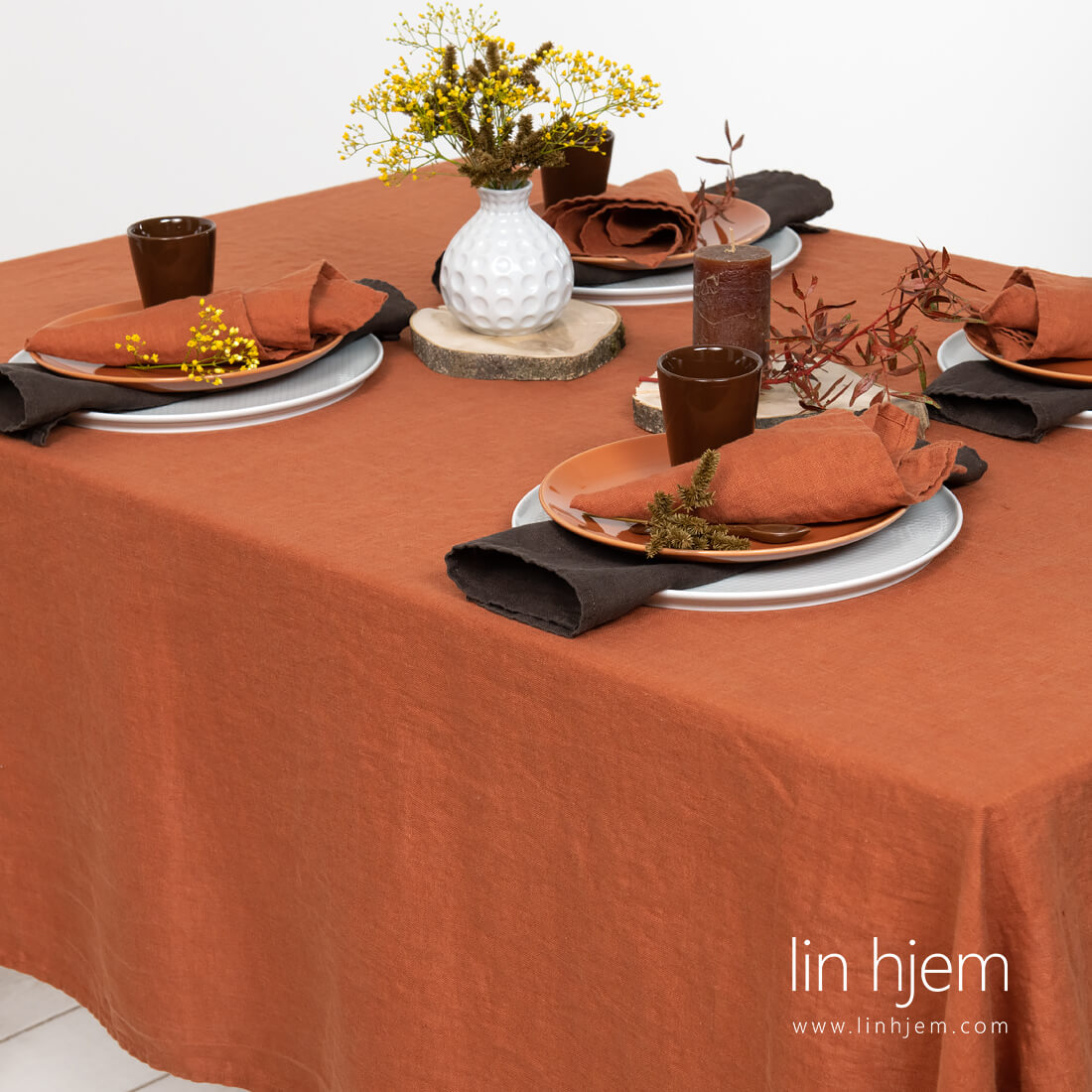 Mørk oransje duk i vasket lin. Stoffet har litt brunaktig rød farge i seg. Ved denne duken kan kombineres mørke oransje, lyseoransje og brune servietter. Våre produkter er enkelt tilgjengelig i nettbutikken vår. Kombiner våre linprodukter til spisebord og skap en fargerik leken stemning i spiserommet.