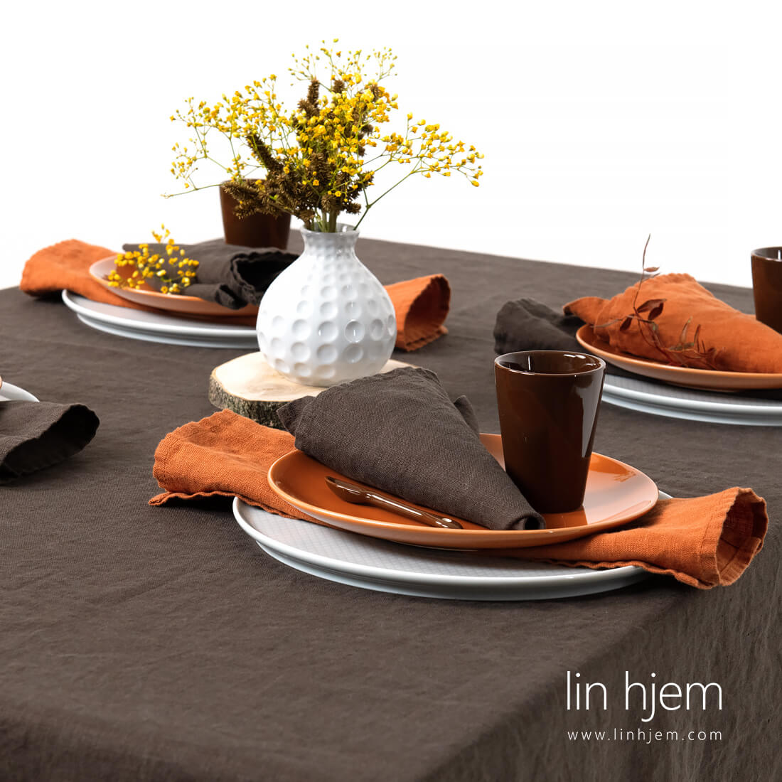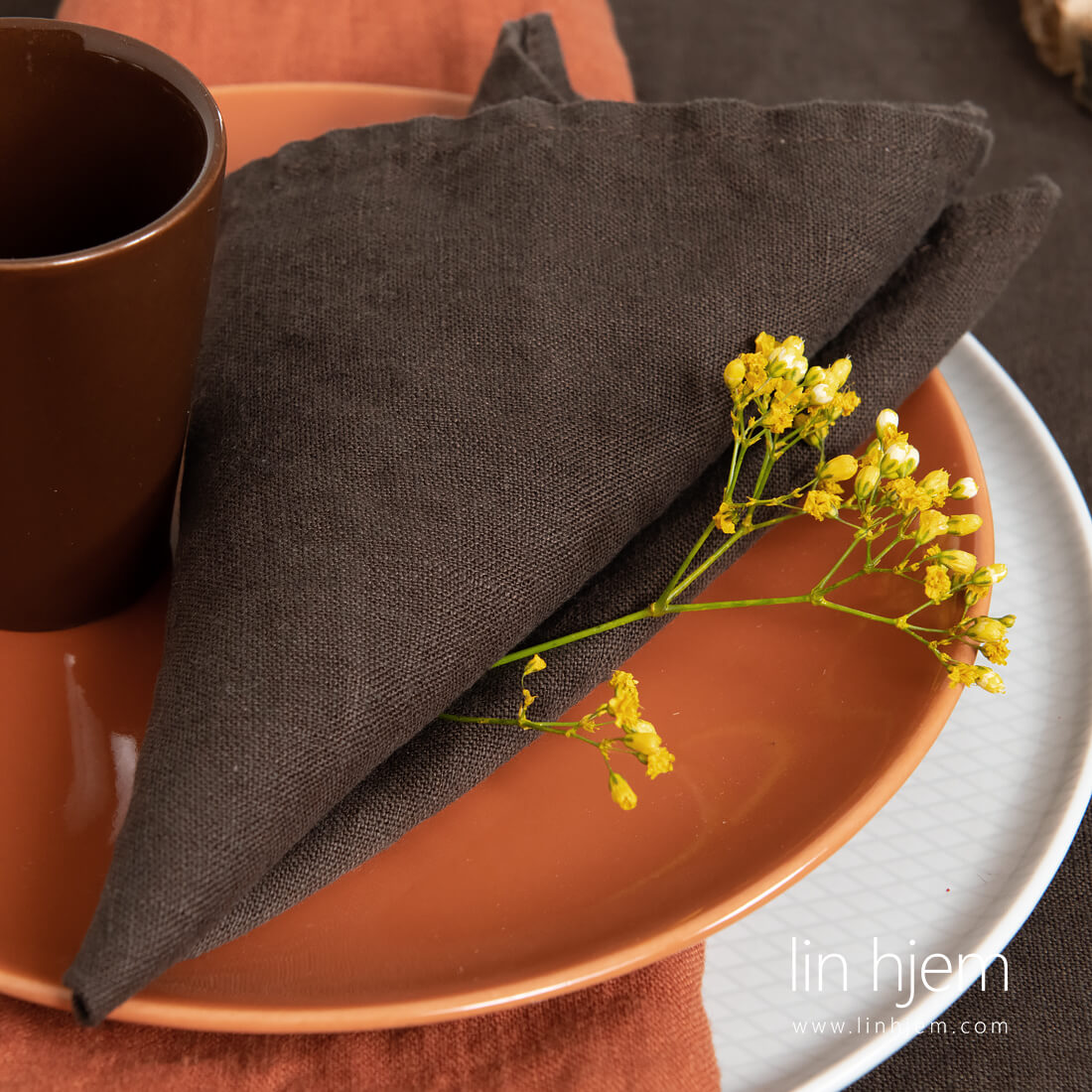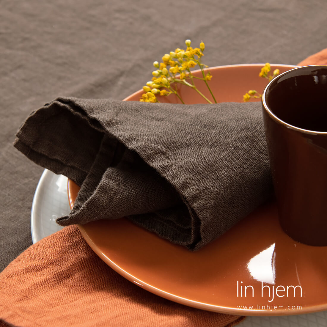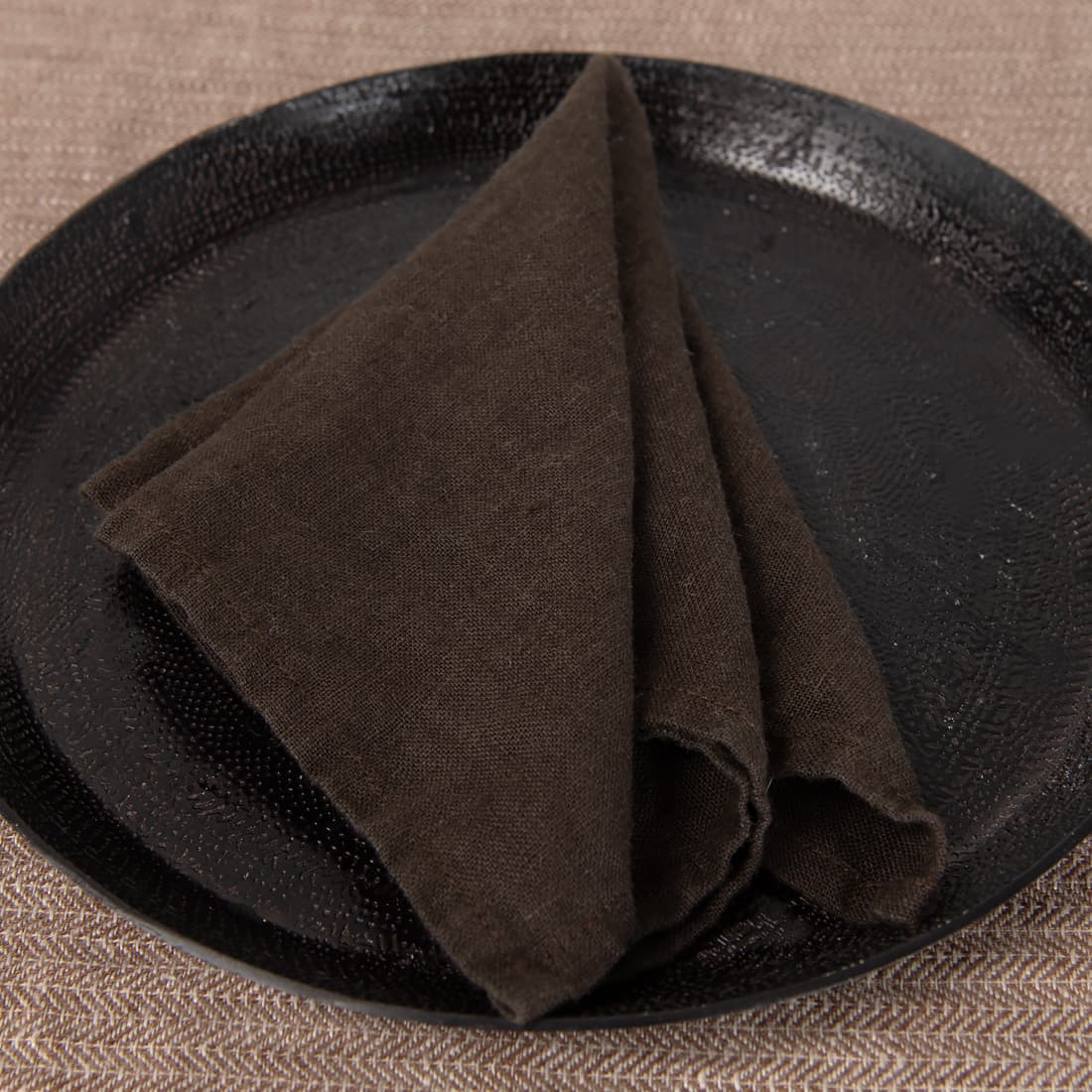 Mørkebrun serviett i vasket lin. Passer best men en 100% lin duk laget av samme stoff og som er spesiell vasket. Disse serviettene ser fantastisk ut på tremøbler.