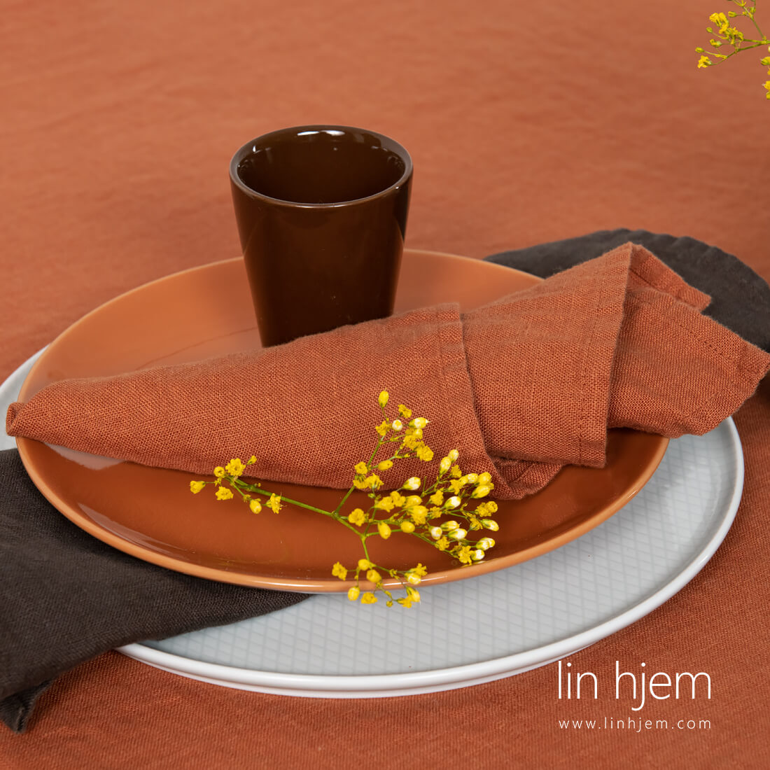 Mørkeoransje serviett i vasket lin. Stoffet har litt brunaktig rød farge i seg. Veldig myk vasket lin må ikke strykes. Linservietter i denne fargen passer til mørkeoransje eller brun linduk.