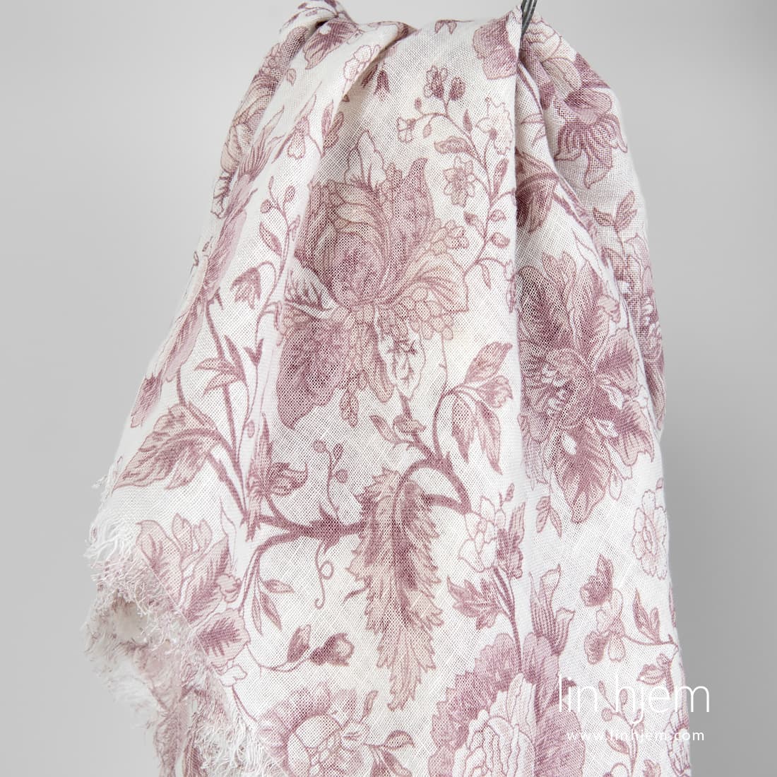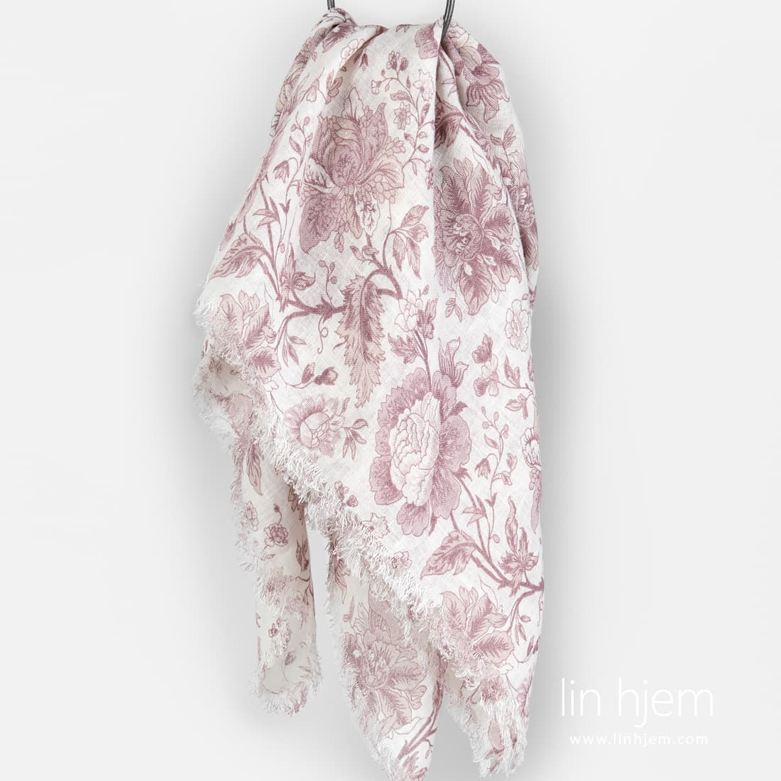 Hvitt linskjerf med rødaktige blomster laget av mykt, skånsomt og spesielt vasket linstoff. Dekorert med fine frynser på kortsidene. Behagelig mot huden og nydelig skjerf som passer perfekt for sommer/vår sesongen.